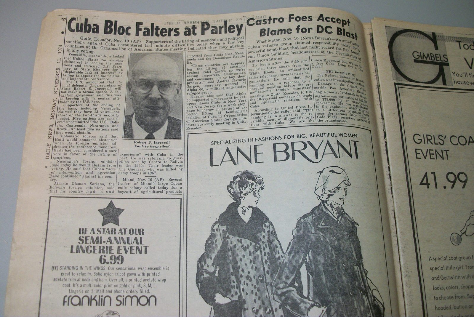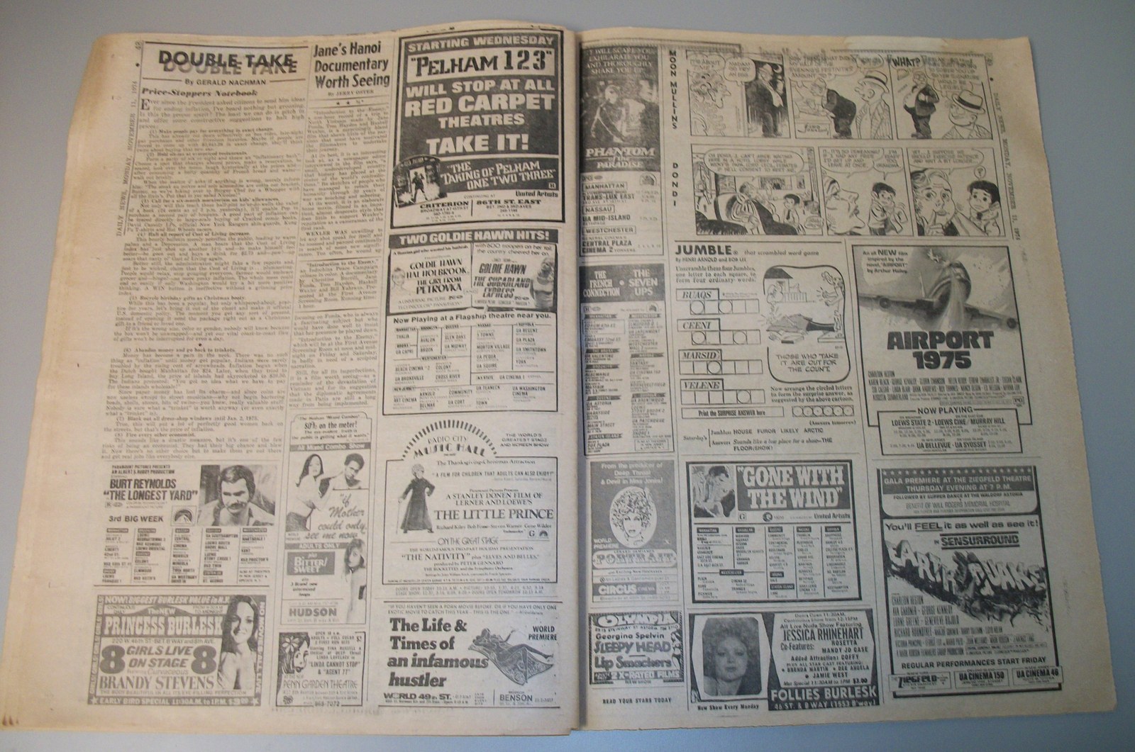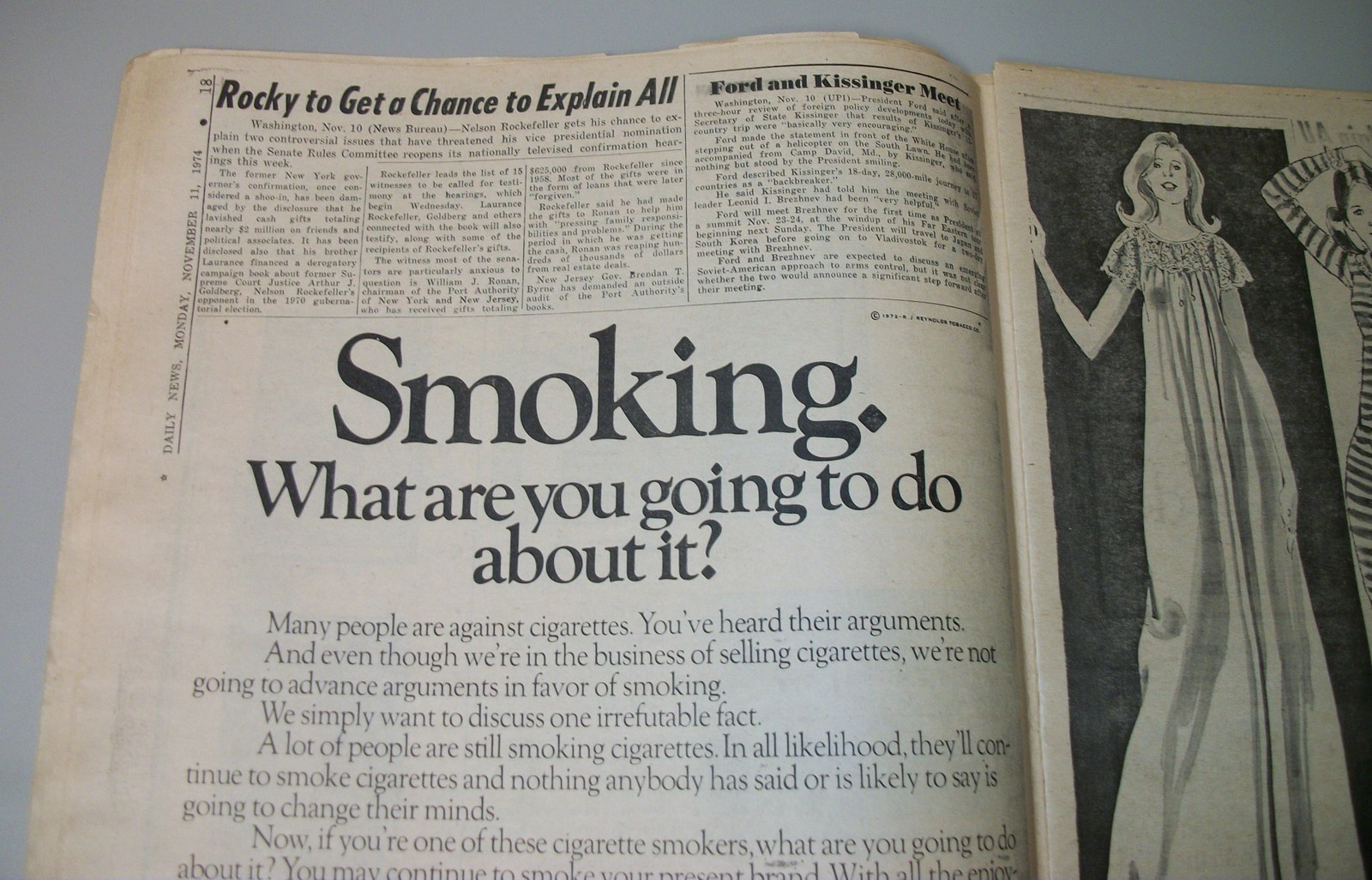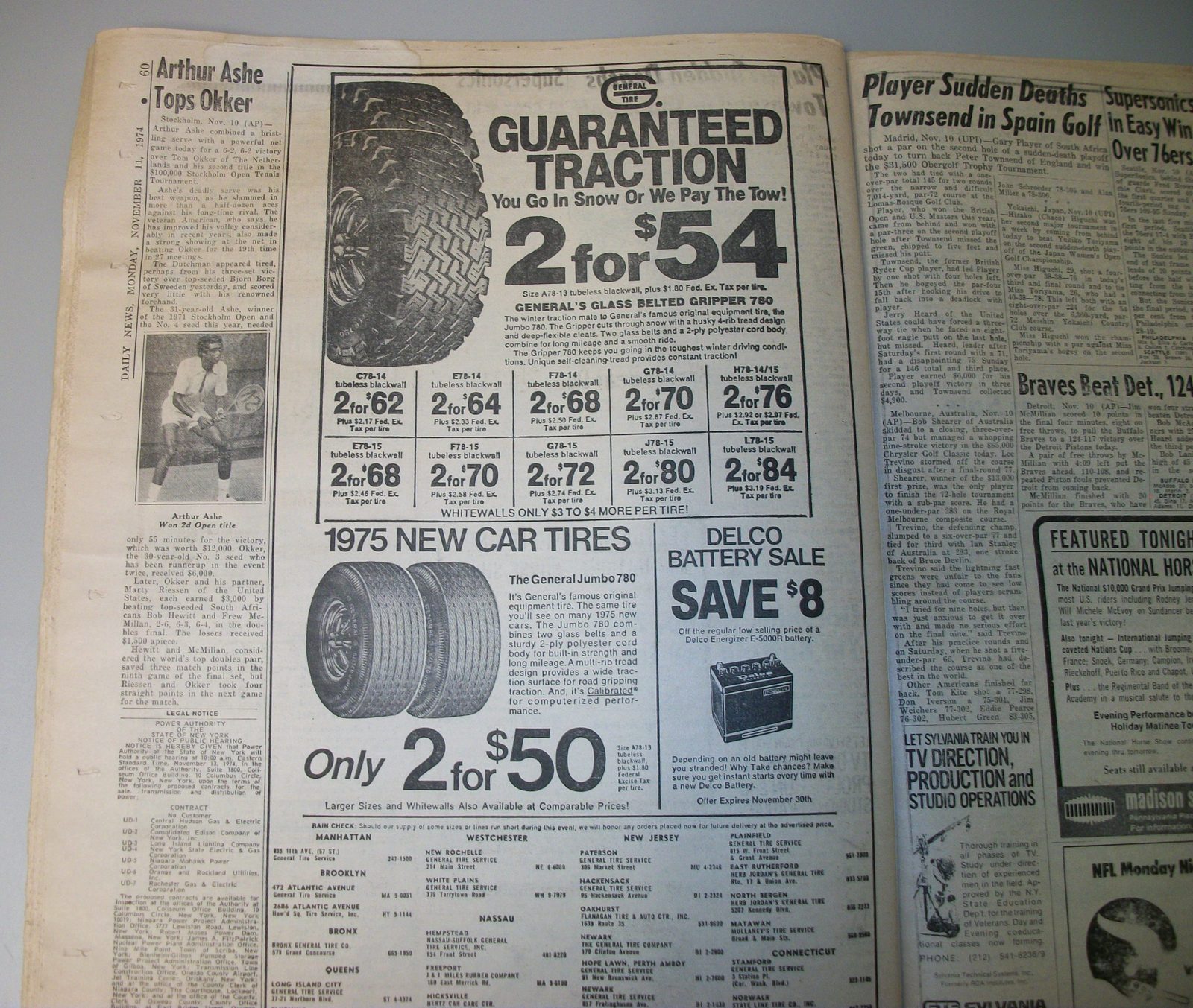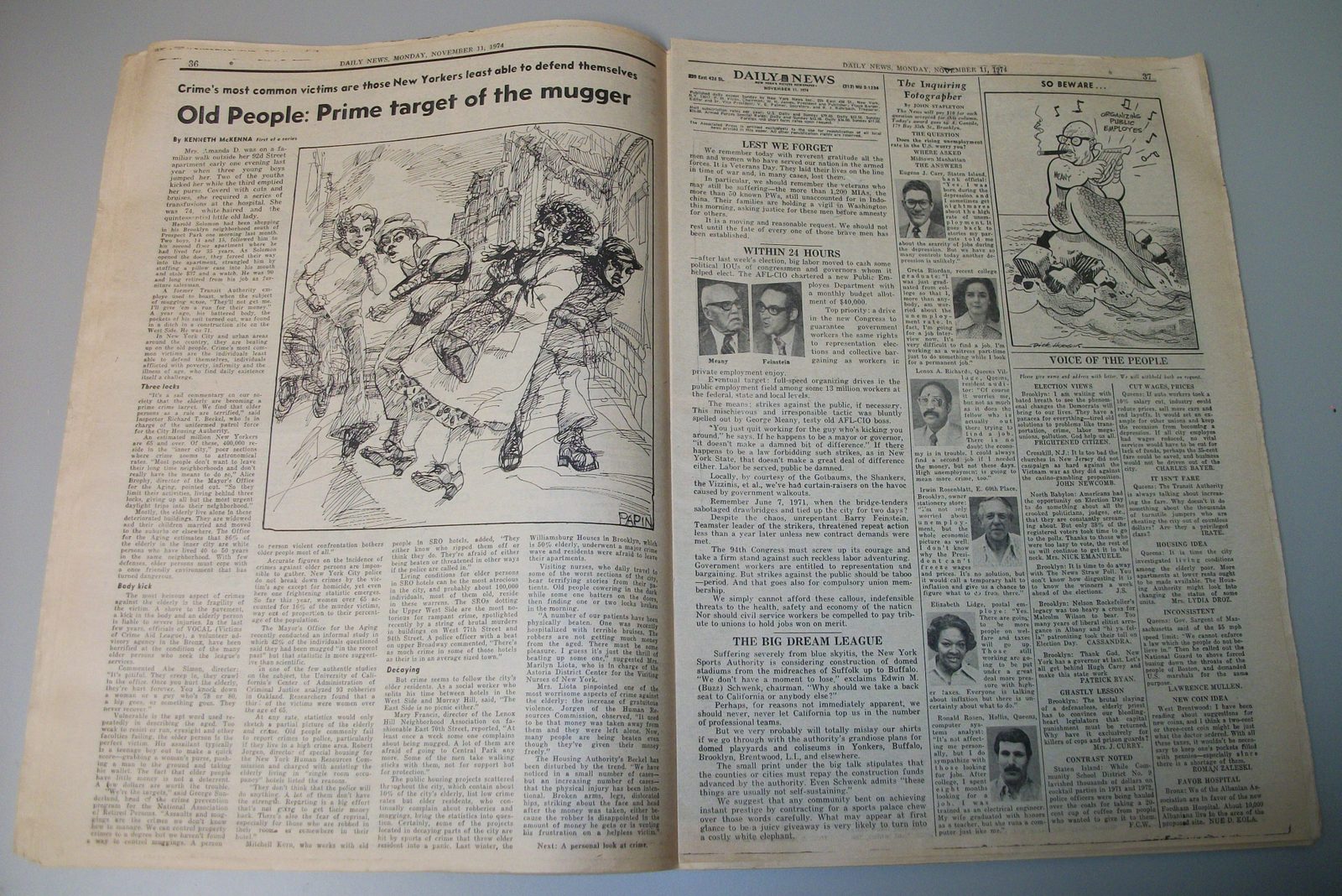 New York Daily News (New Jersey) – Monday November 11, 1974. What you see in the pictures is what you get. This is a very interesting old newspaper which features as the front page stories: PRICE HIKES STIR ISRAELI RIOTS | N.J. Curfew Laws Under Fire | Joe (Namath) Beats Giants With Arm, Lega(!). The sports section features coverage of professional football. 76 Pages.