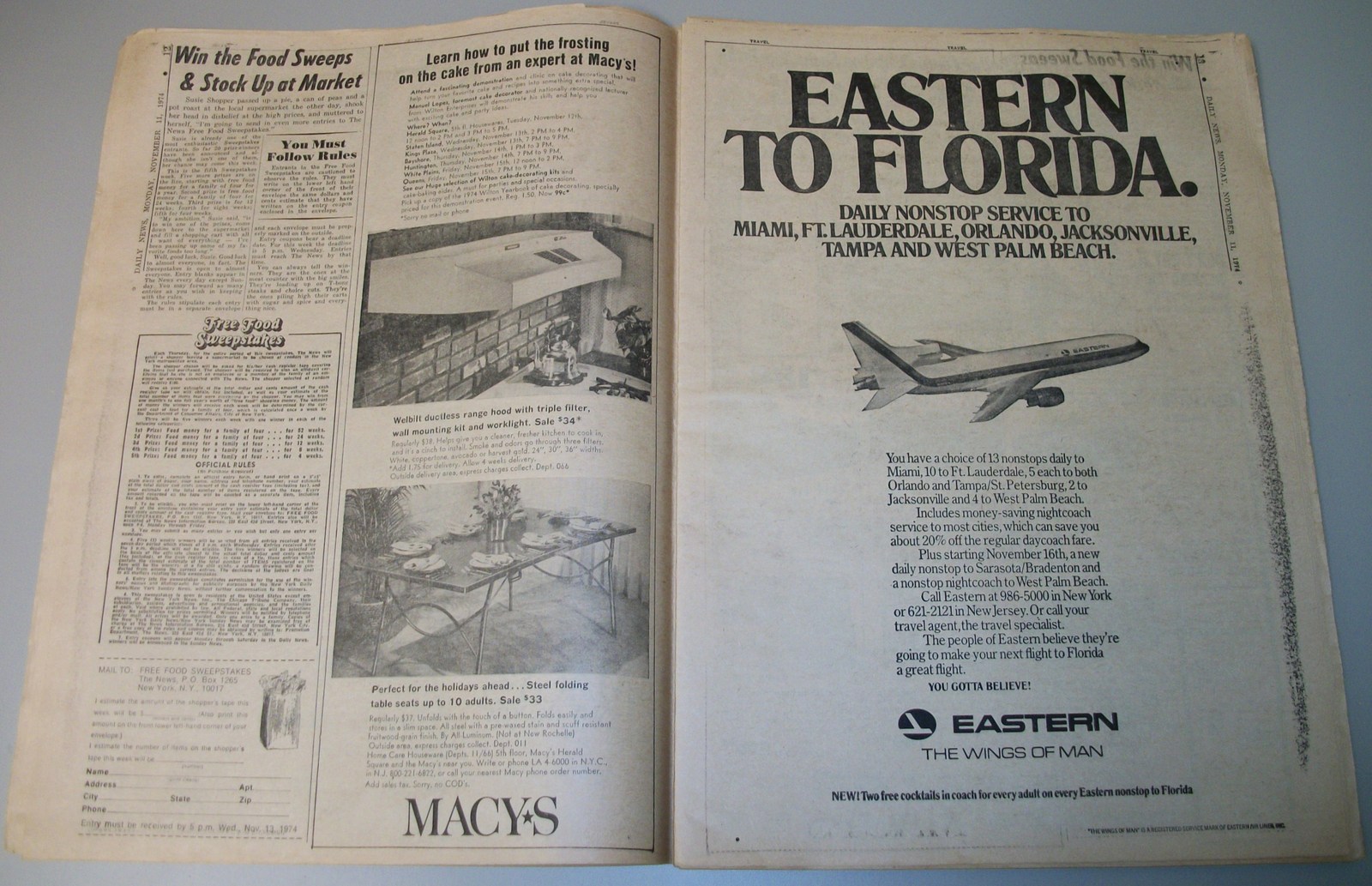 - A Full Page Ad for Daily Nonstop service on Eastern Airlines to Florida with a picture of an Eastern Airlines L-1011