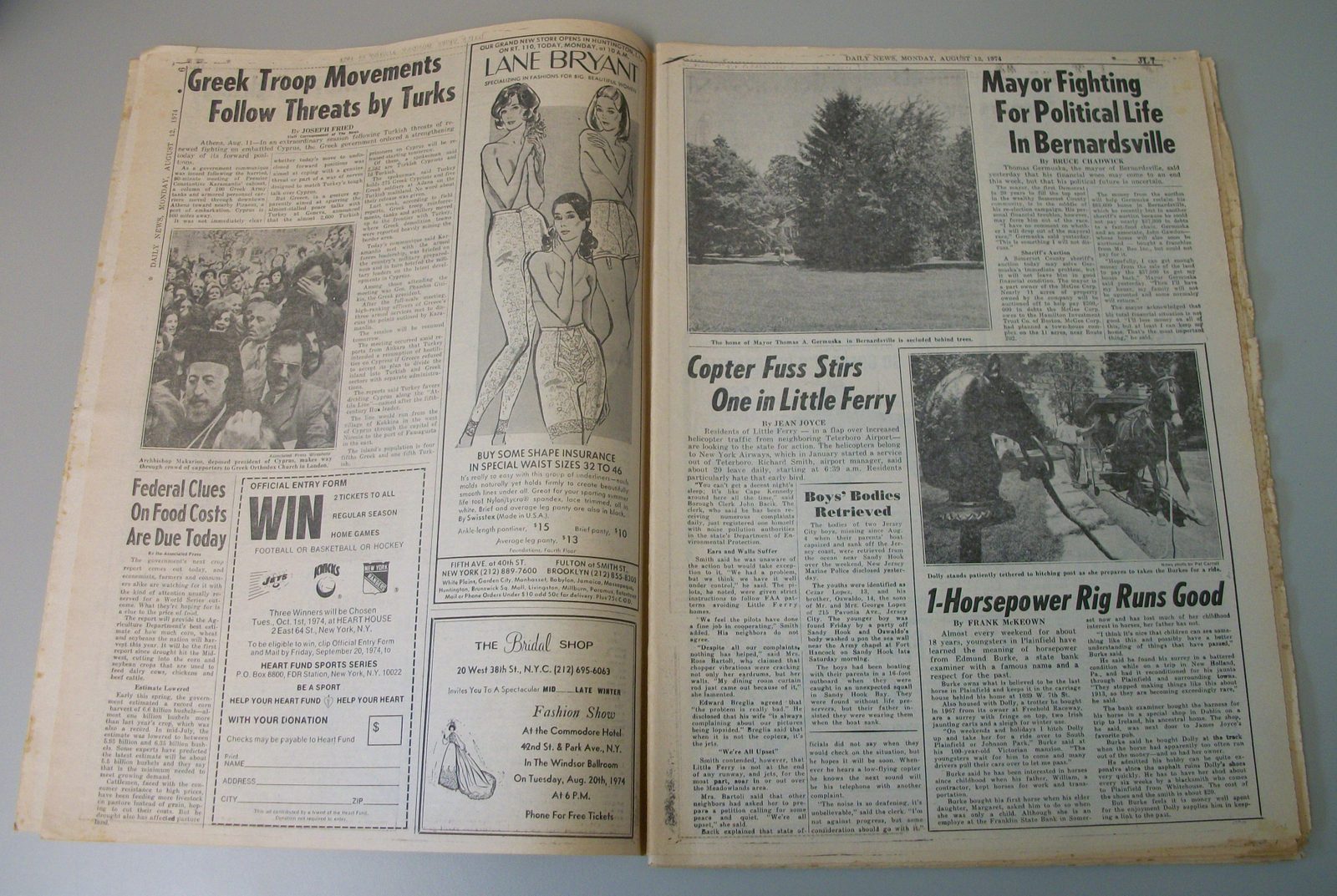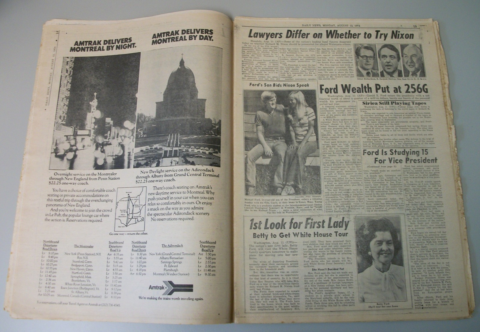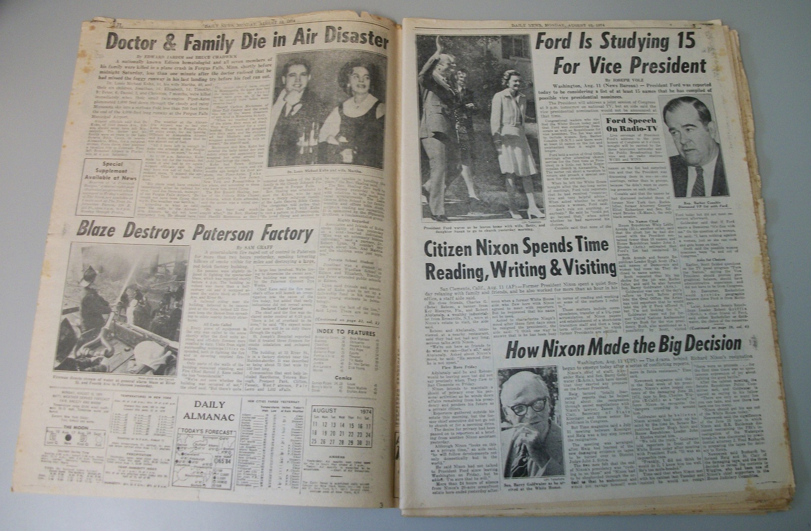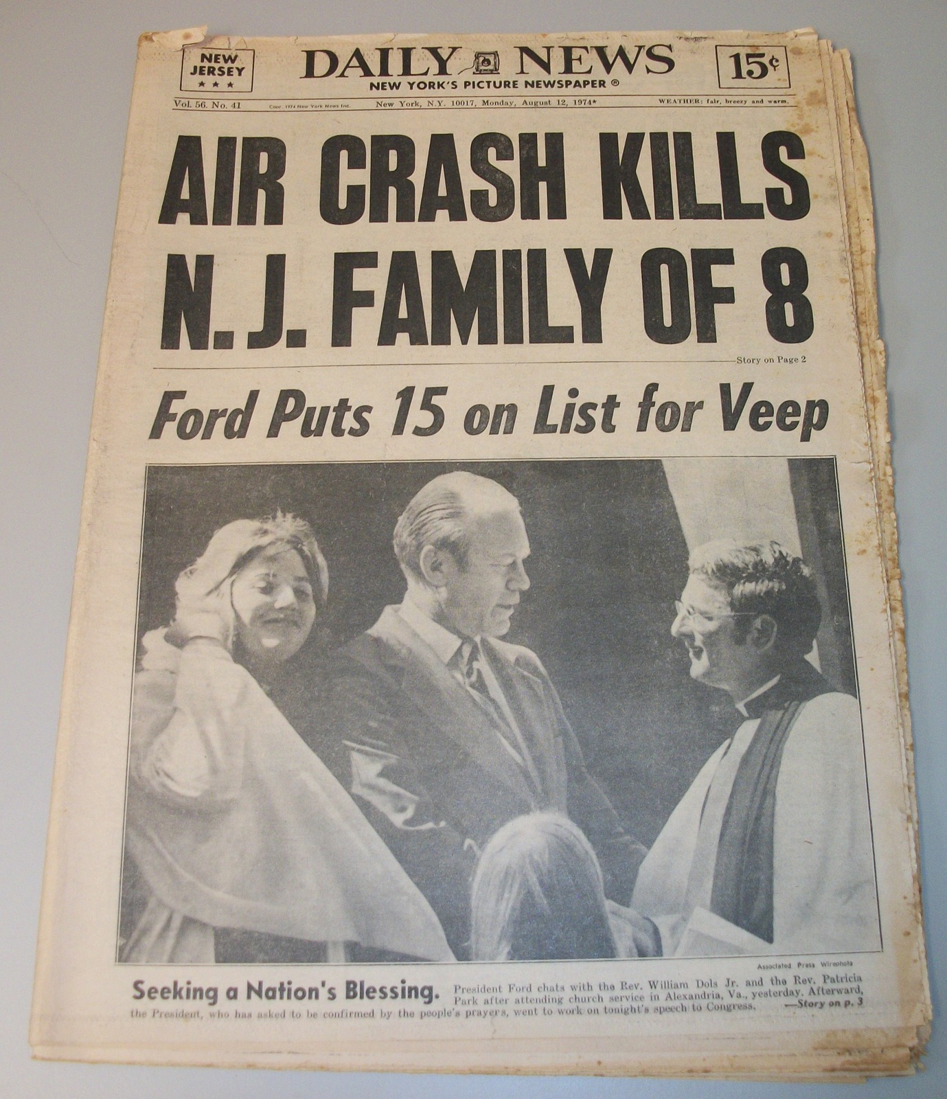 New York Daily News – Monday August 12, 1974 What you see in the pictures is what you get: all 72 pages are included. There is some wear around the edges – LOOK AT THE PICTURES! This is a very interesting old newspaper which features as the front page story: AIR CRASH KILLS N.J. FAMILY OF 8, Ford Puts 15 on List for Veep – Some of the contents include: