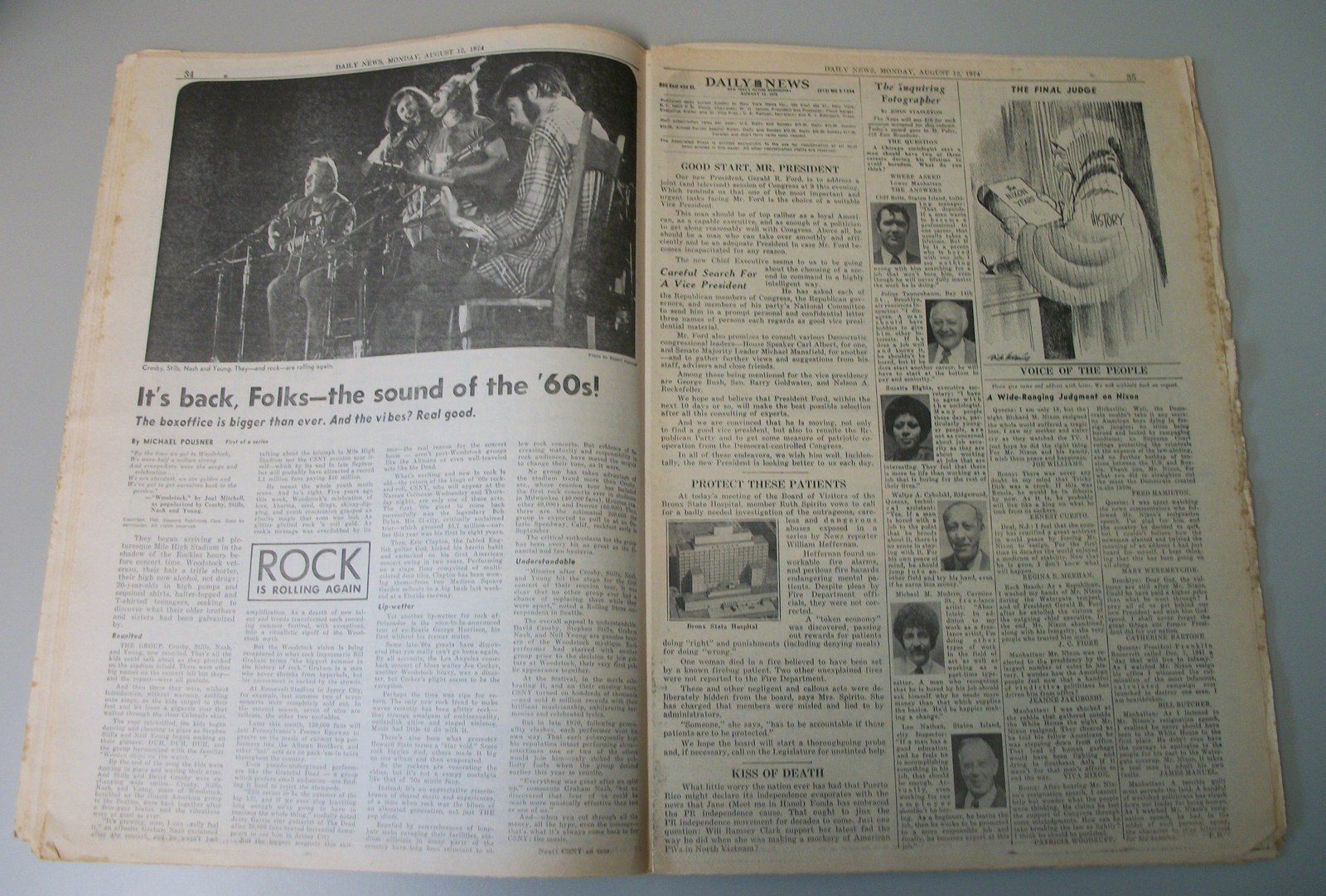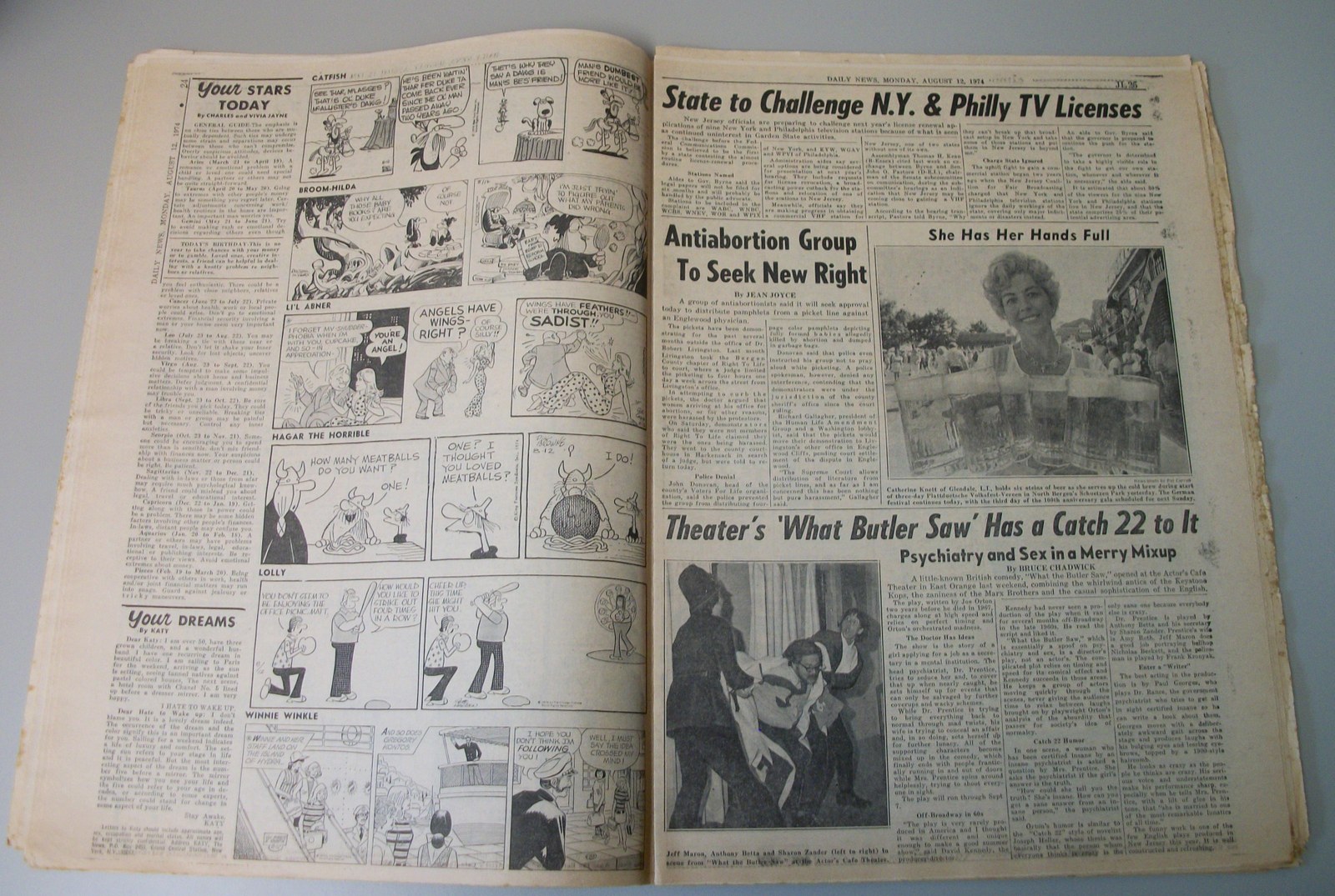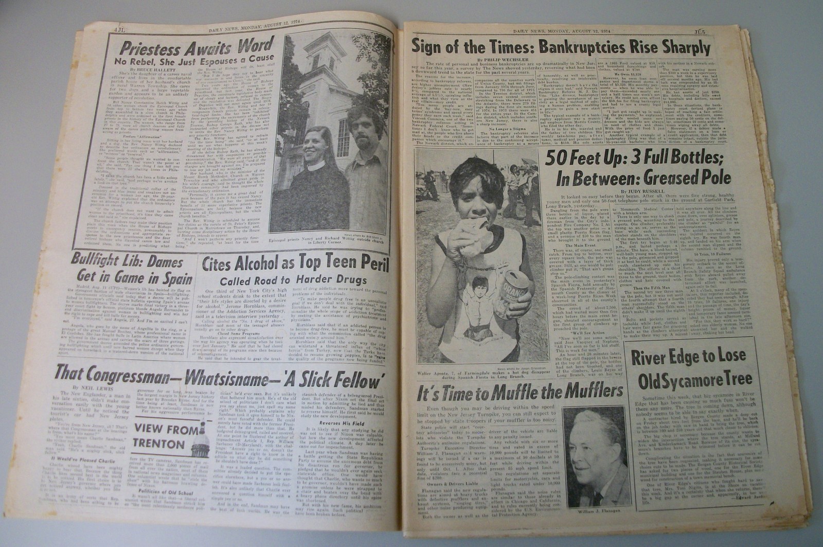 New York Daily News – Monday August 12, 1974 What you see in the pictures is what you get: all 72 pages are included. There is some wear around the edges – LOOK AT THE PICTURES! This is a very interesting old newspaper which features as the front page story: AIR CRASH KILLS N.J. FAMILY OF 8, Ford Puts 15 on List for Veep – Some of the contents include: