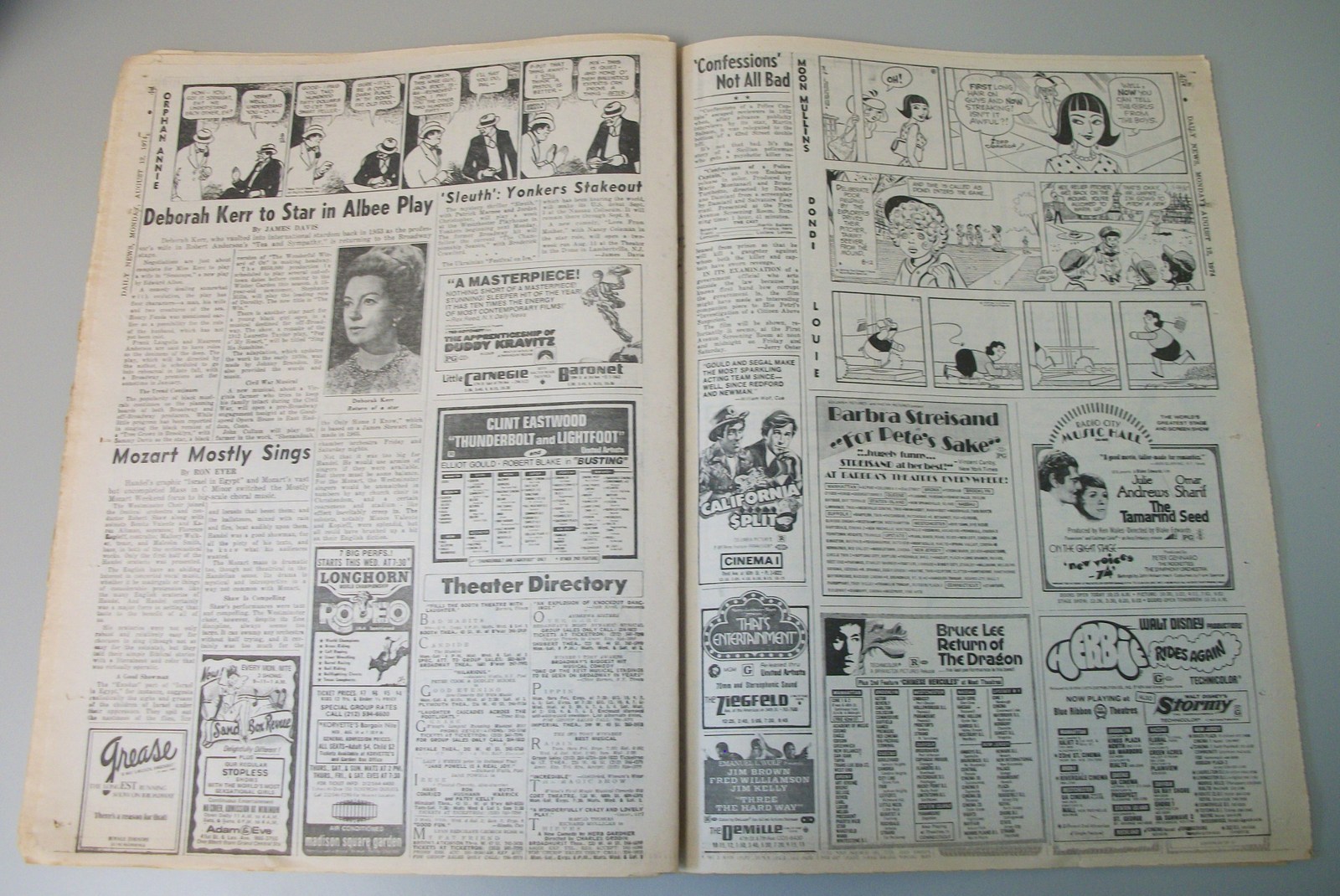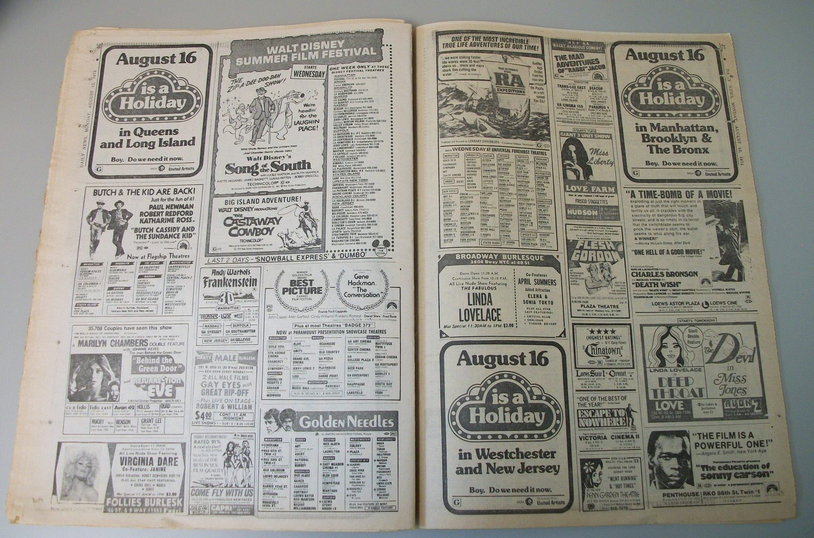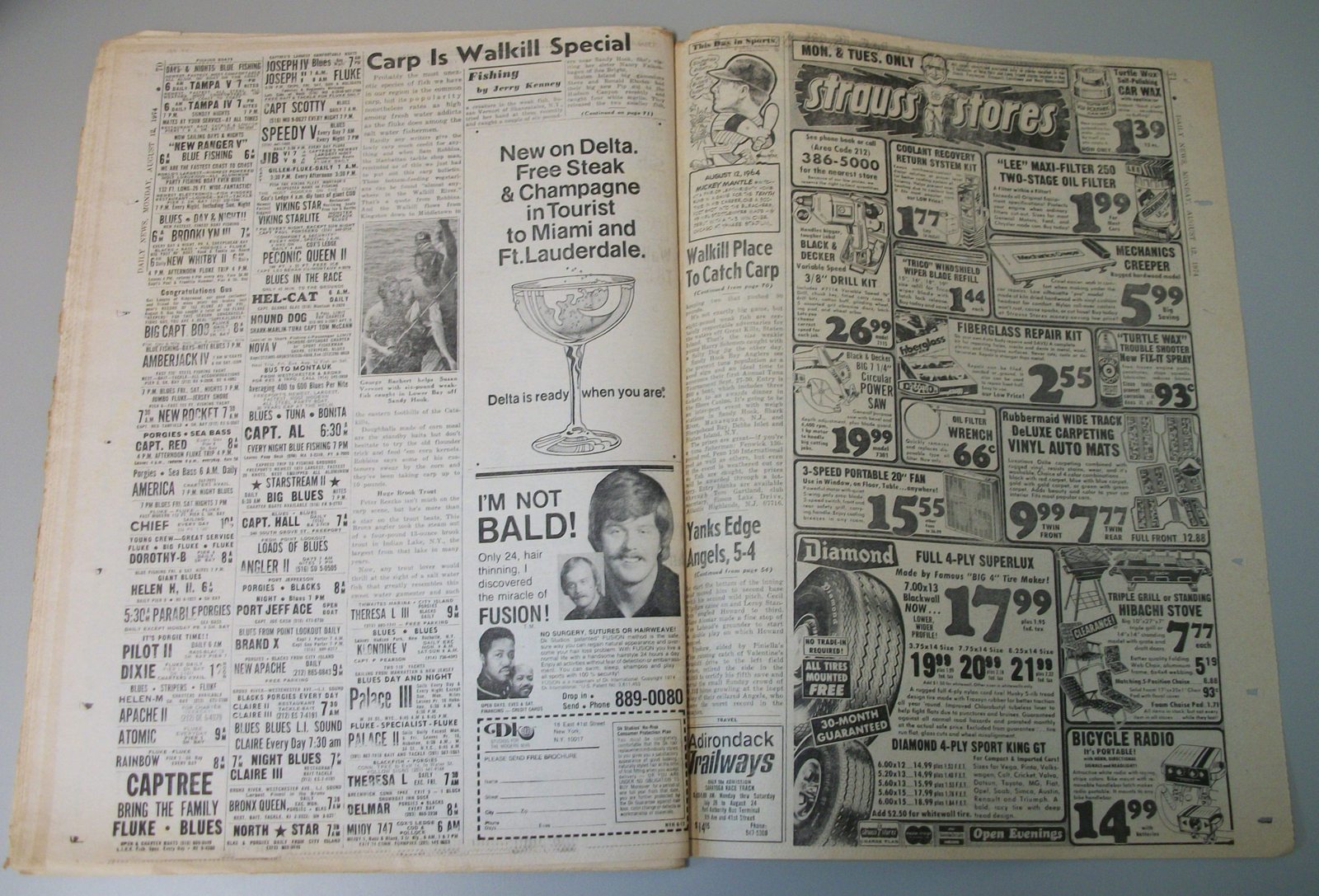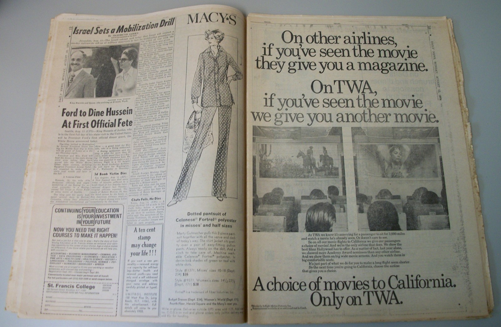 New York Daily News – Monday August 12, 1974 What you see in the pictures is what you get: all 72 pages are included. There is some wear around the edges – LOOK AT THE PICTURES! This is a very interesting old newspaper which features as the front page story: AIR CRASH KILLS N.J. FAMILY OF 8, Ford Puts 15 on List for Veep – Some of the contents include: