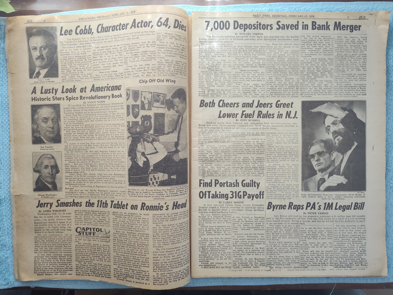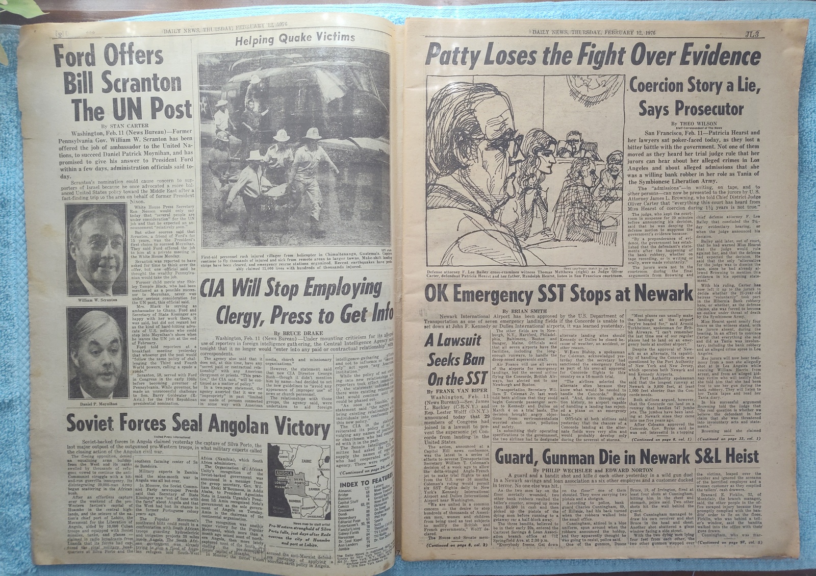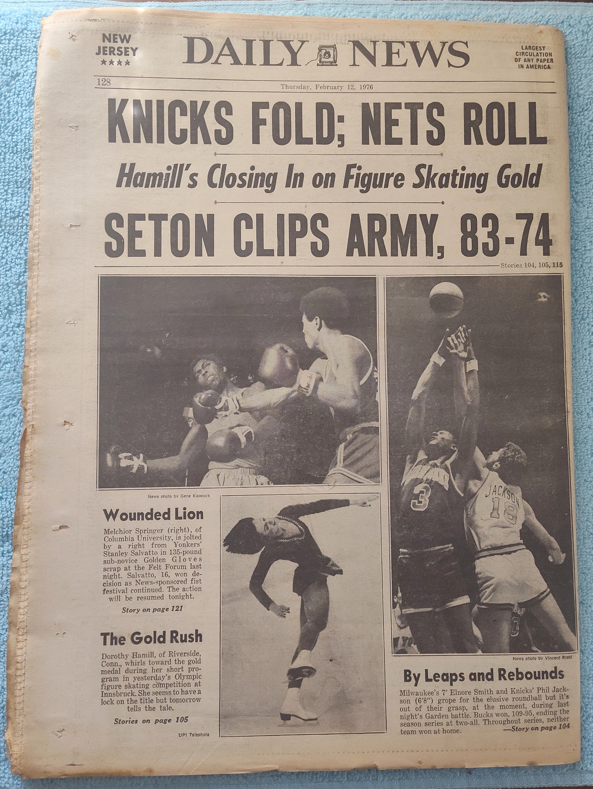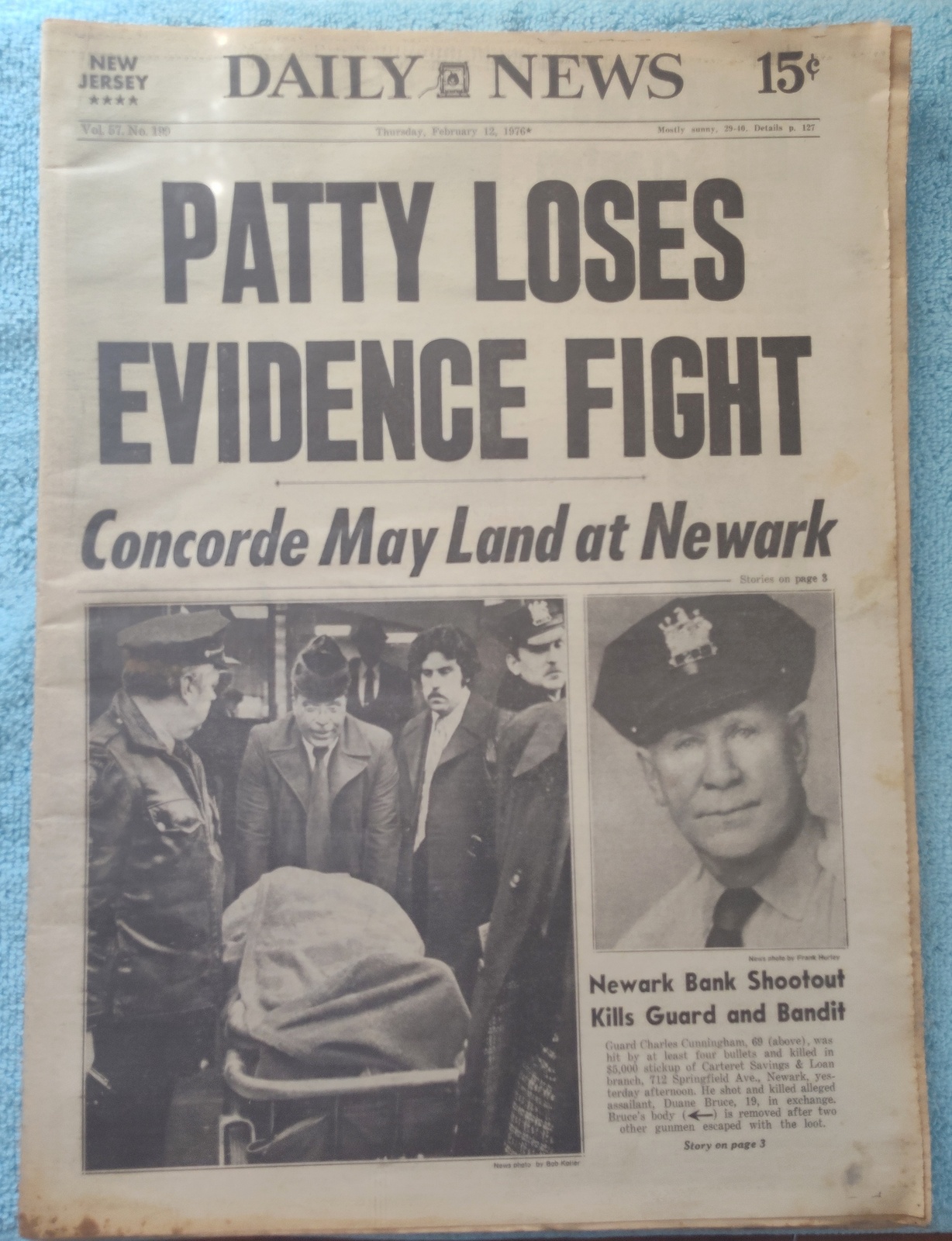 New York Daily News (New Jersey Edition) – Thursday, February 12, 1976. This old newspaper features on the front page a picture of slain security guard Charles Cunningham and the body of one of his assailants from a bank robbery. The headline is: ‘Patty Loses Evidence Fight’ and ‘Concorde May Land at Newark’ – The back page features several pictures: One of upcoming Olympic Gold medal winner Dorothy Hamill, one of Elnore Smith and Phil Jackson in action on the basketball court, and Melchlor Springer and Stanley Salvatto duking it out in the boxing ring. What you see in the pictures is what you get.