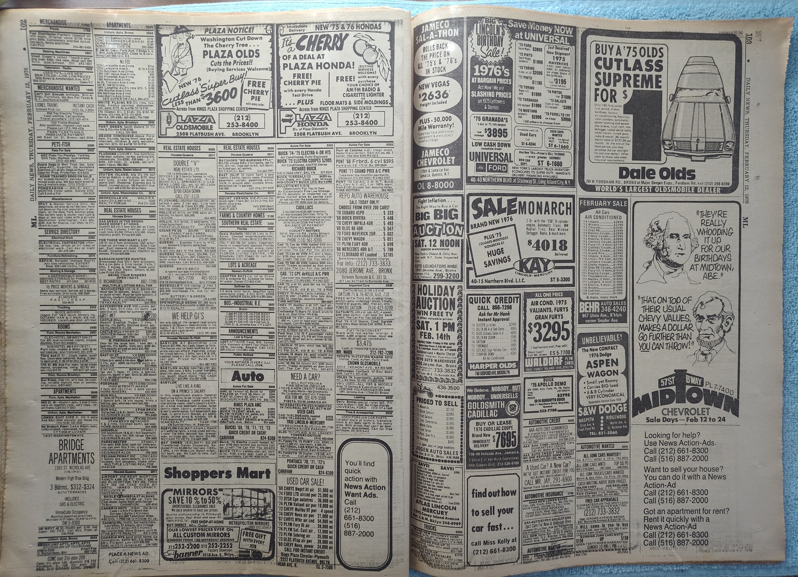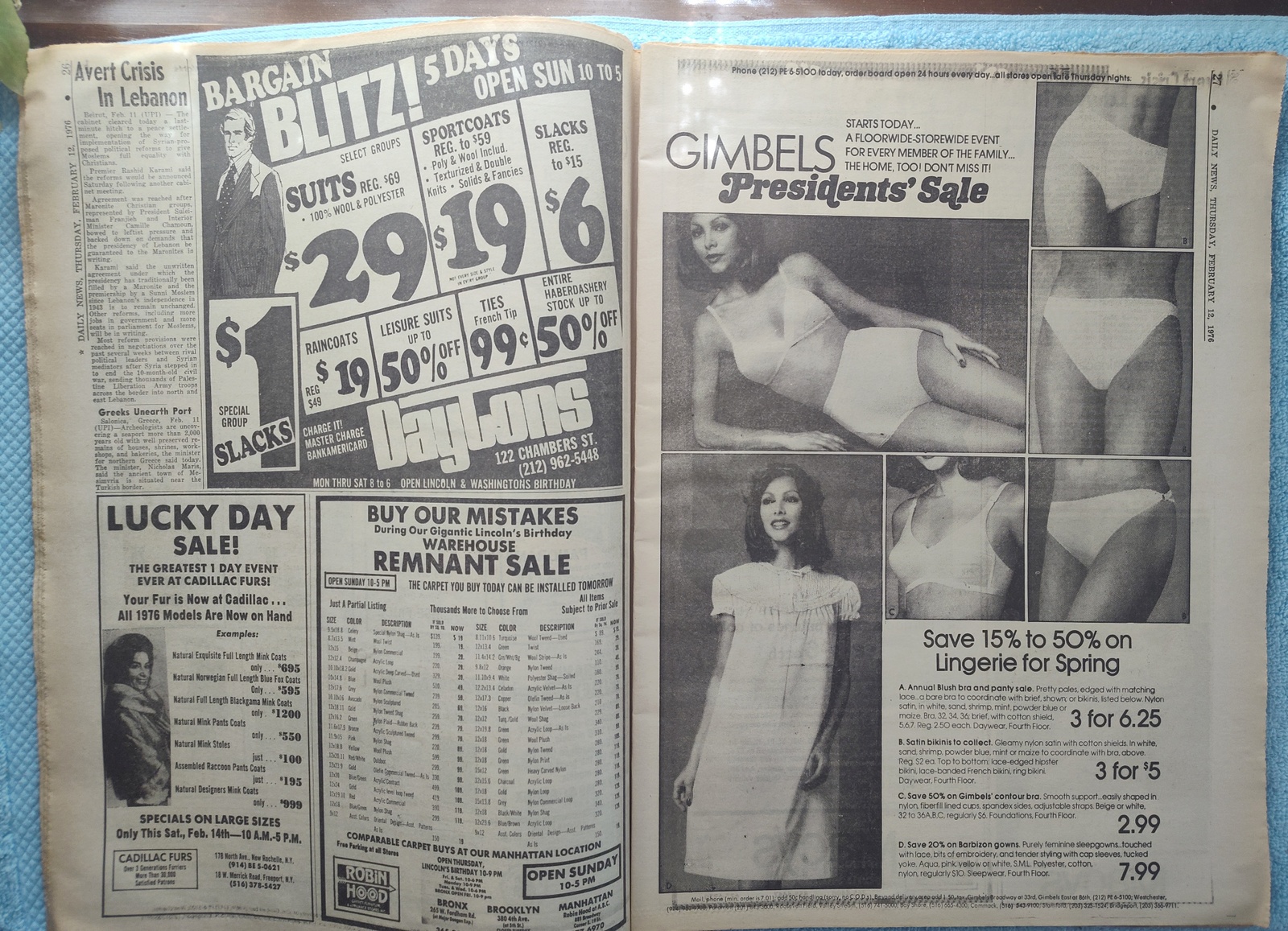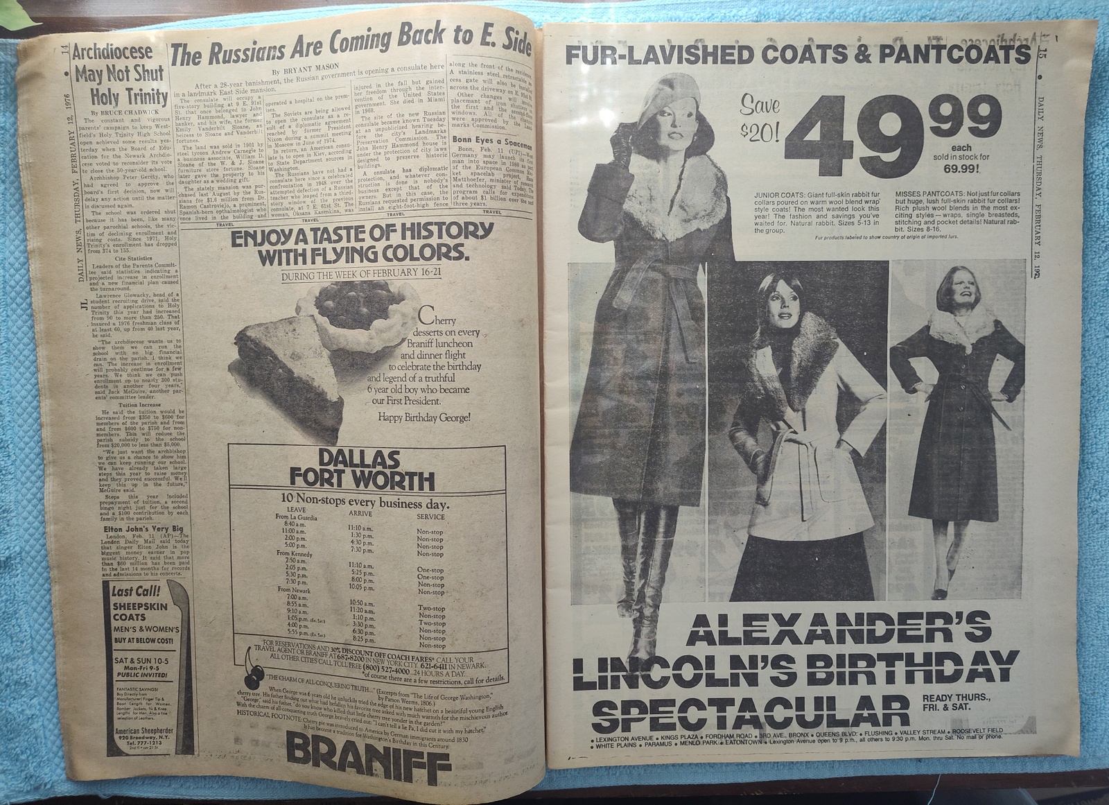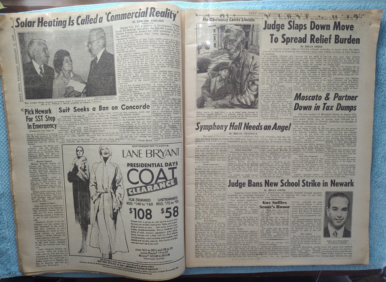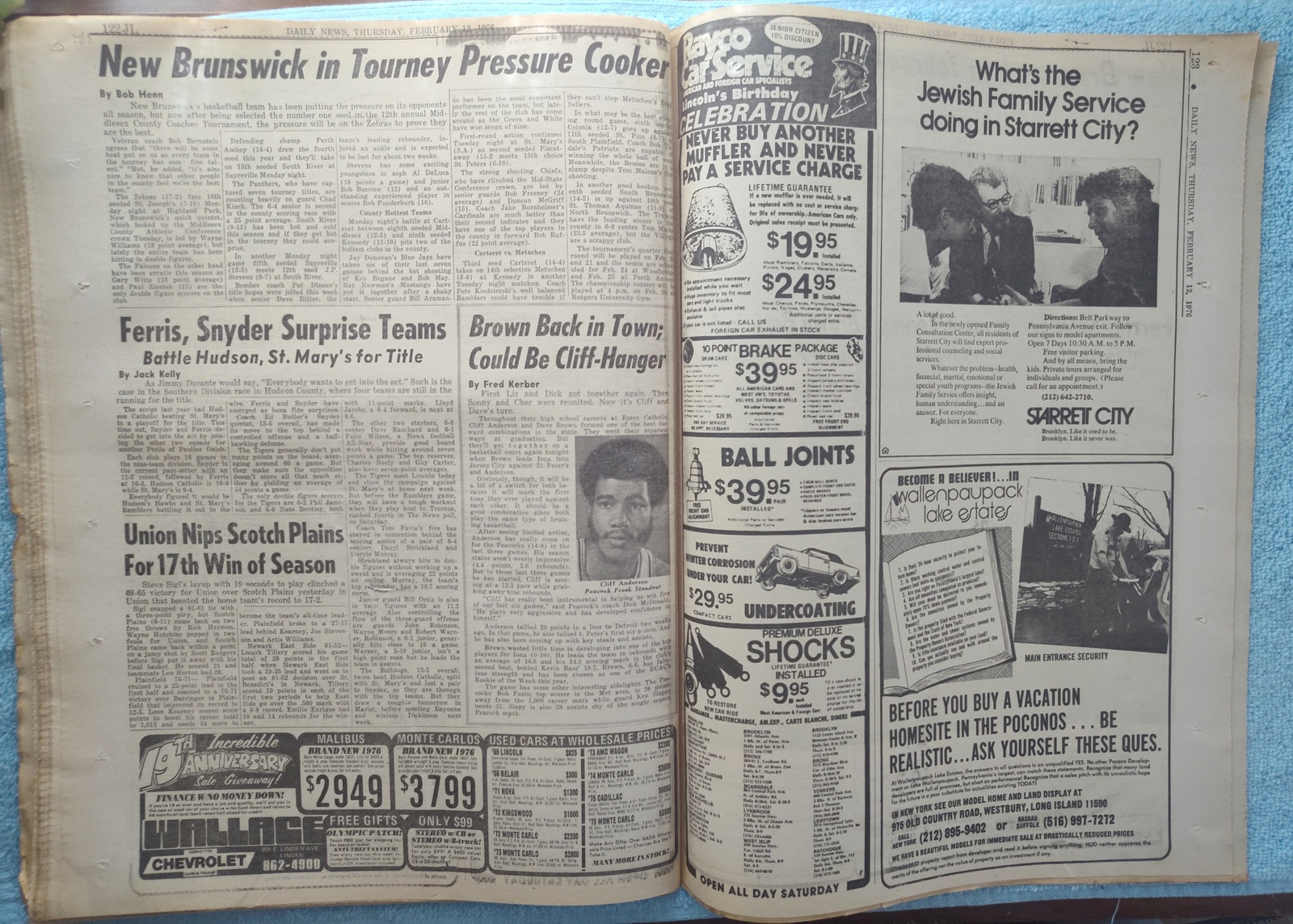 New York Daily News (New Jersey Edition) – Thursday, February 12, 1976. This old newspaper features on the front page a picture of slain security guard Charles Cunningham and the body of one of his assailants from a bank robbery. The headline is: ‘Patty Loses Evidence Fight’ and ‘Concorde May Land at Newark’ – The back page features several pictures: One of upcoming Olympic Gold medal winner Dorothy Hamill, one of Elnore Smith and Phil Jackson in action on the basketball court, and Melchlor Springer and Stanley Salvatto duking it out in the boxing ring. What you see in the pictures is what you get.