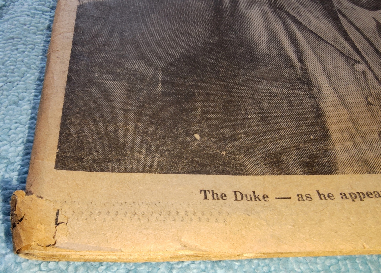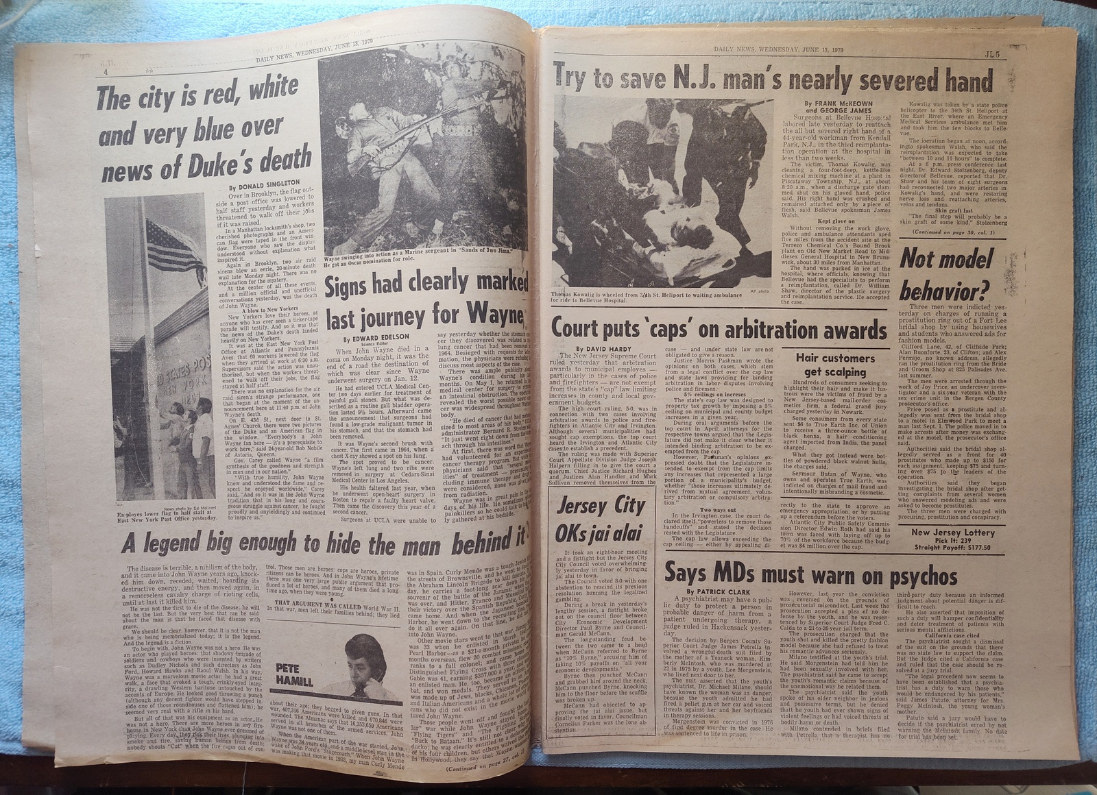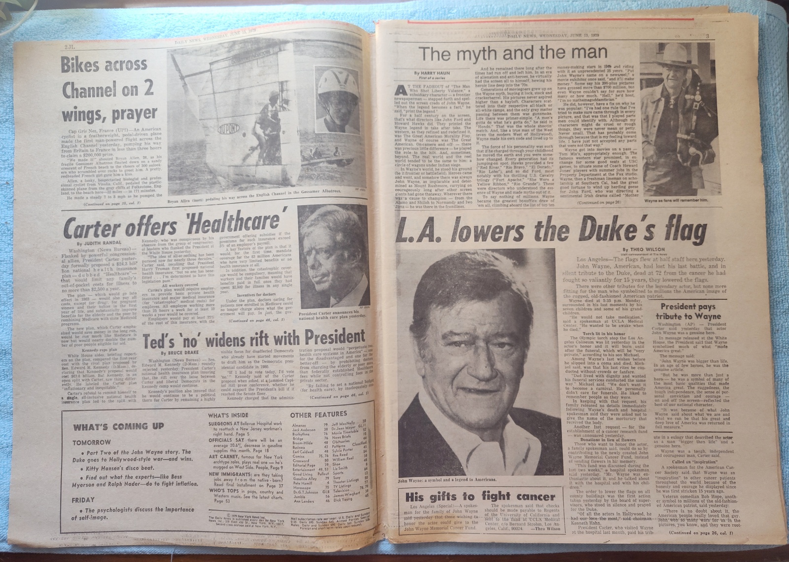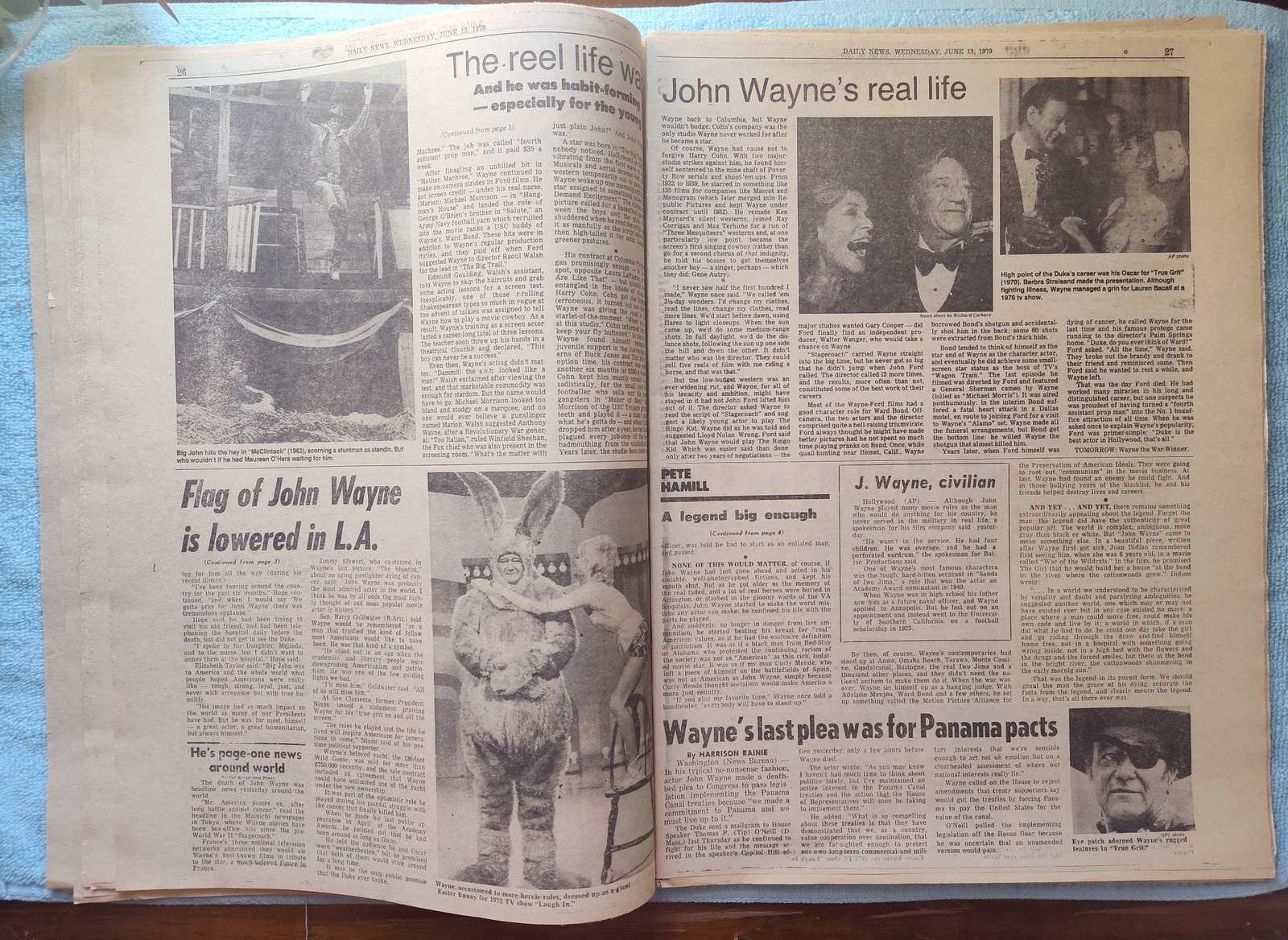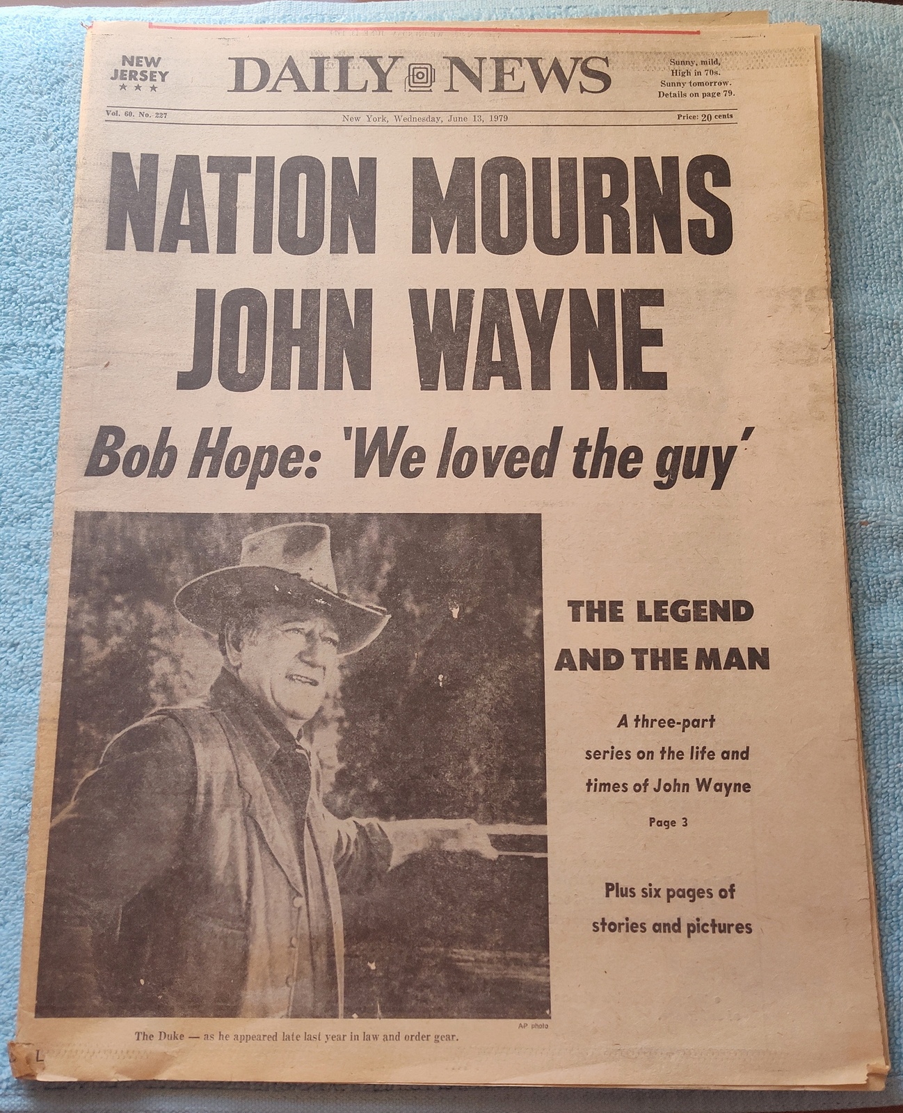 New York Daily News (New Jersey Edition) – Wednesday, June 13, 1979. This old newspaper features on the front page a picture of John Wayne. The headline is: ‘Nation Mourns John Wayne’ and ‘Bob Hope: ‘We Loved the guy” What you see in the pictures is what you get.