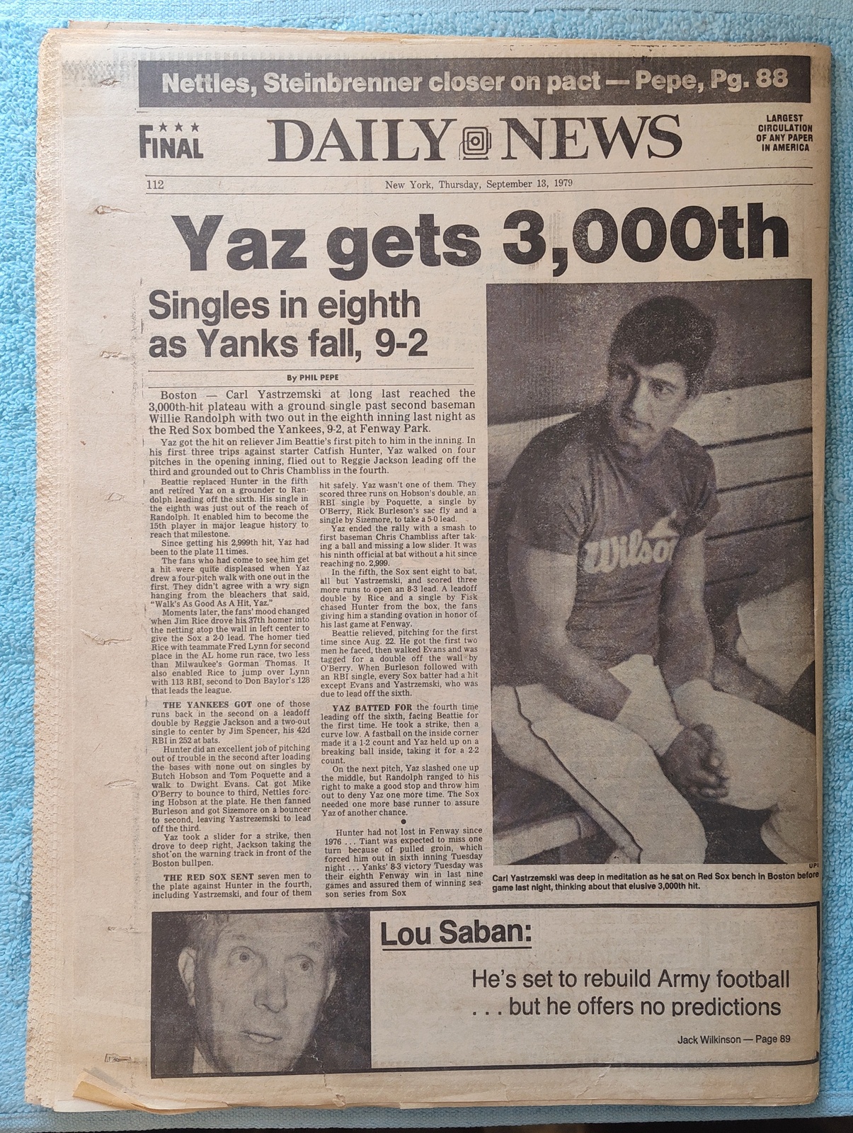 - The back page features a picture of Carl Yastrzemski in the dugout contemplating his upcoming 3000th hit.