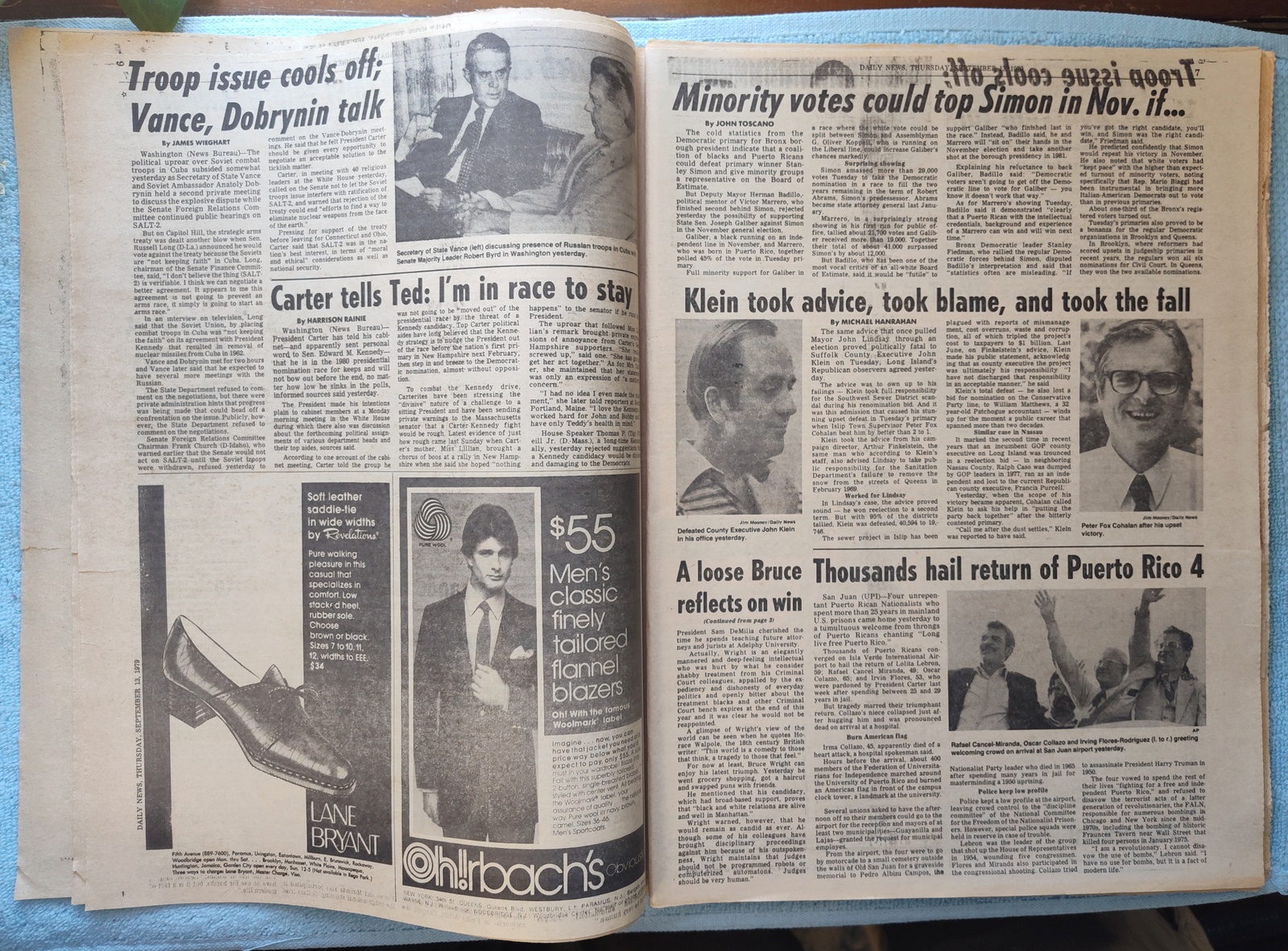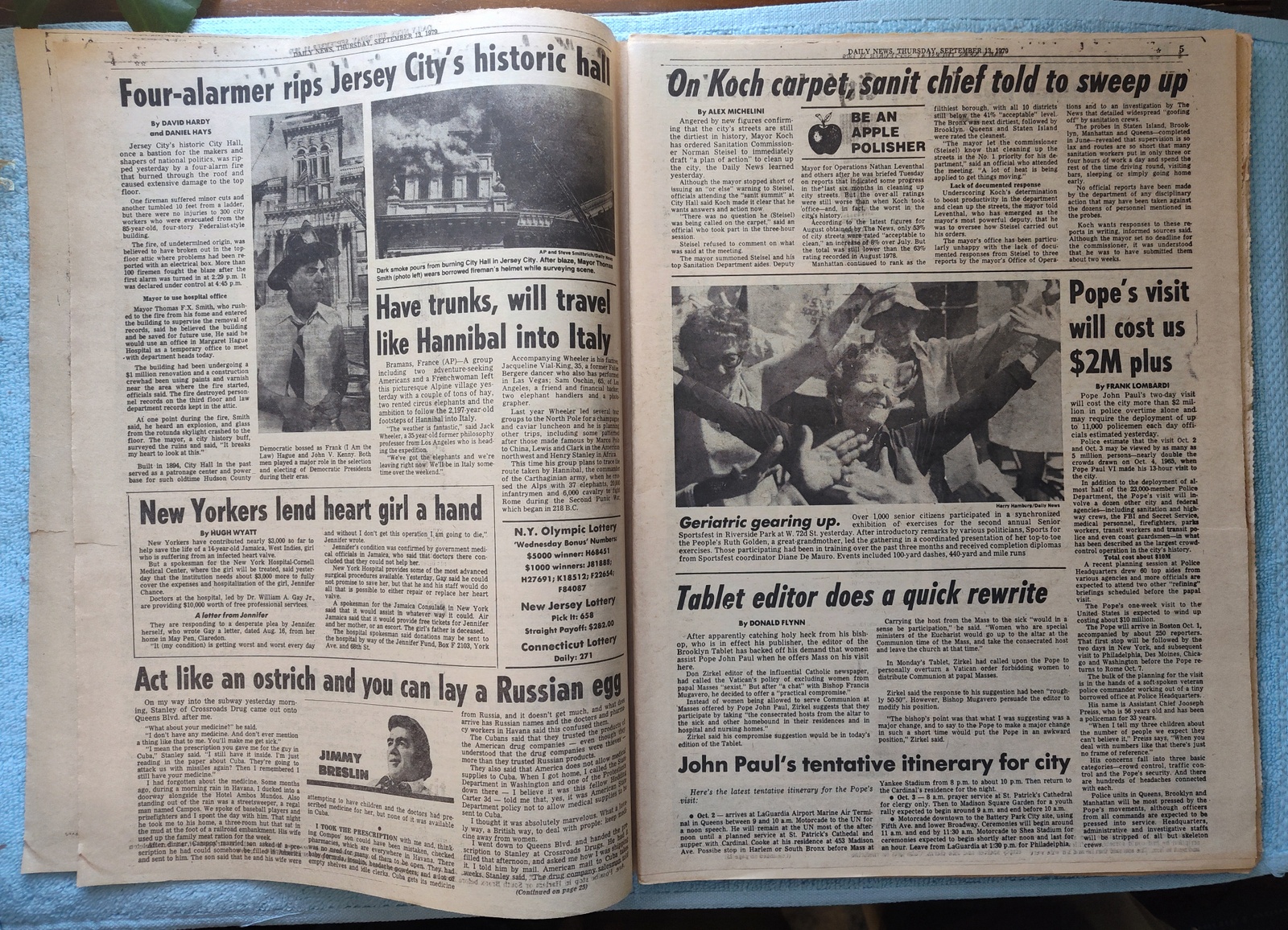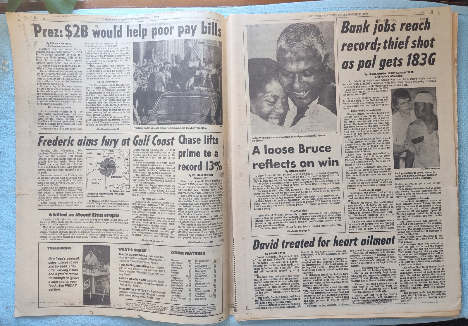 New York Daily News – Thursday, September 13, 1979. This old newspaper features on the front page a picture of President Carter wiping his brow at a speech in Hartford. The headline is: ‘Bandit Shot In 183G Bank Job’ and ‘Koch rips sanit boss on litter’ – What you see in the pictures is what you get.