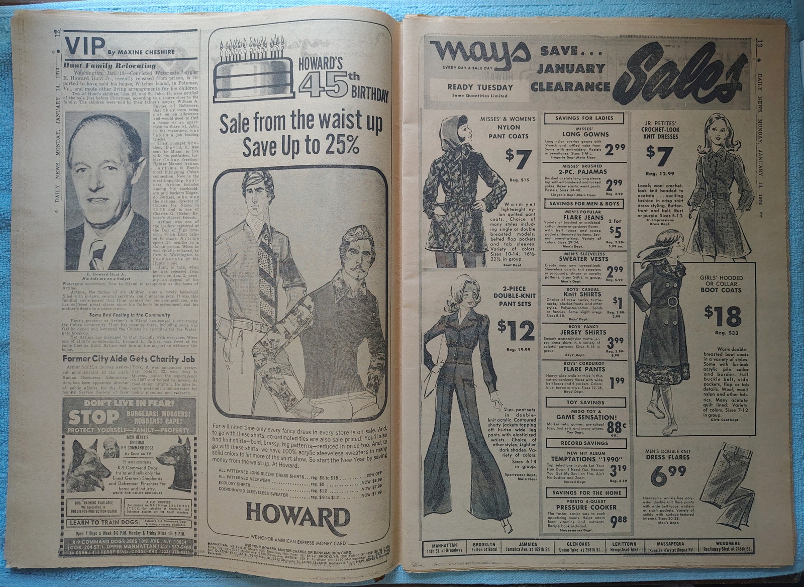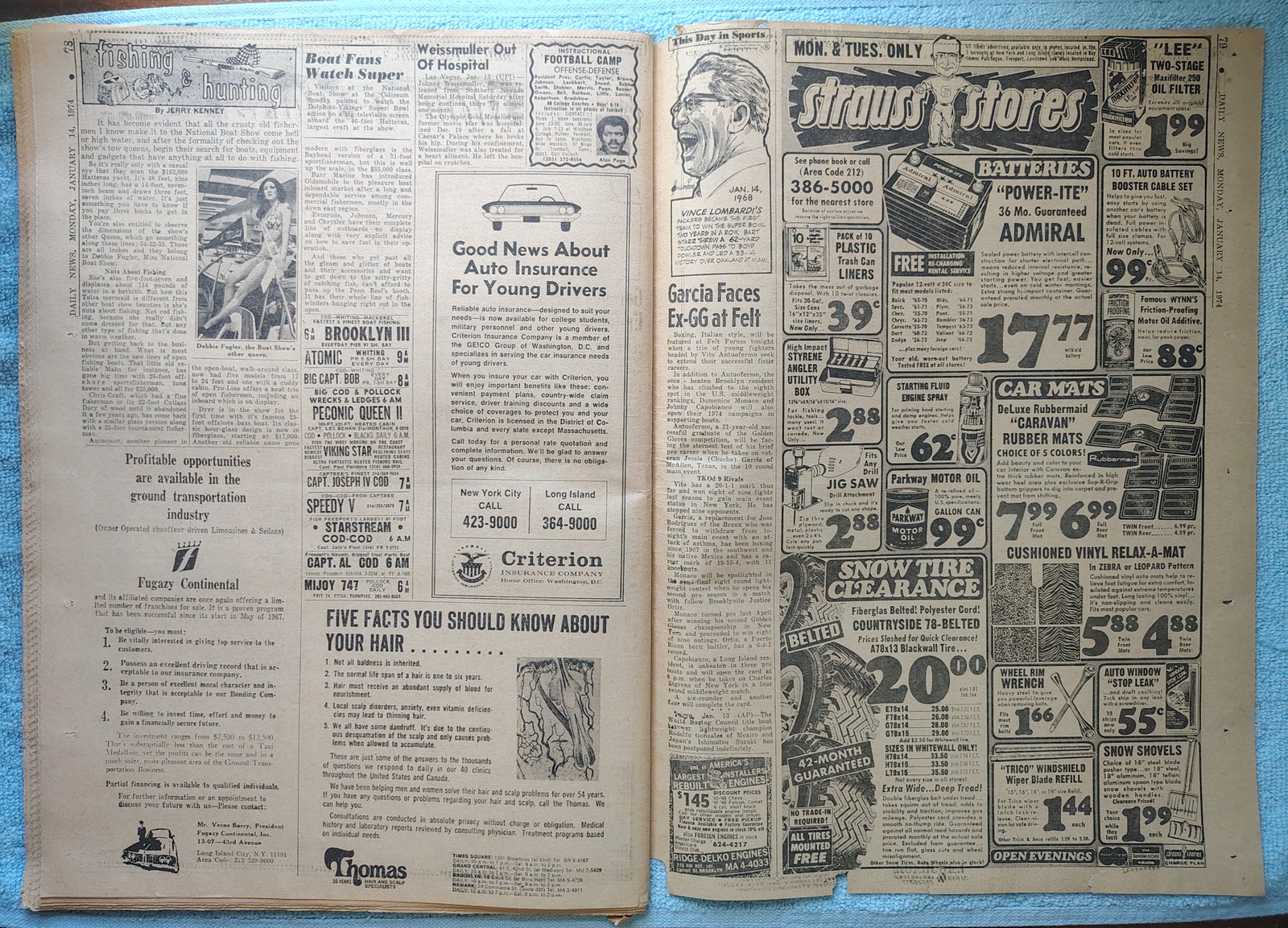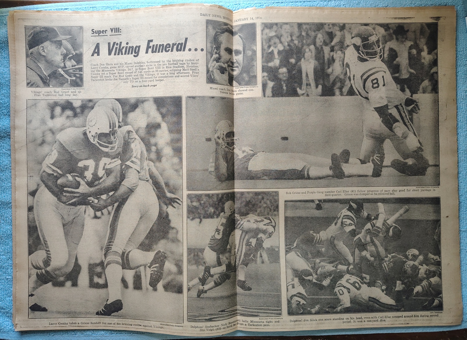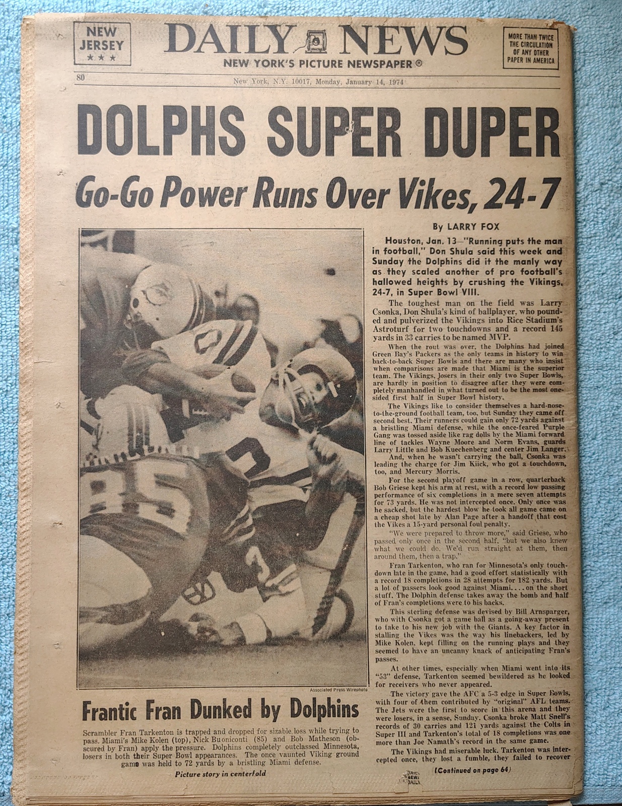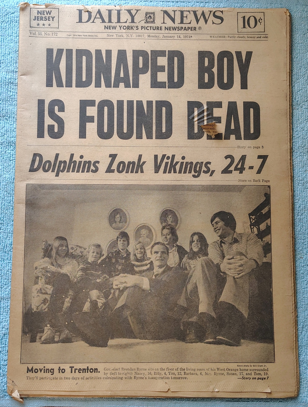 New York Daily News – Monday, January 14, 1974. The headline is: ‘Kidnapped Boy Is Found Dead’ and ‘Dolphins Zonk Vikings, 24-7’ – What you see in the pictures is what you get.