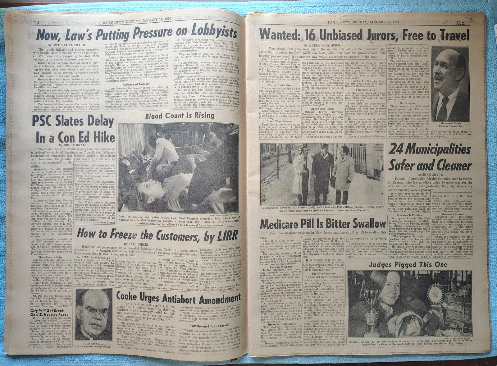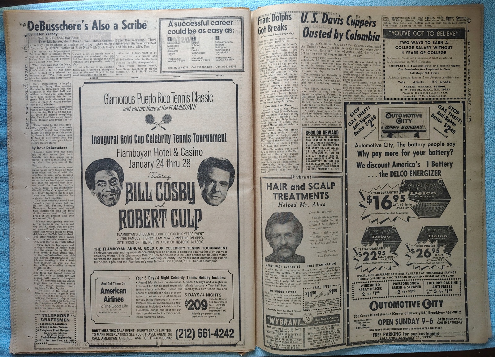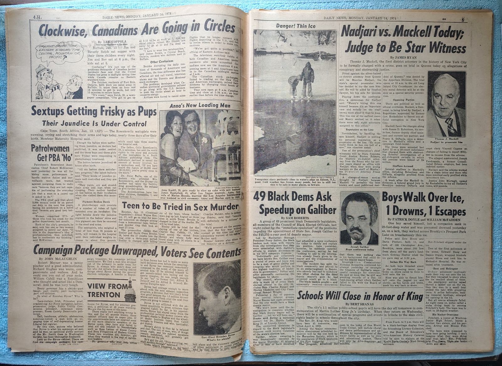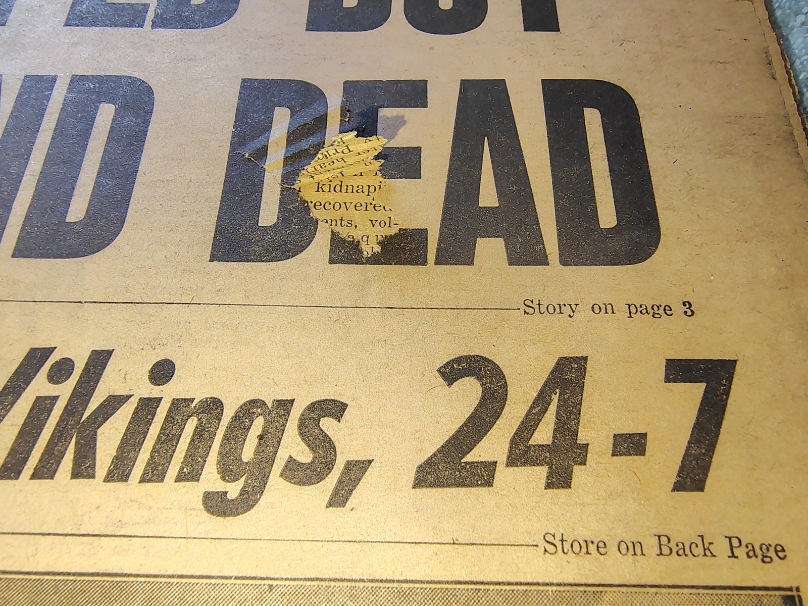 New York Daily News – Monday, January 14, 1974. The headline is: ‘Kidnapped Boy Is Found Dead’ and ‘Dolphins Zonk Vikings, 24-7’ – What you see in the pictures is what you get.