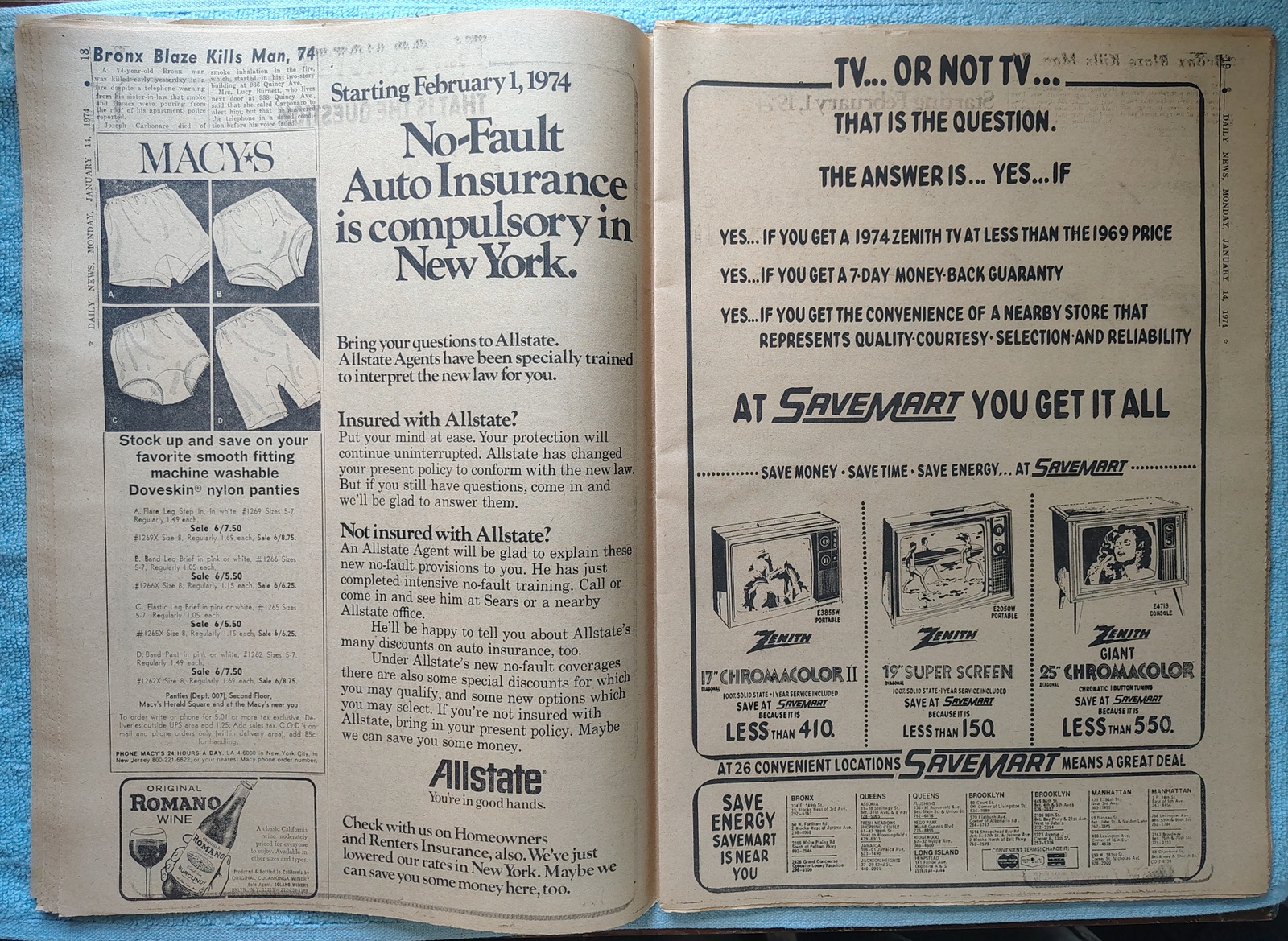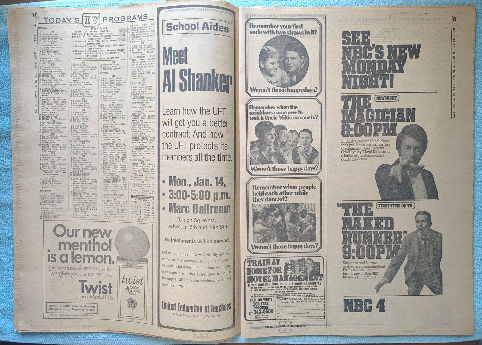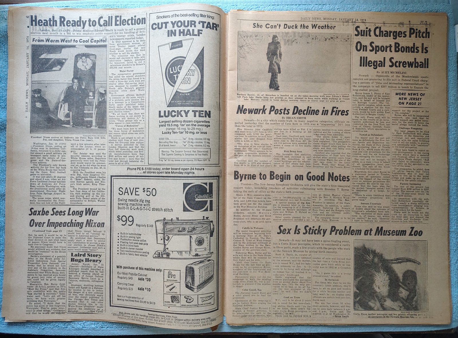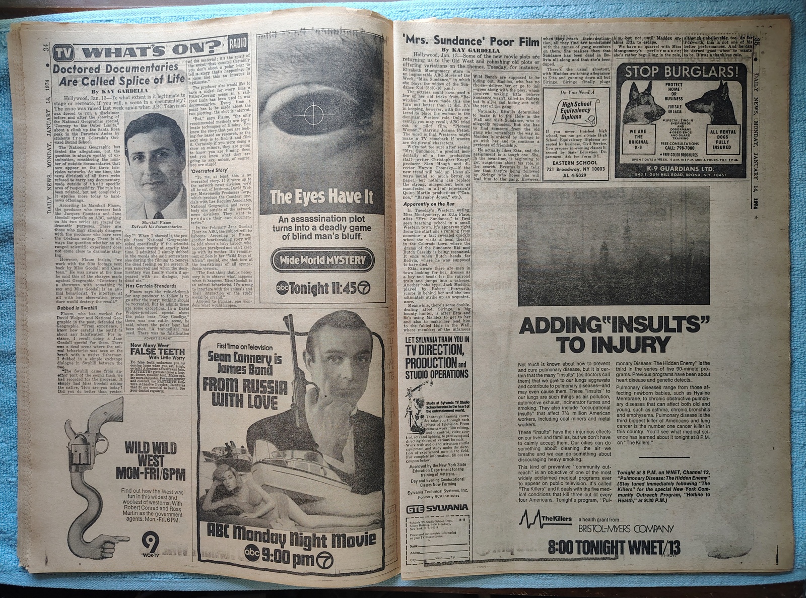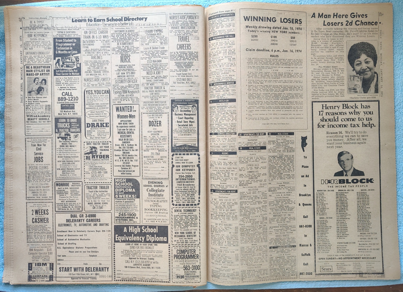 New York Daily News – Monday, January 14, 1974. The headline is: ‘Kidnapped Boy Is Found Dead’ and ‘Dolphins Zonk Vikings, 24-7’ – What you see in the pictures is what you get.