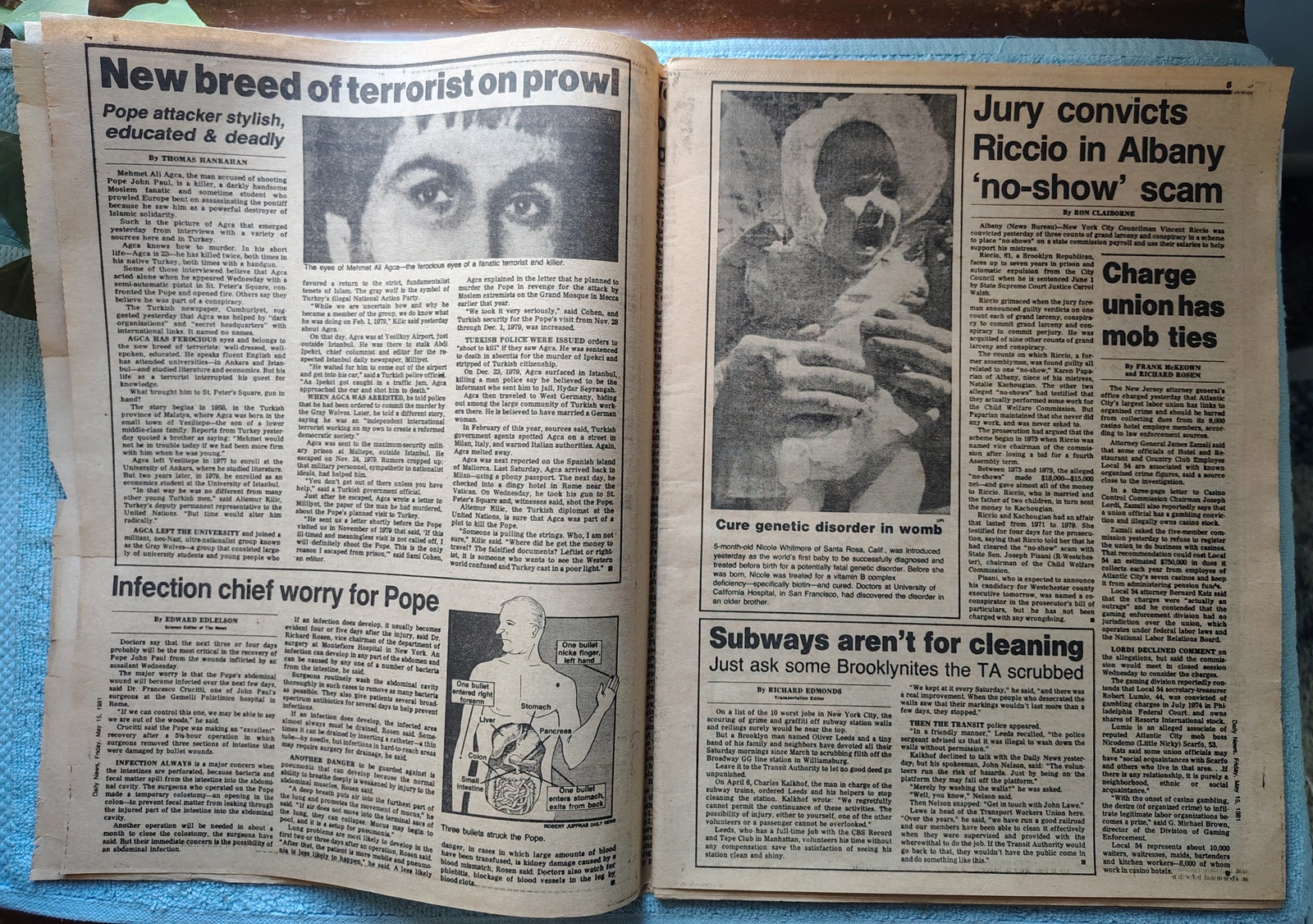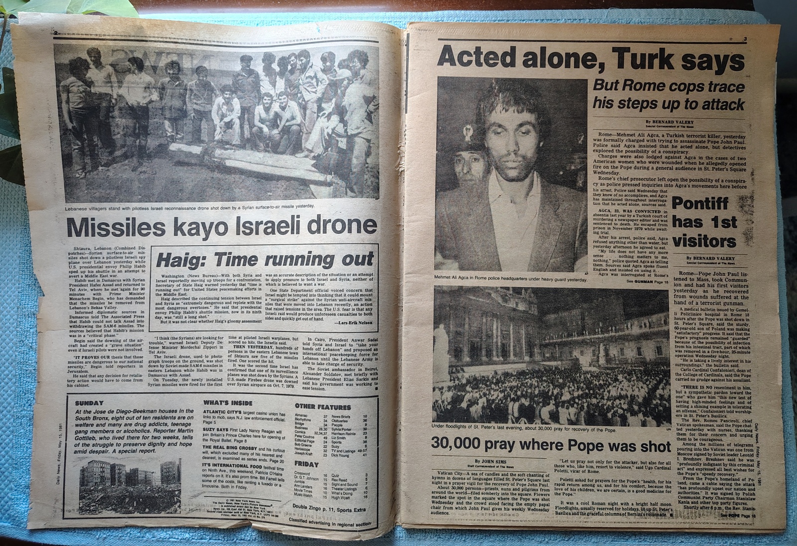 New York Daily News – Friday, May 15, 1981. The headline is: ”I Acted Alone” ‘Turk Charged in Pope Shooting’ The front page features a picture of Pope John Paul II greeting the faithful with a pistol extended and ready to fire on him. What you see in the pictures is what you get.