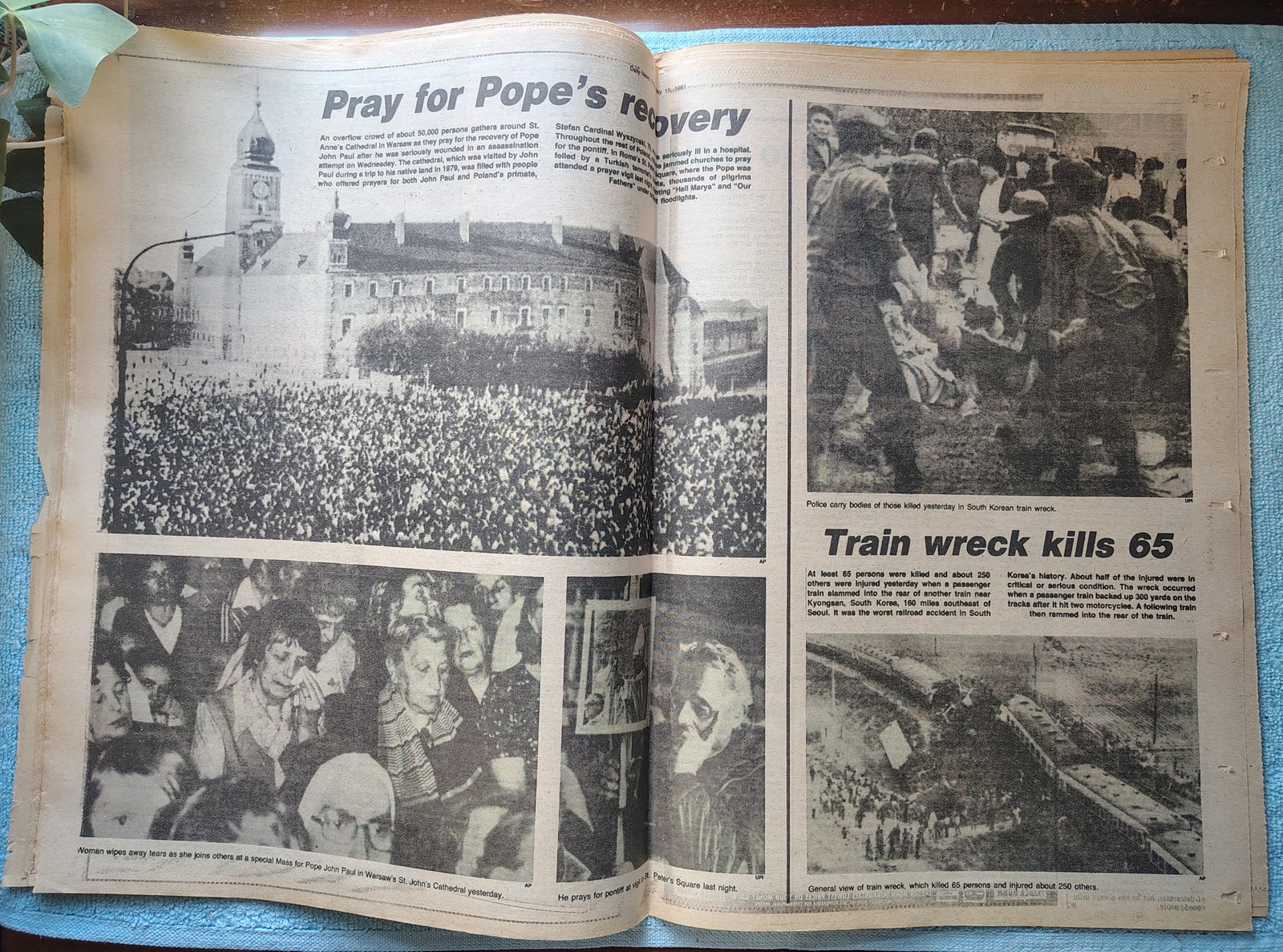 - The centerfold has pictures of the faithful praying for the recovery of the Pope and pictures from a train wreck in South Korea