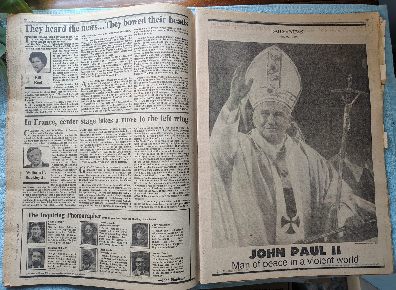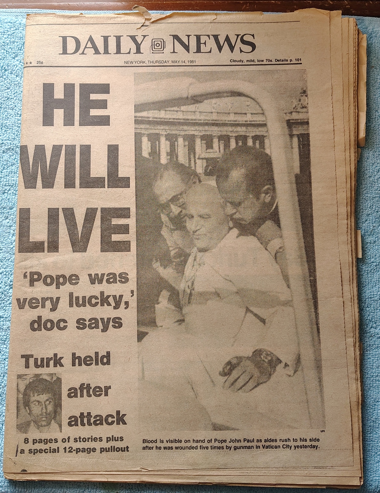 New York Daily News – Thursday, May 14, 1981. The headline is: ‘He Will Live’ ‘Pope was very lucky, doc says’ The front page features a picture of Pope John Paul II with aids moments after being wounded five times by an assassin’s bullets. What you see in the pictures is what you get.