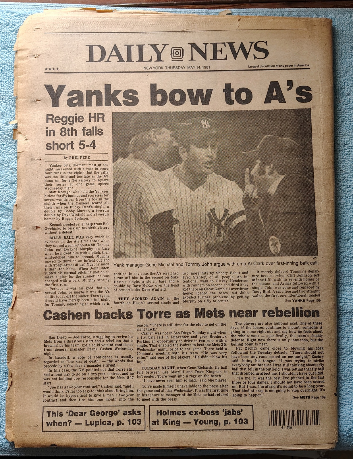 - The back page features a picture of the Yankees’ manager Gene Michael and Tommy John arguing with umpire Al Clark over a call.
