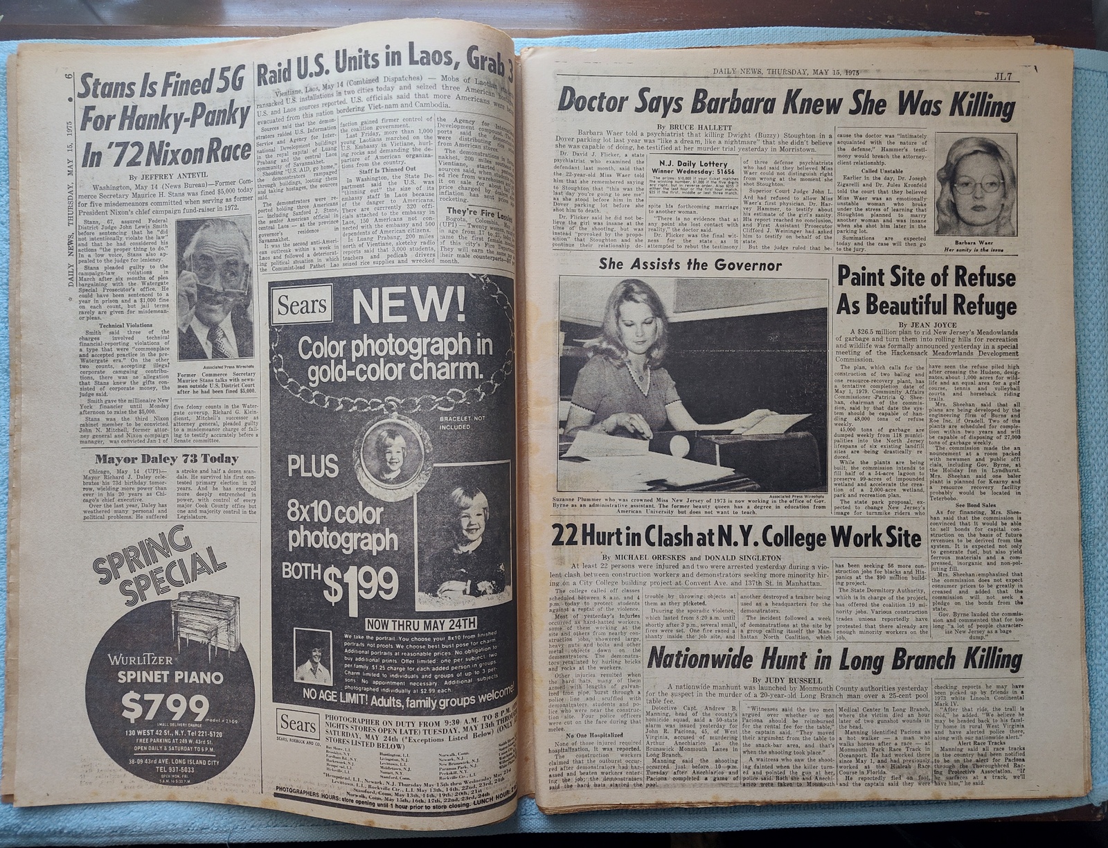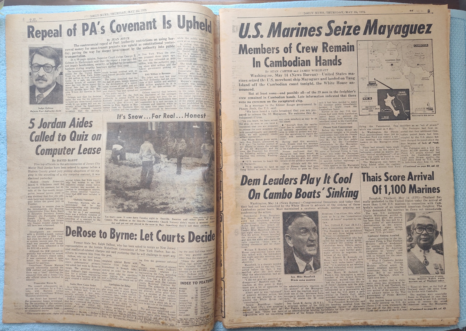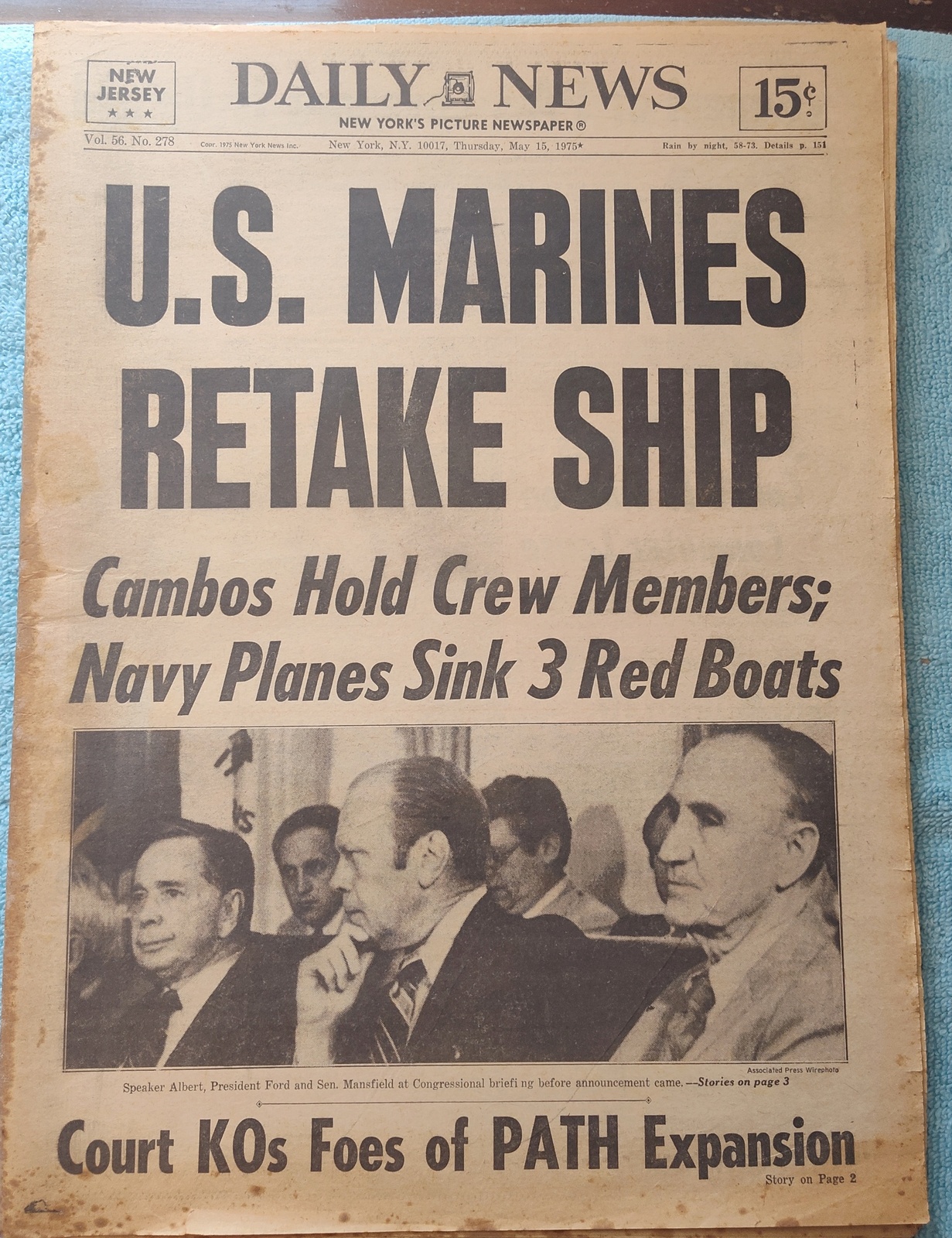 New York Daily News (New Jersey Edition) – Thursday, May 15, 1975. This old newspaper features on the front page a picture of President Ford, Speaker Albert, and Sen. Mansfield at the congressional briefing on the Mayaguez incident. The headline is: ‘U.S. Marines Retake Ship’ and ‘Cambos Hold Crew Members; Navy Planes Sink 3 Red Boats’ What you see in the pictures is what you get.
