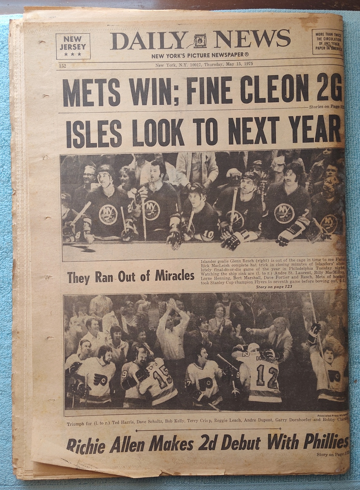 - The back page features pictures of professional hockey players: the disappointed Islanders and the triumphant Flyers.