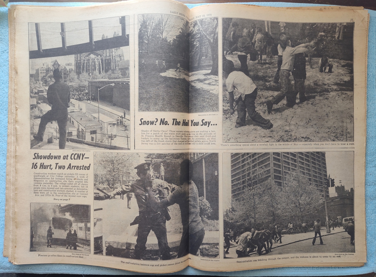 - The centerfold has several pictures of violence between protestors for the hiring of Hispanics and blacks on construction sites and police at City College as well as kids having a snowball fight with hail.