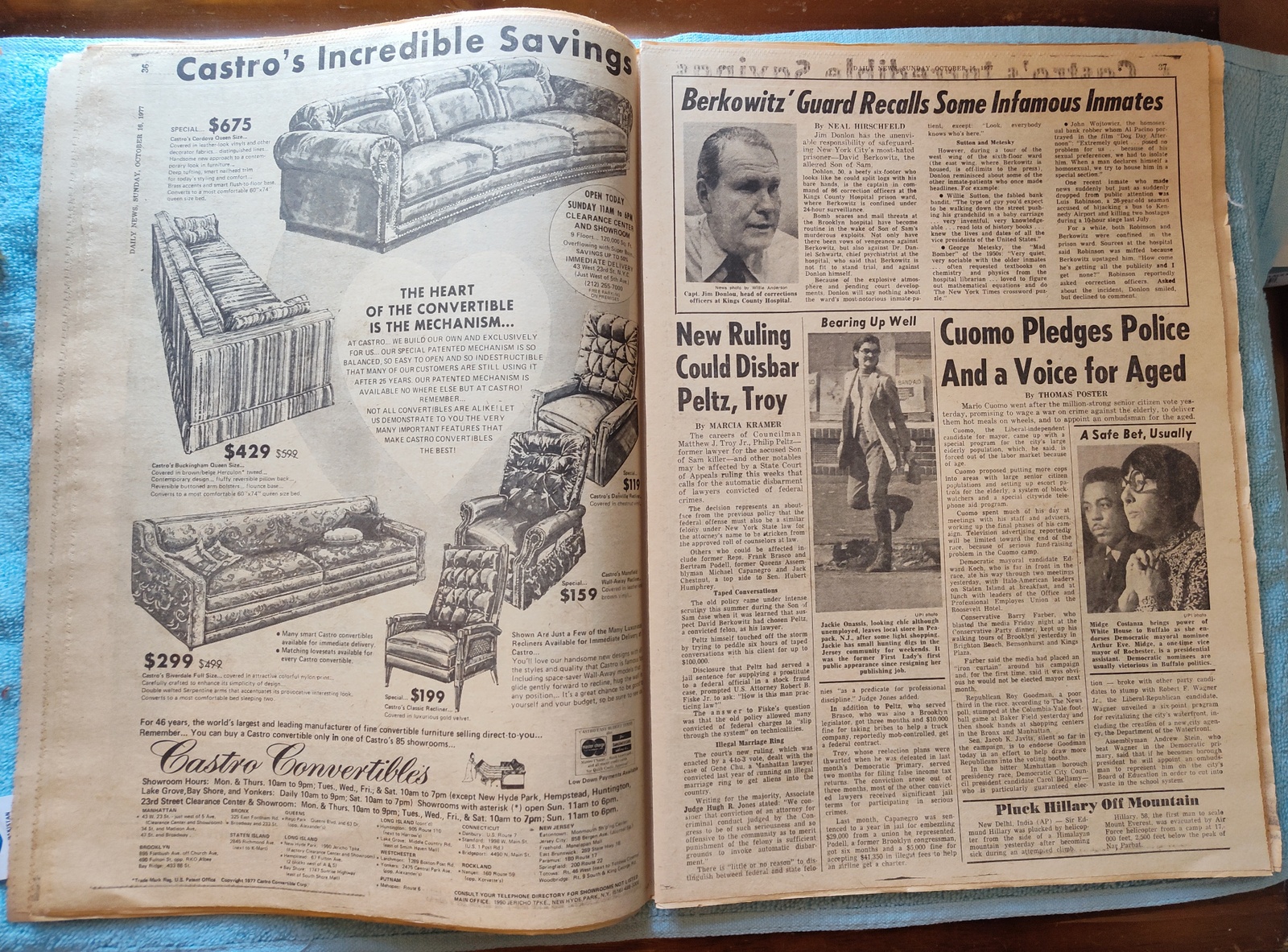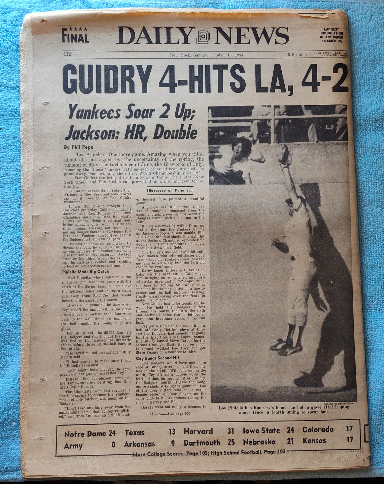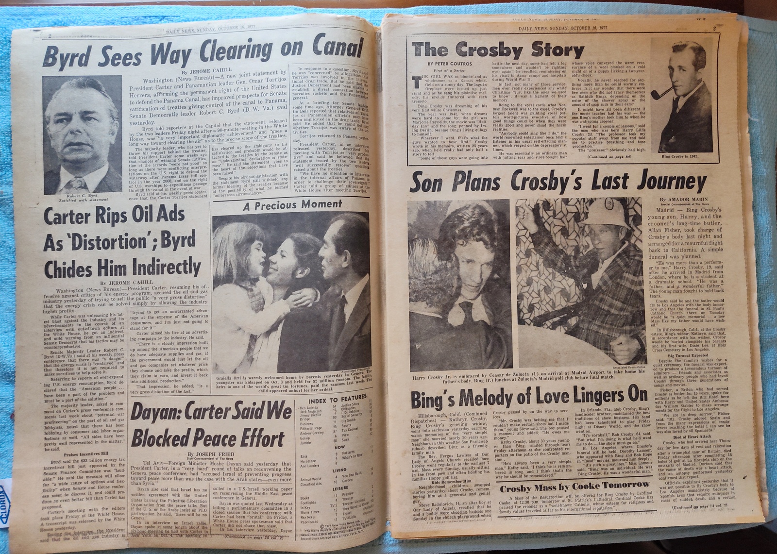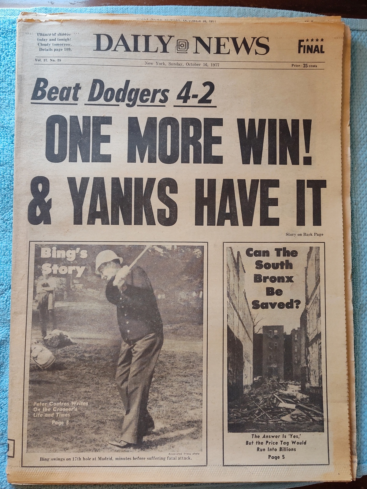 New York Daily News – Sunday, October 16, 1977. This old newspaper features on the front page a picture of Bing Crosby swinging a golf club in Madrid ‘minutes before suffering fatal attack’ The headline is: ‘Beat Dodgers 4-2 One More Win! & Yanks Have It’ – What you see in the pictures is what you get.