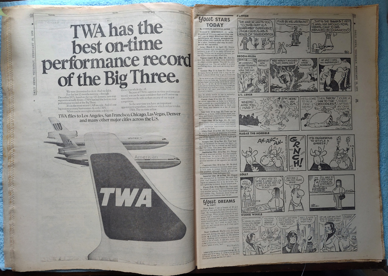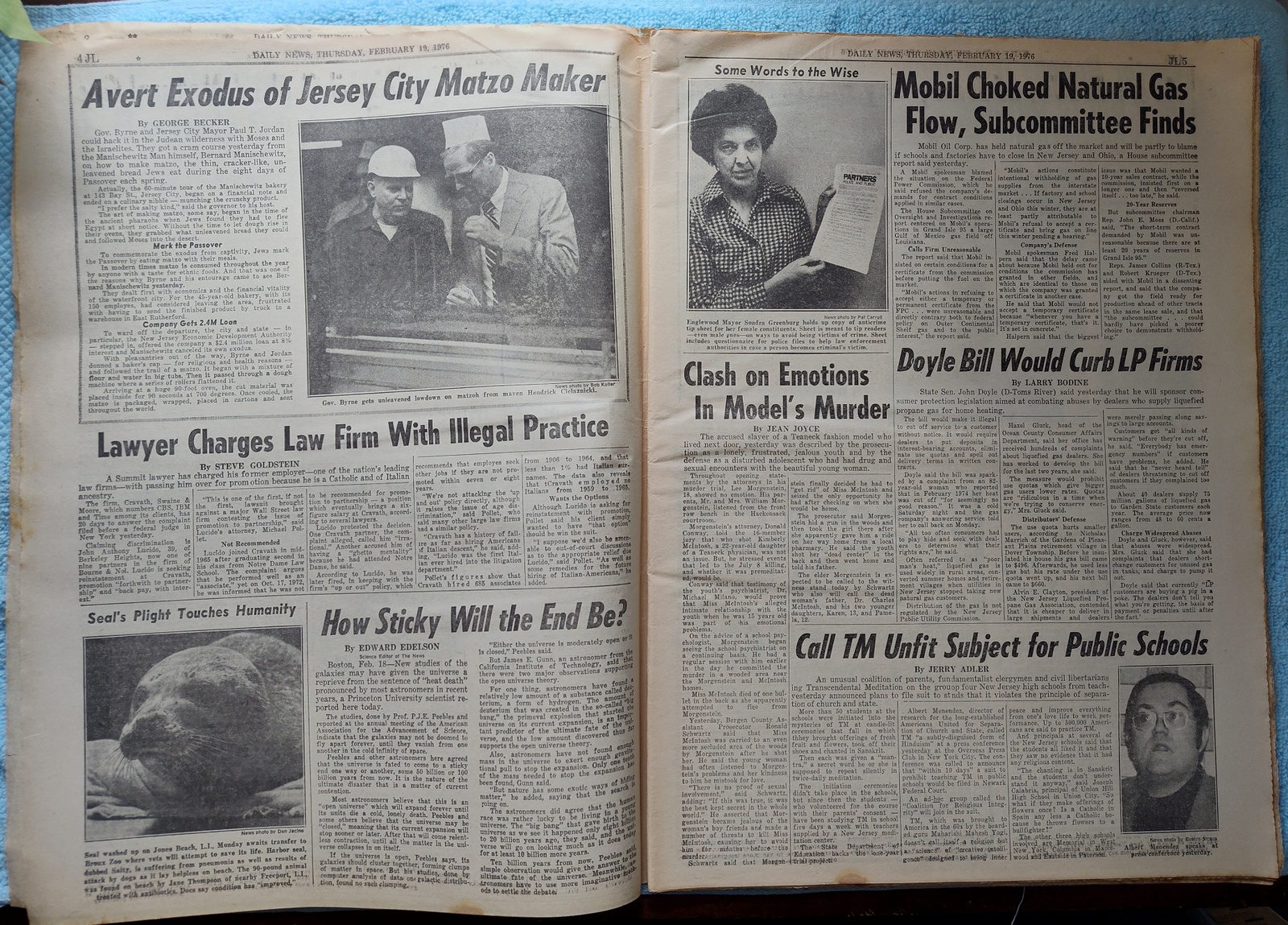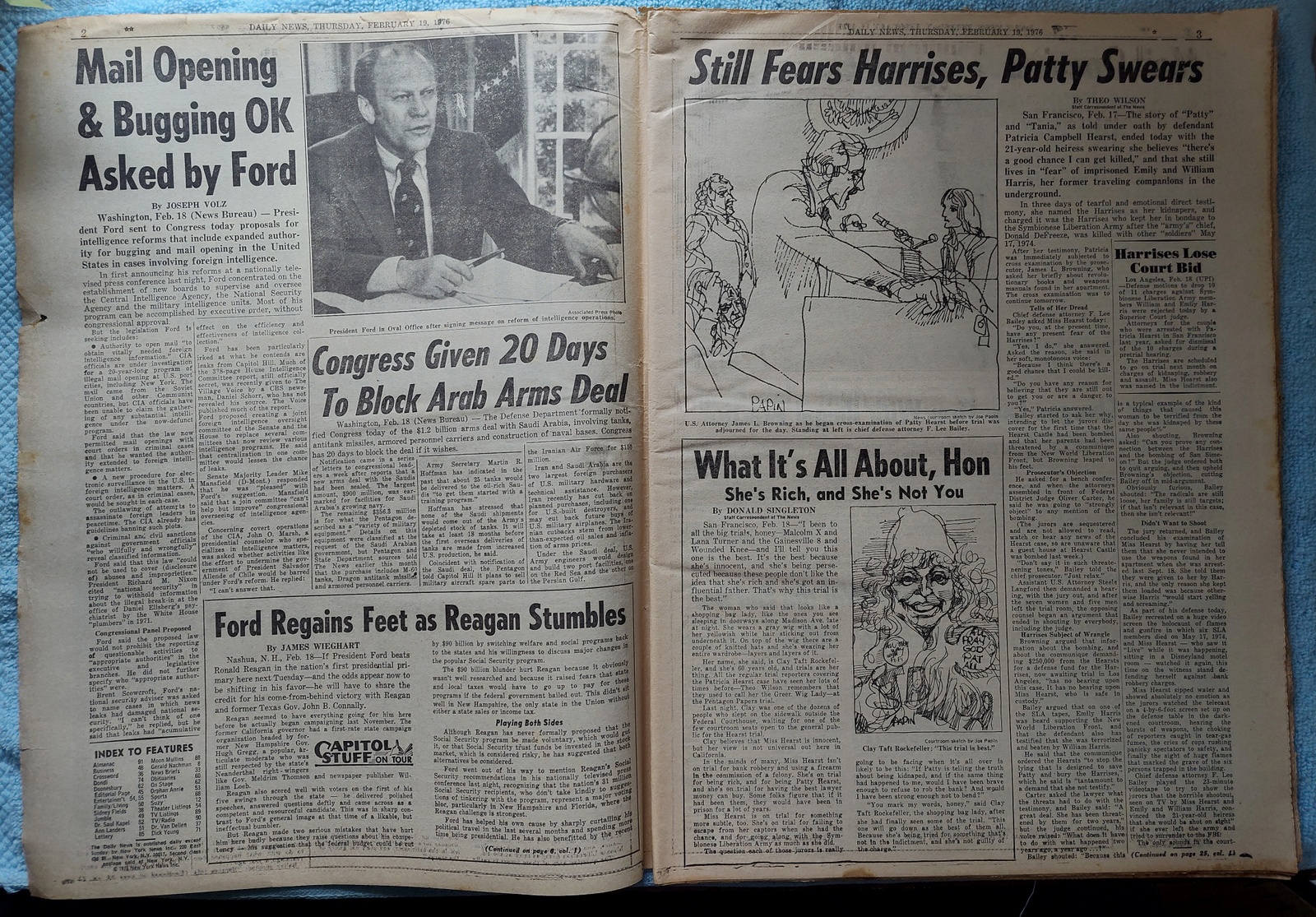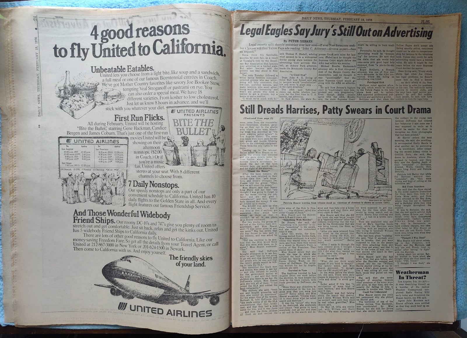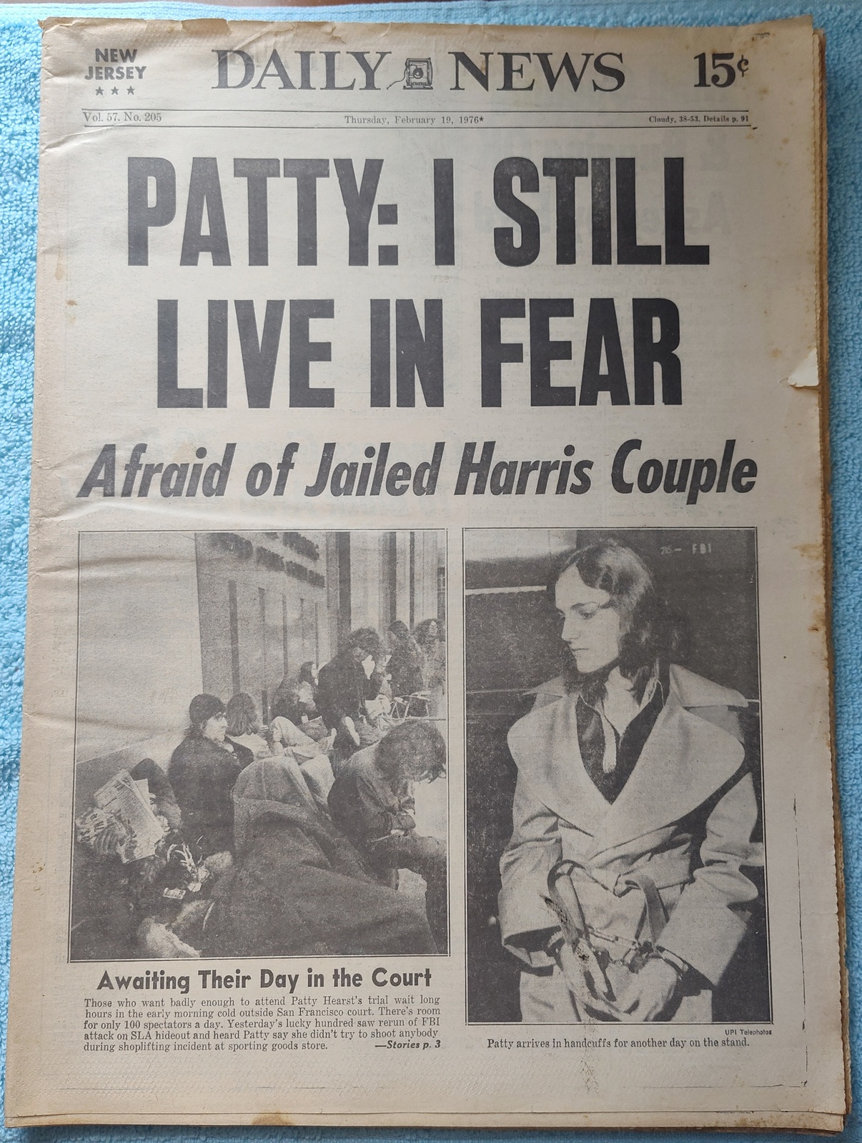 New York Daily News (New Jersey Edition) – Thursday, February 19, 1976. This old newspaper features on the front page a picture of Patricia Hurst arriving to court in handcuffs and the line outside of the door to attend the trial. The headline is: ‘Patty: I Still Live In Fear’ and ‘Afraid of Jailed Harris Couple’ What you see in the pictures is what you get.