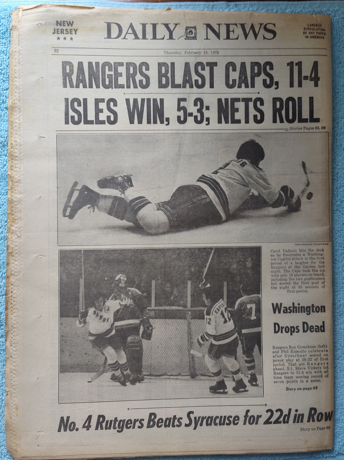 - The back page features pictures of Carol Vadnais going for the puck and Ron Greschner and Phil Esposito celebrating a score