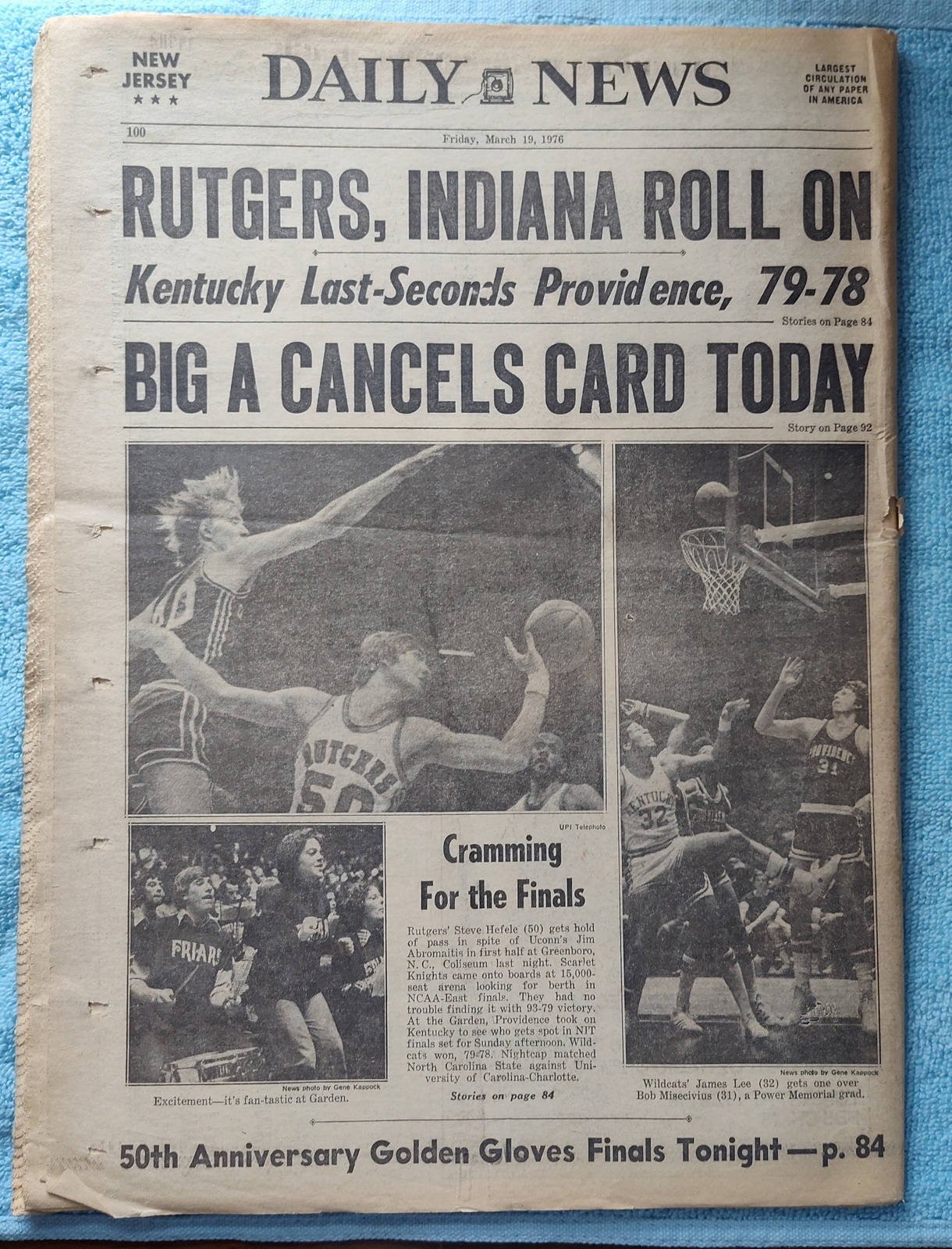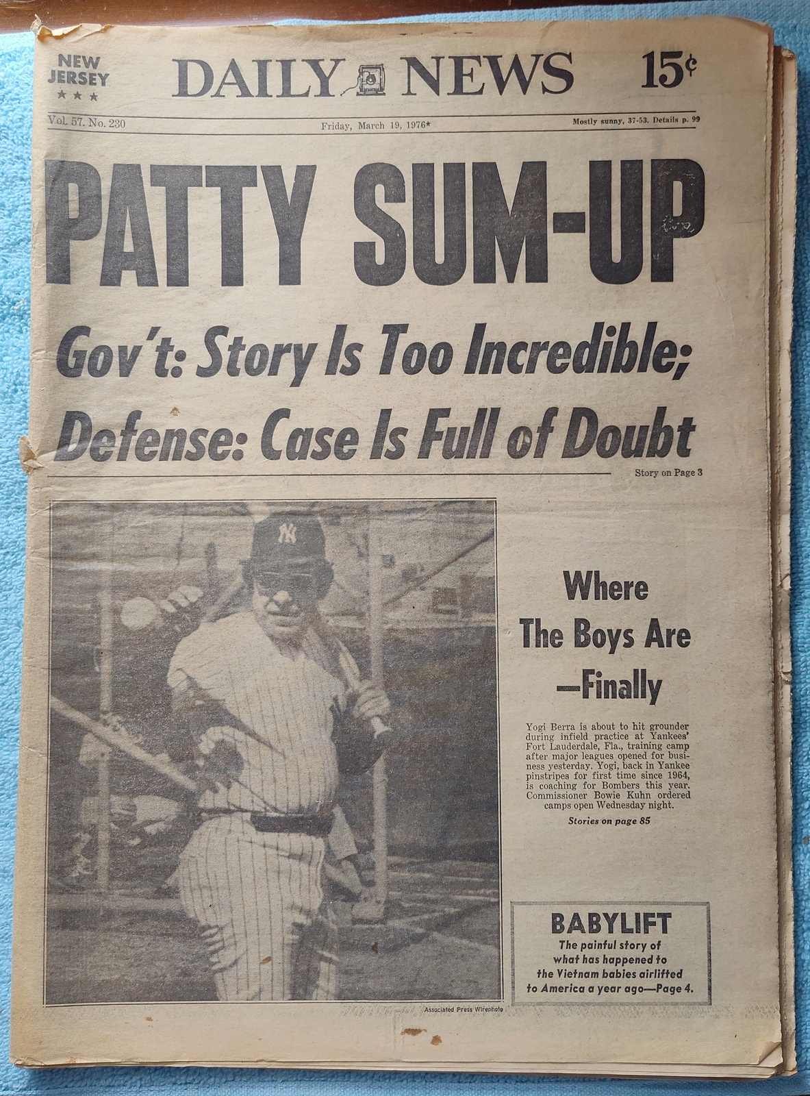 New York Daily News (New Jersey Edition) – Friday, March 19, 1976. This old newspaper features on the front page a picture of Yogi Berra at Yankees practice. The headline is: ‘Patty Sum-Up Gov’t: Story It Too Incredible; Defense: Case Is Full Of Doubt’ What you see in the pictures is what you get.