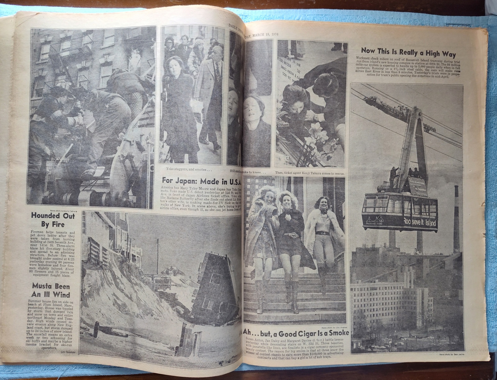 - The centerfold has several pictures of a coastal house toppled by a storm, firemen rescuing people and pets from a burning building, Yoko Yamamoto, the soon to be opened Roosevelt Island tramway, and the three finalists in a cigar company-sponsored beauty contest.