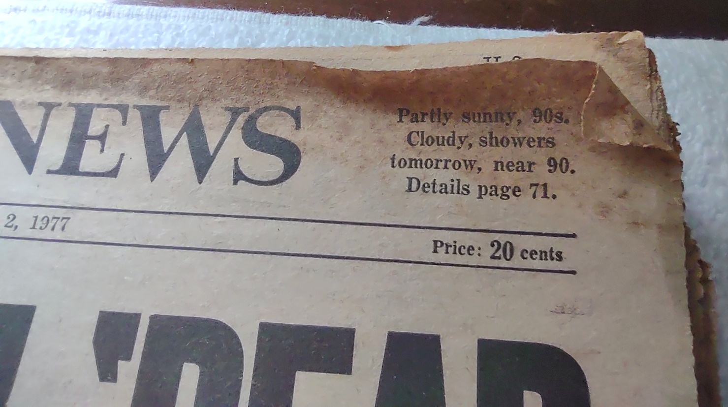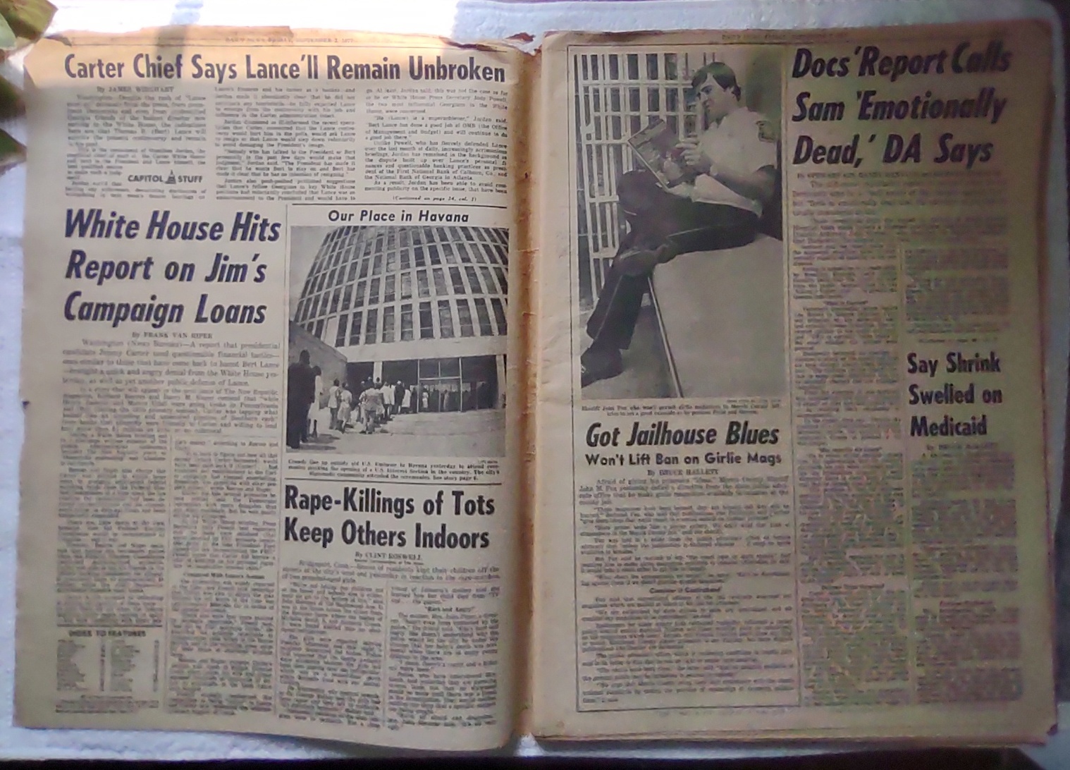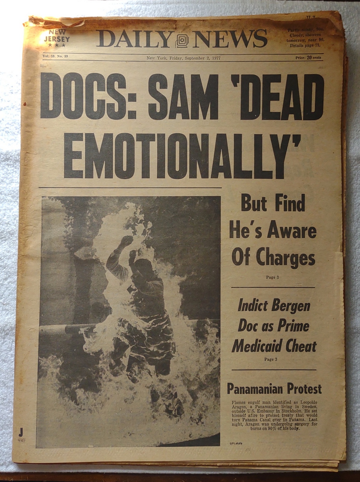 New York Daily News (New Jersey Edition) – Friday, September 2, 1977. This old newspaper features on the front page a picture of Leopoldo Aragon setting himself on fire in front of the US embassy in Sweden to protest the treaty to turn over the Panama Canal to Panama. The headline is: ‘Docs: Sam ‘Dead Emotionally’ Bu Find He’s Aware Of Charges’ What you see in the pictures is what you get.