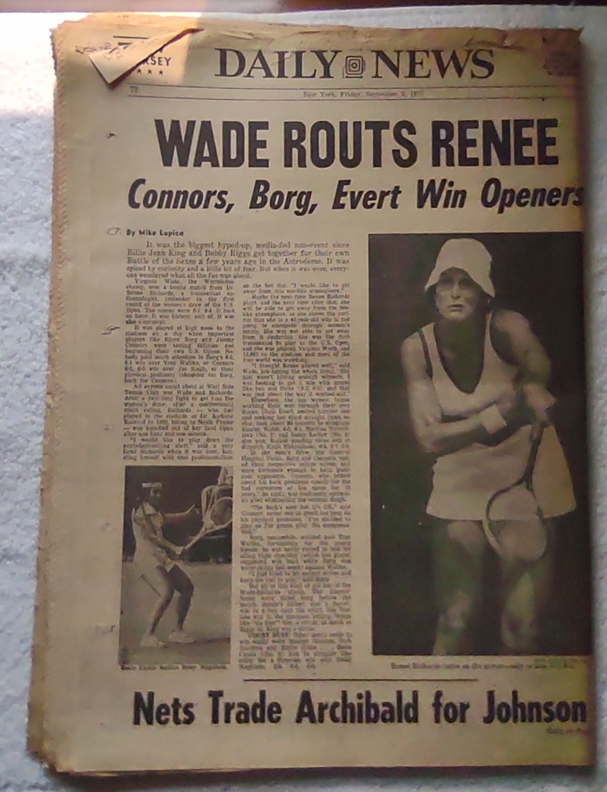 - The back page features pictures of Rosie Casals and Renee Richards competing at the US Open in tennis.