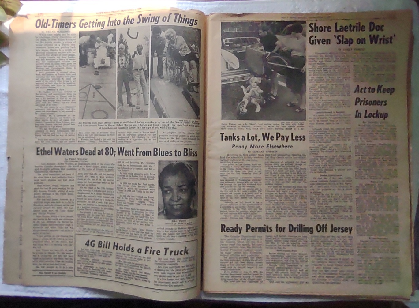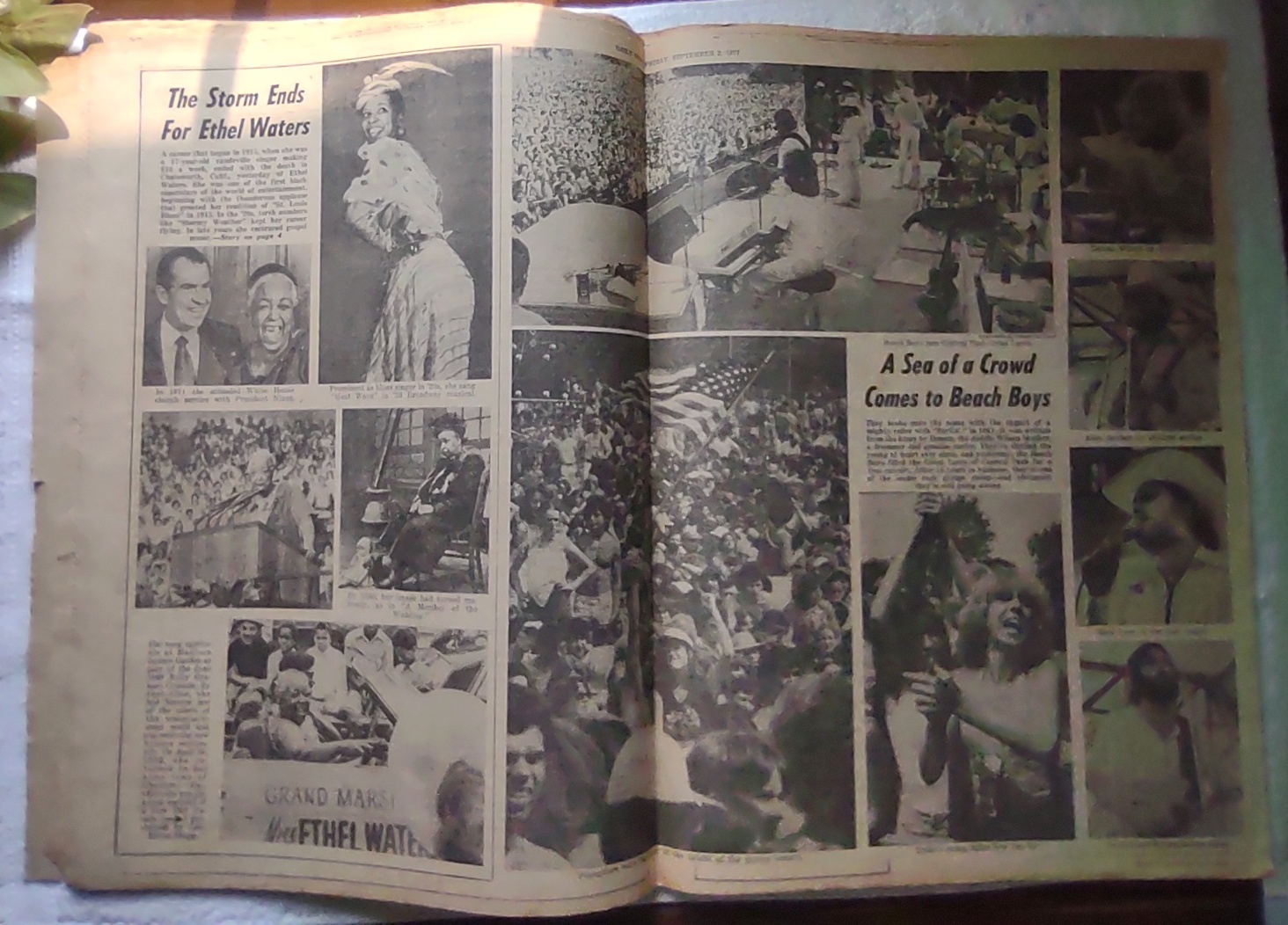 - The centerfold has several pictures of Ethel Waters, one attending church with President Nixon in 1971, as well as pictures of a Beach Boys concert in Central Park