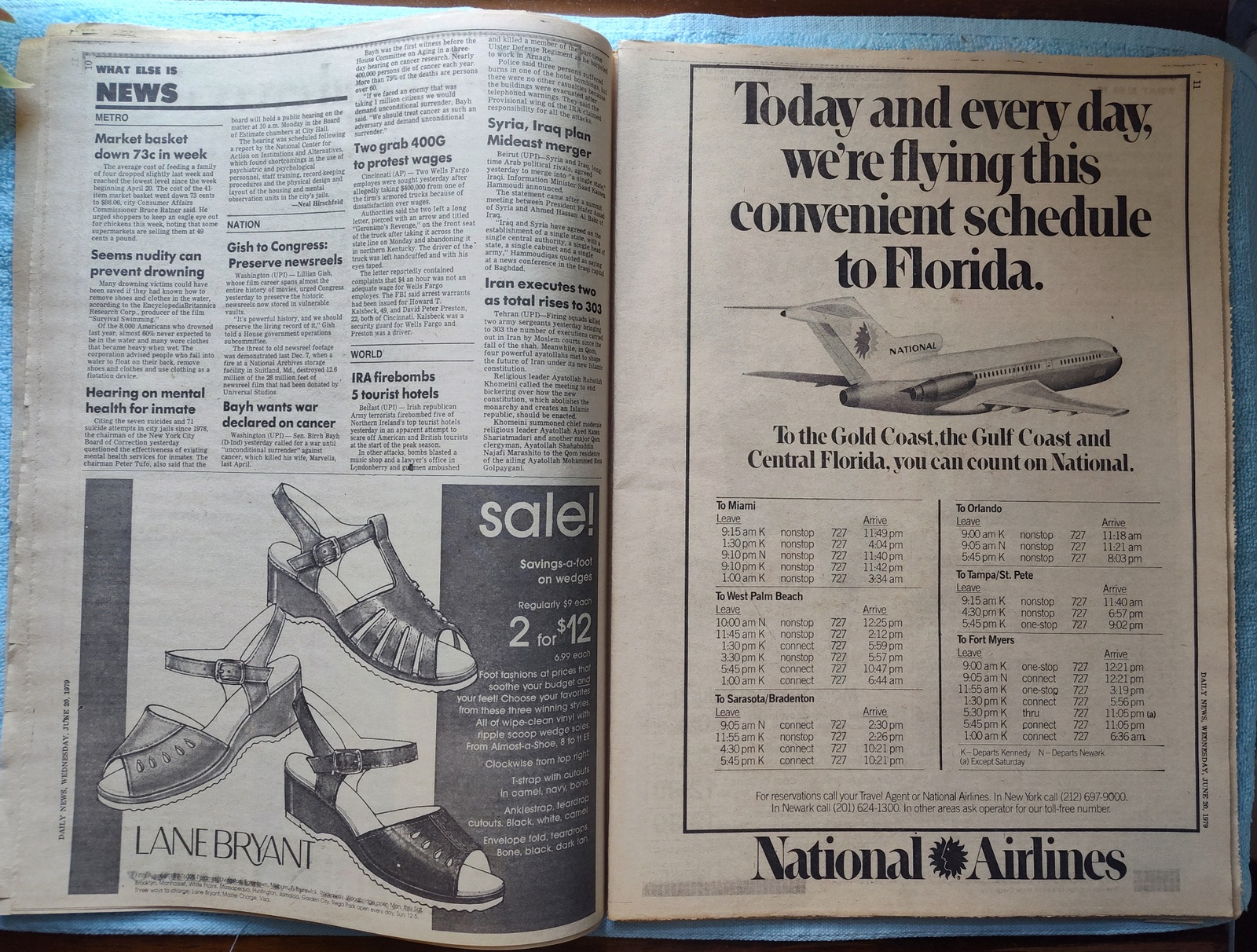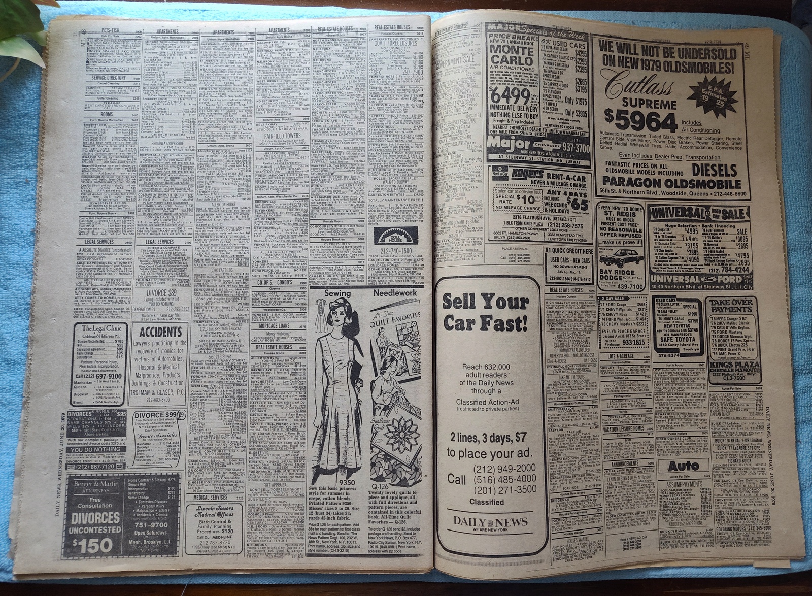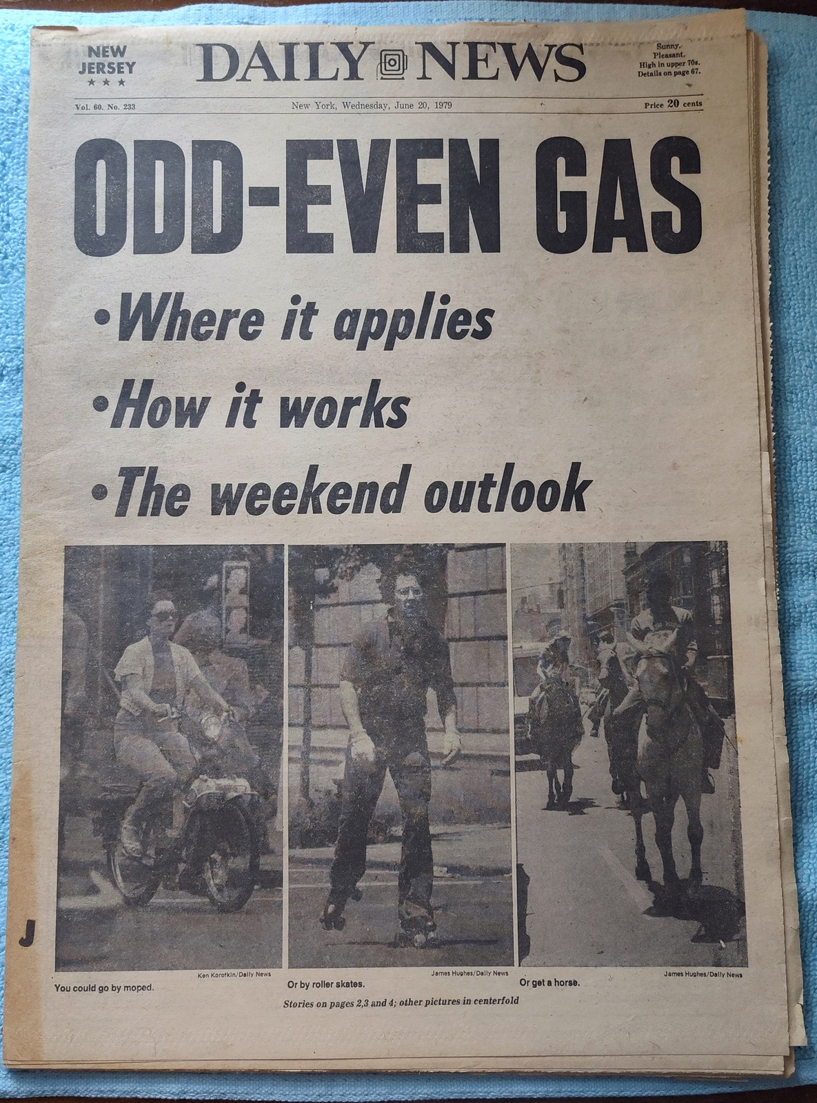 New York Daily News – Wednesday, June 20, 1979. This old newspaper features on the front page pictures of folks using alternate modes of transportation than automobiles: moped, roller skates, horse. The headline is: ‘Odd-Even Gas’ and ‘Where it applies, How it works, The weekend outlook’ – What you see in the pictures is what you get.