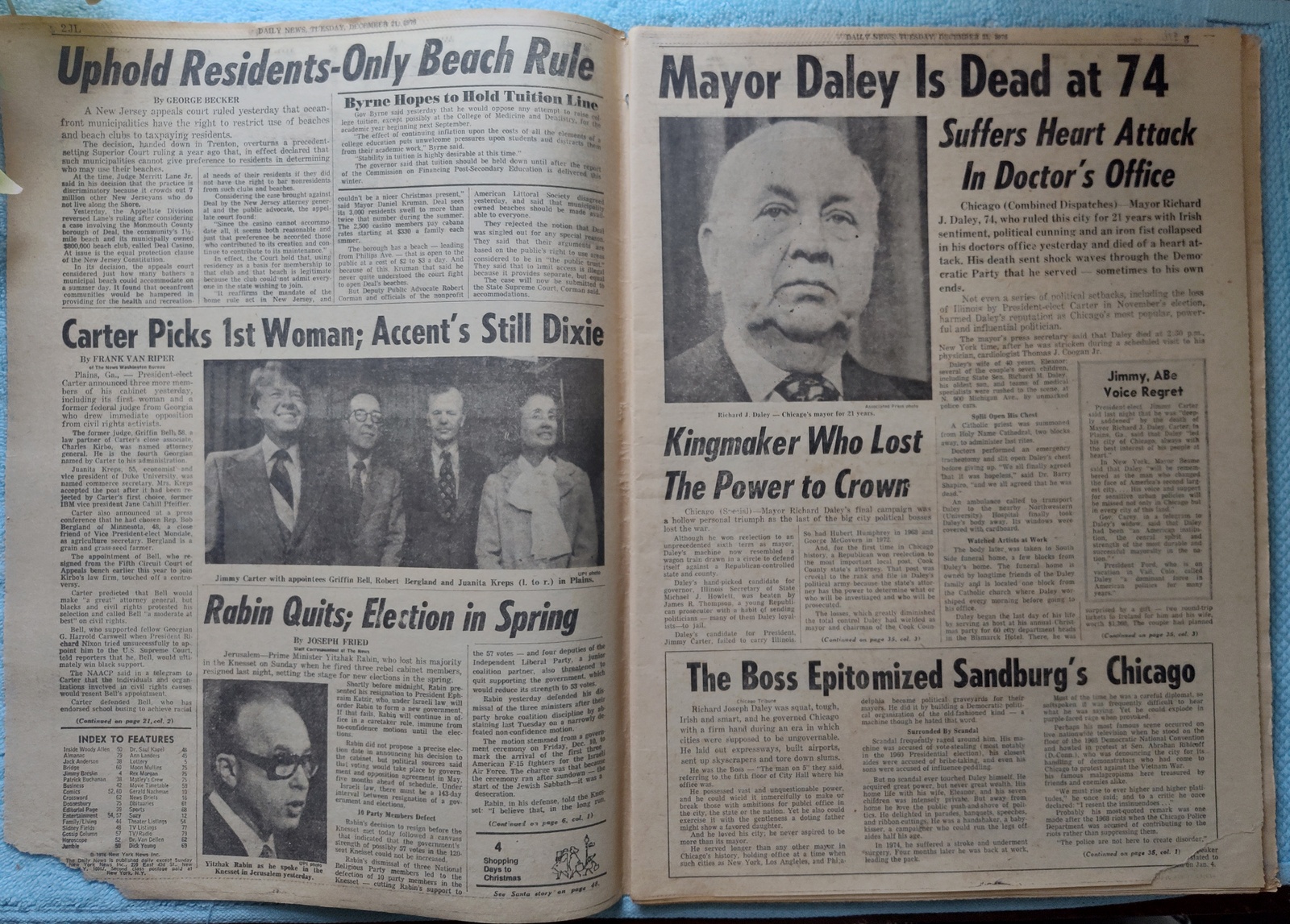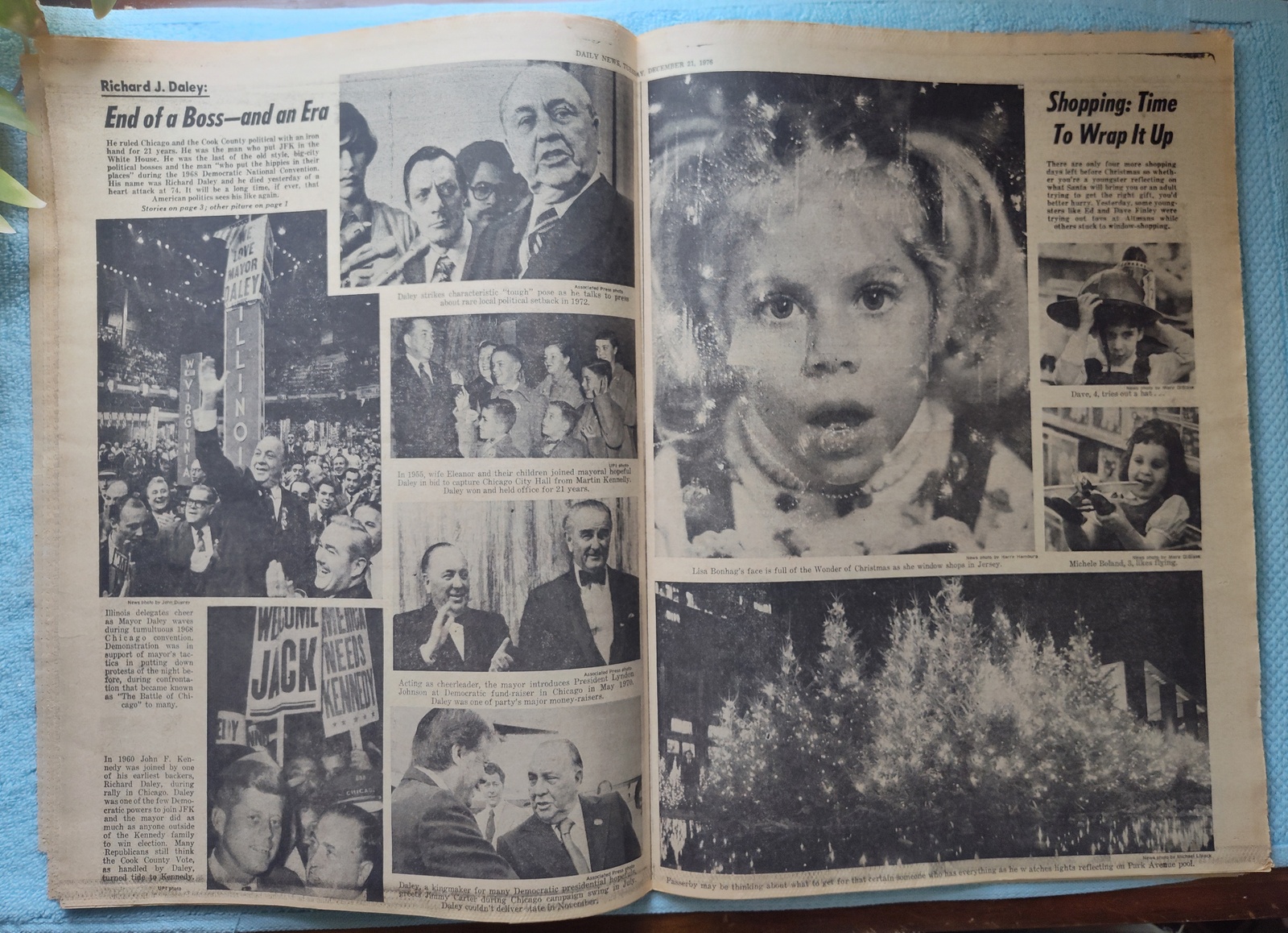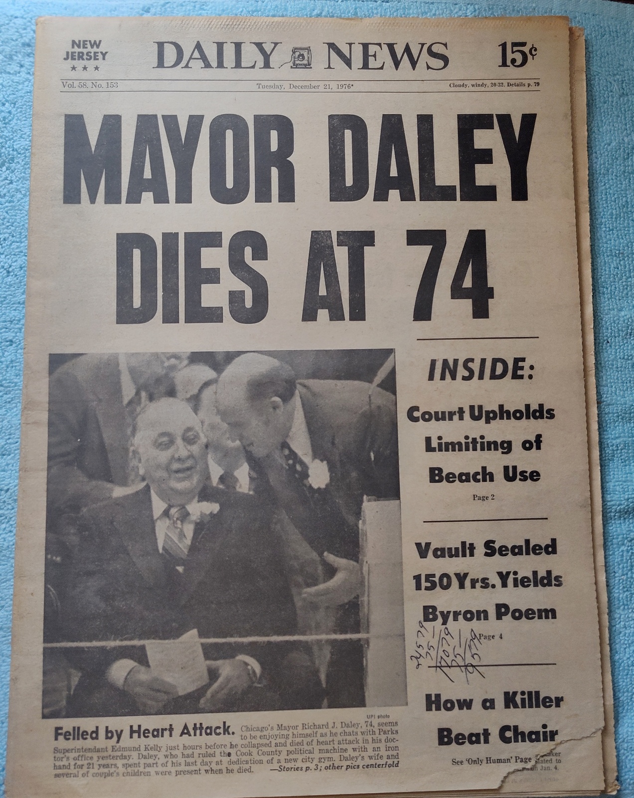 New York Daily News (New Jersey Edition) – Tuesday, December 21, 1976. This old newspaper features on the front page a picture of Chicago mayor Richard J. Daley just hours before he is stricken with a heart attack. The headline is: ‘Mayor Daley Dies At 74’ and ‘Inside: Court Upholds Limiting of Beach Use, Vault Sealed 150Yrs. Yields Byron Poem’ – The back page features pictures of the NY Rangers’ Christmas party with their families. What you see in the pictures is what you get.