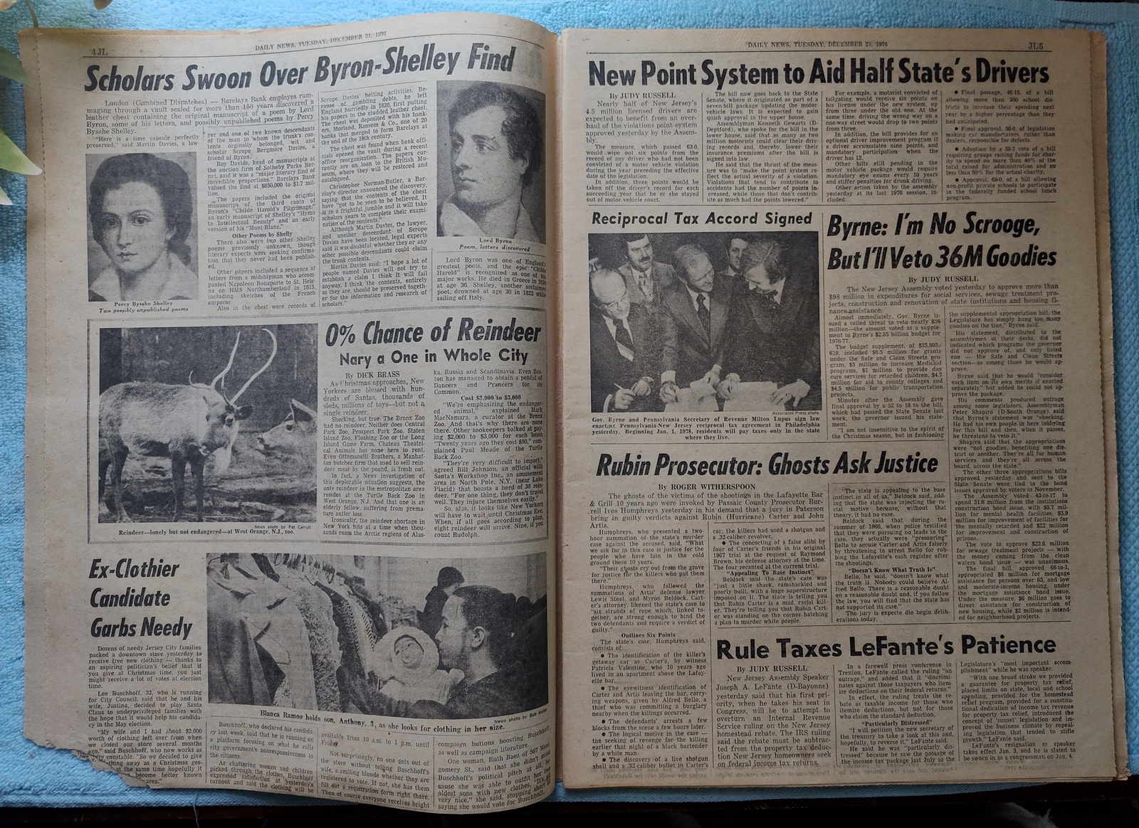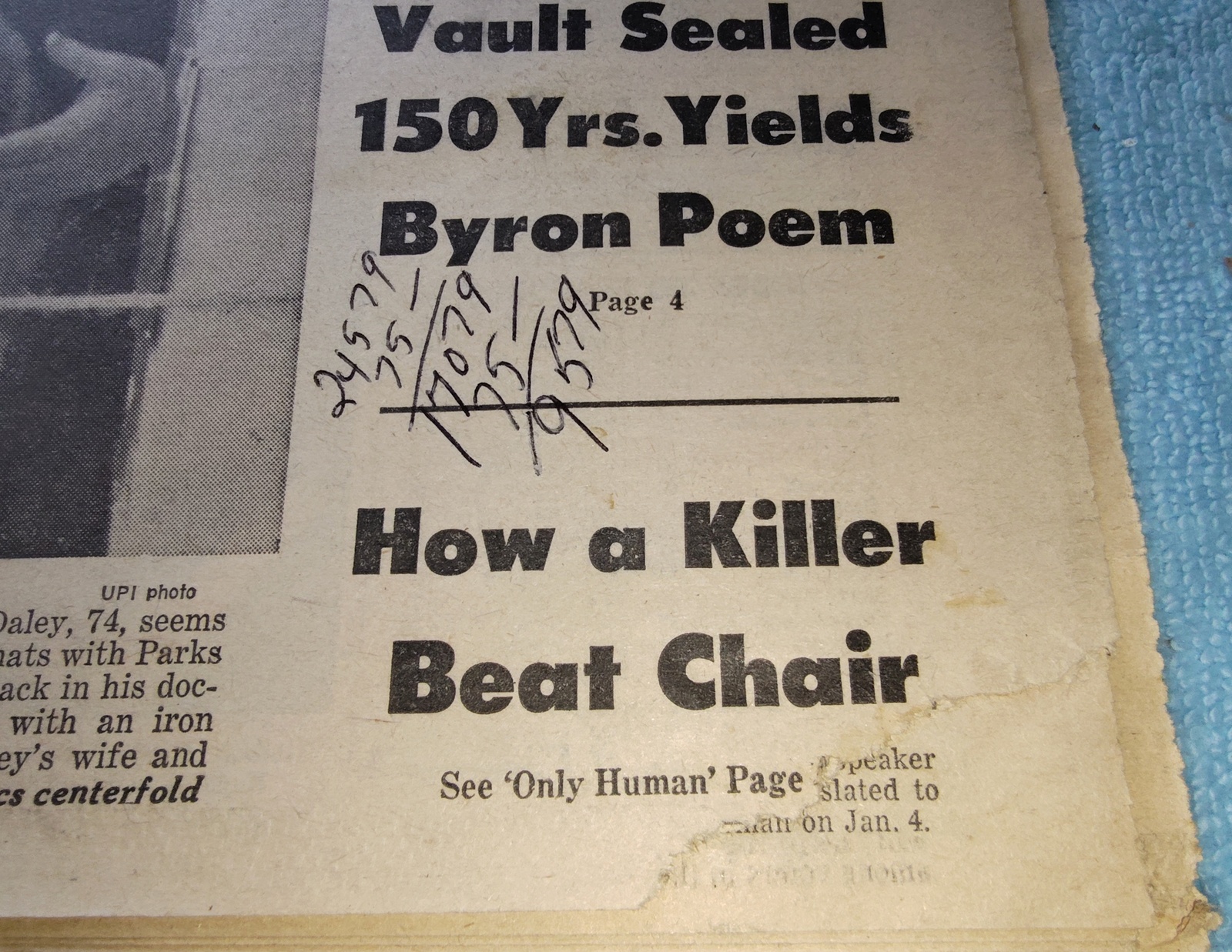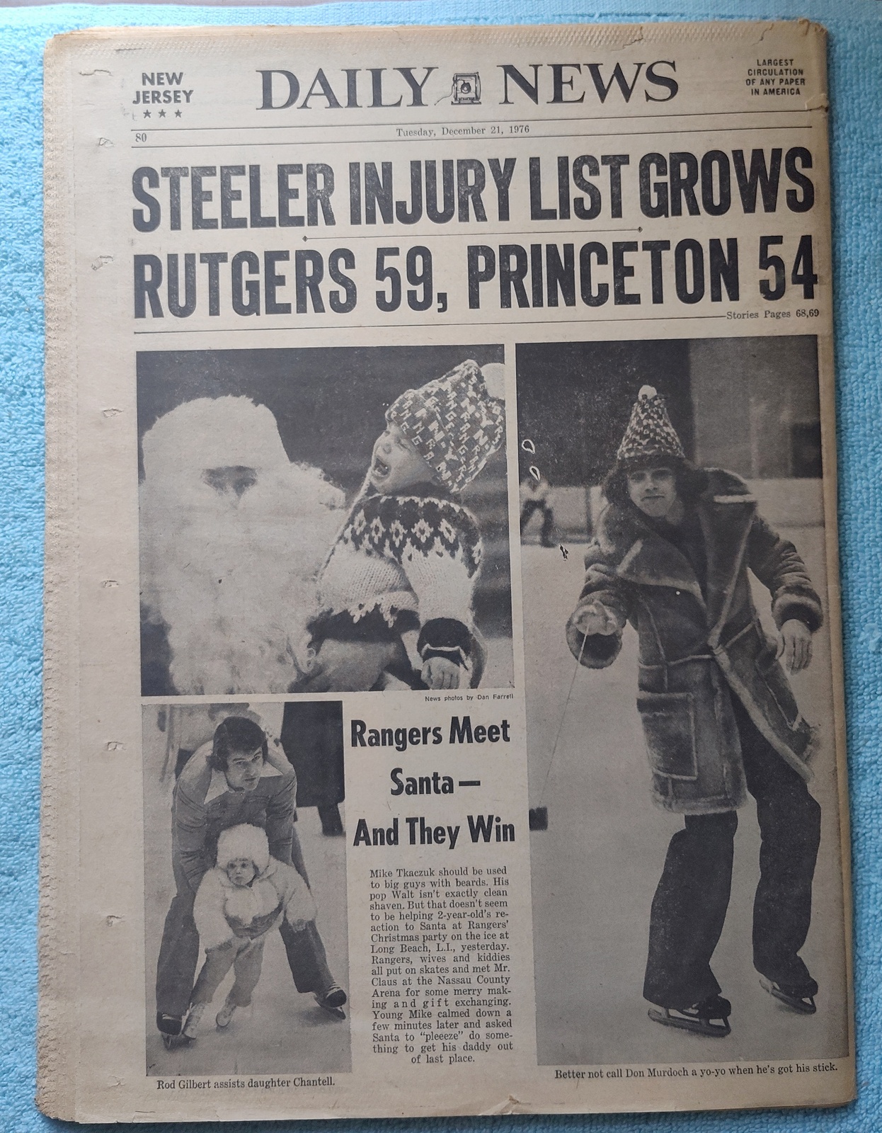 New York Daily News (New Jersey Edition) – Tuesday, December 21, 1976. This old newspaper features on the front page a picture of Chicago mayor Richard J. Daley just hours before he is stricken with a heart attack. The headline is: ‘Mayor Daley Dies At 74’ and ‘Inside: Court Upholds Limiting of Beach Use, Vault Sealed 150Yrs. Yields Byron Poem’ – The back page features pictures of the NY Rangers’ Christmas party with their families. What you see in the pictures is what you get.