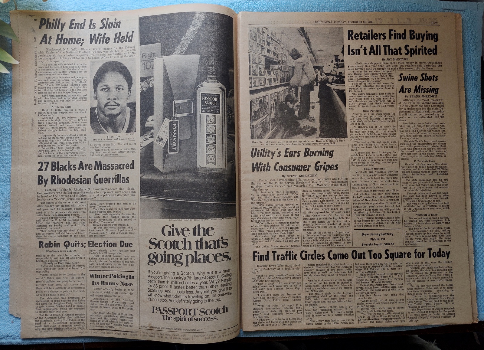 - ‘Philly End Is Slain At Home; Wife Held’ – Professional Footballer, Blenda Gay, died of a stab wound to his neck. His wife, Roxanne, was charged with homicide.