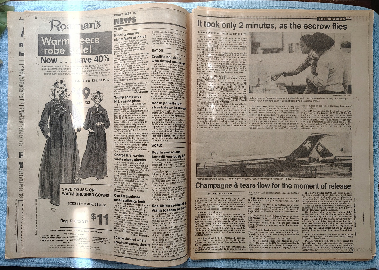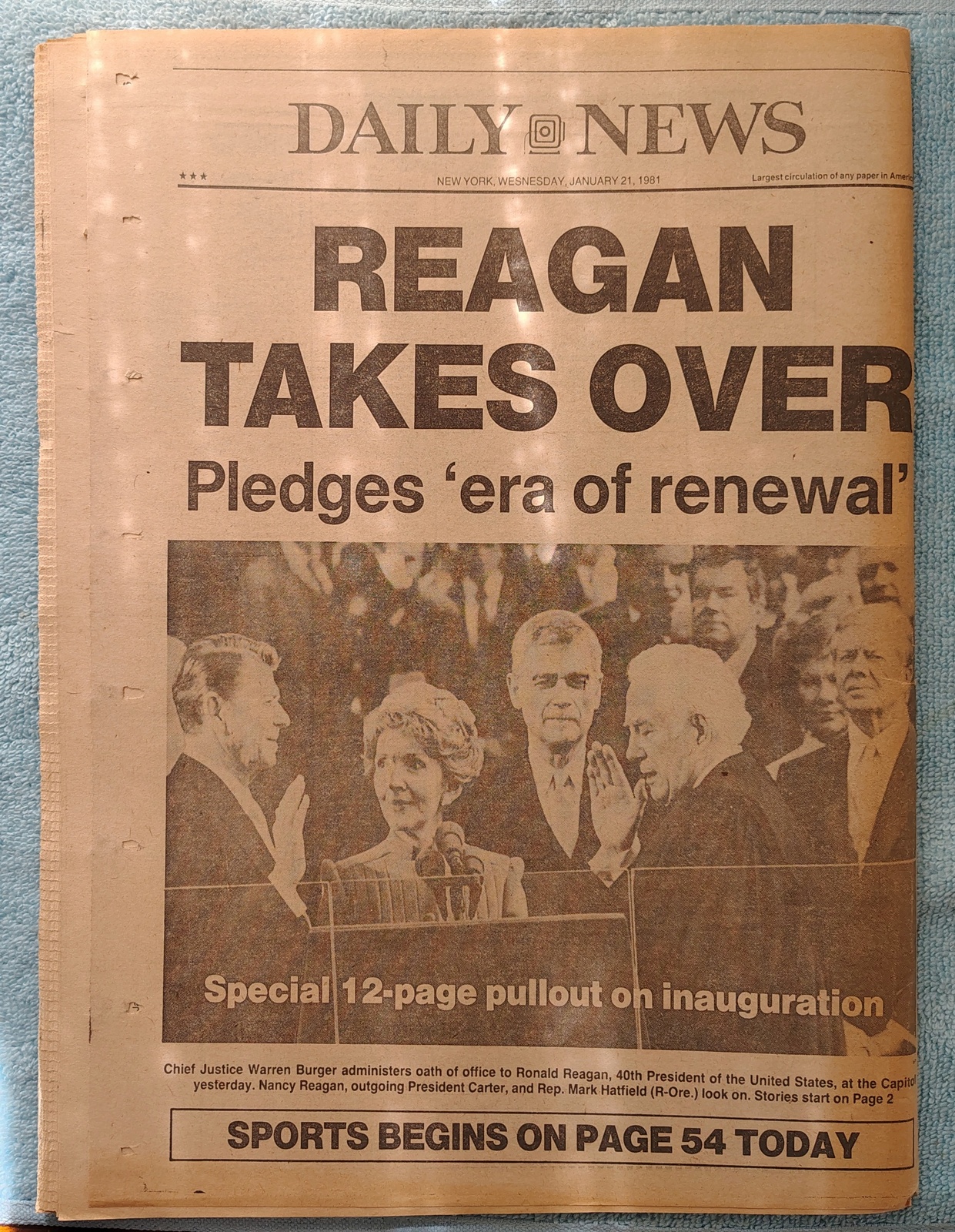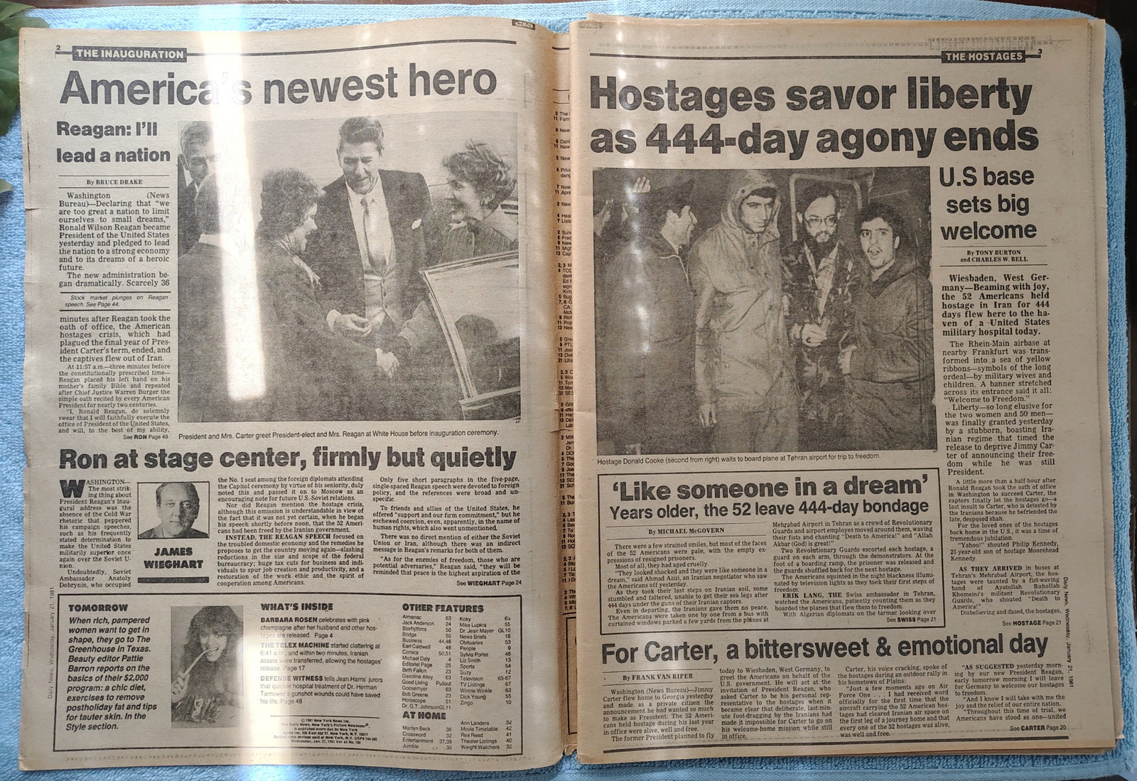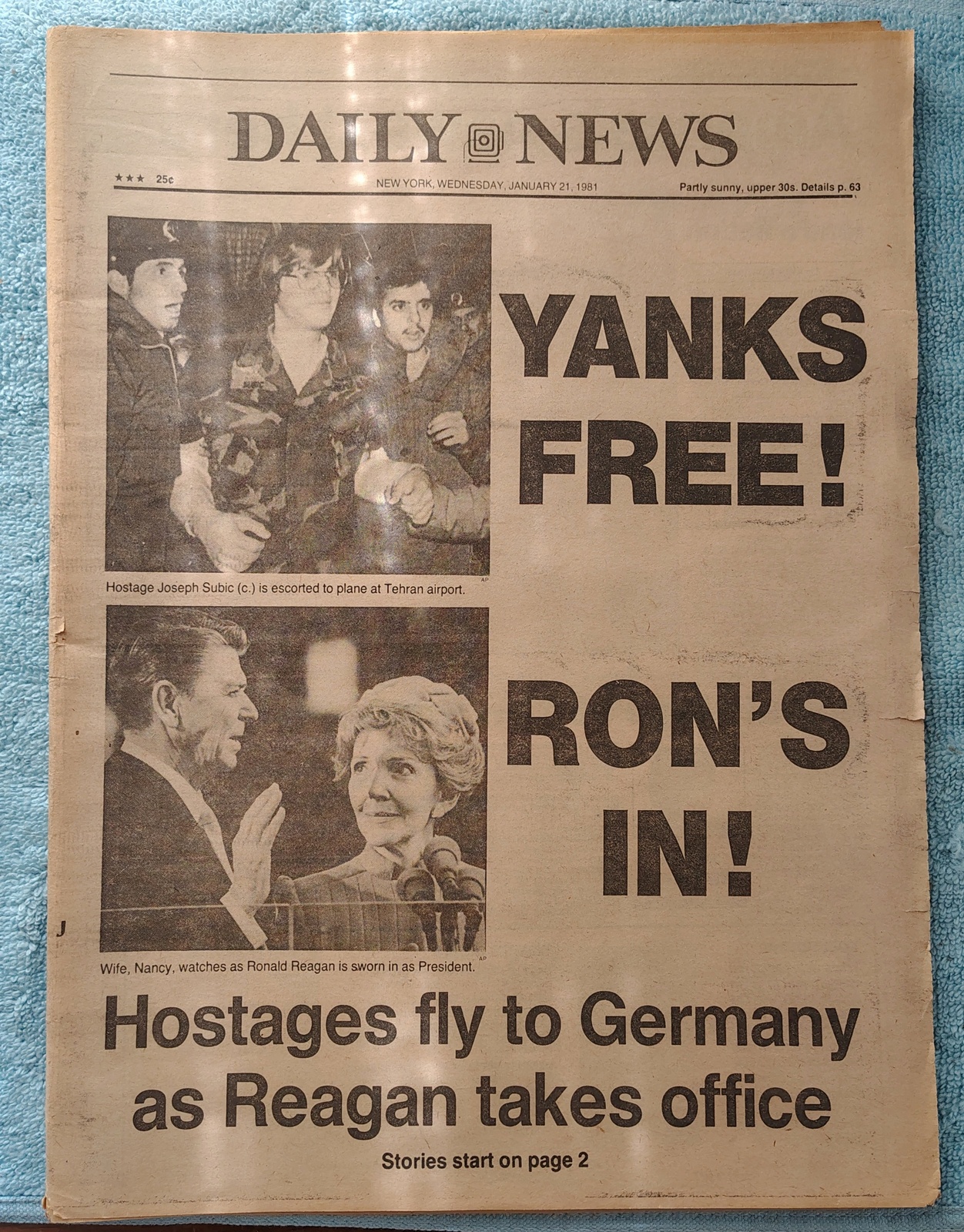 New York Daily News – Wednesday, January 21, 1981. This old newspaper features on the front page a picture of hostage Joseph Subic being escorted to a plane in Tehran and Nancy Reagan watching as Ronald Reagan is sworn in as president. The headline is: ‘Yanks Free!’ and ‘Ron’s In’ and ‘Hostages fly to Germany as Reagan takes office’ – What you see in the pictures is what you get.