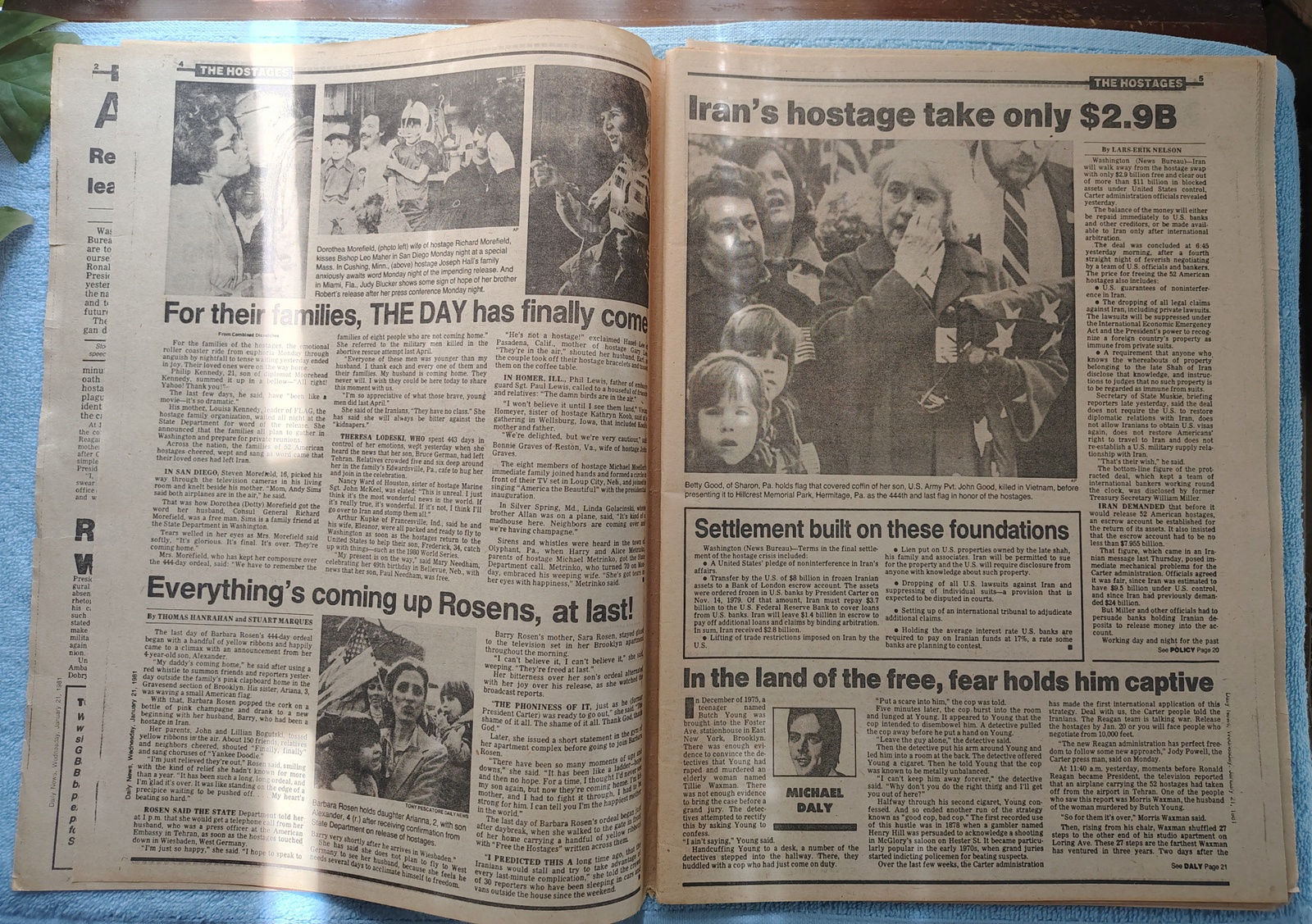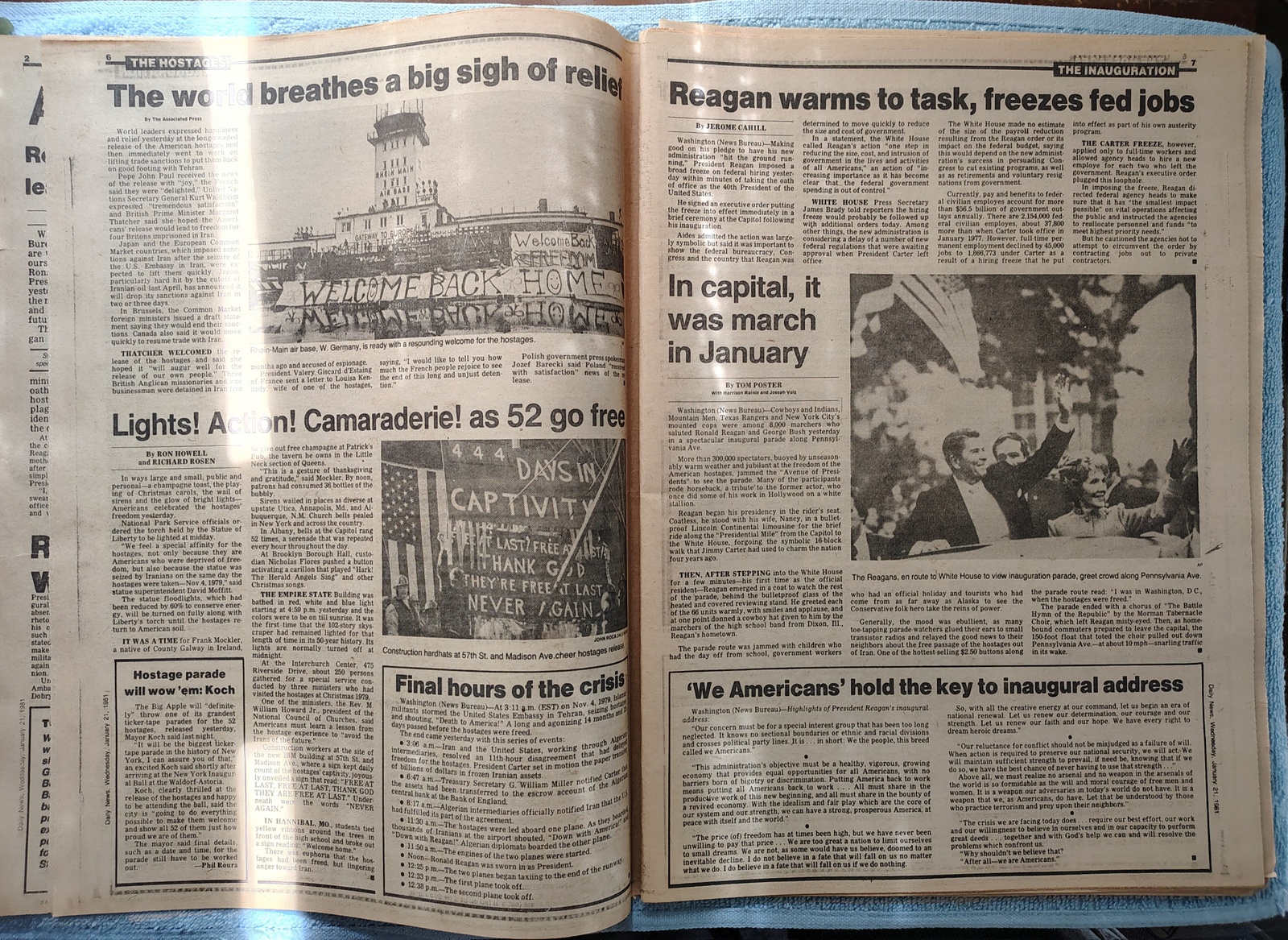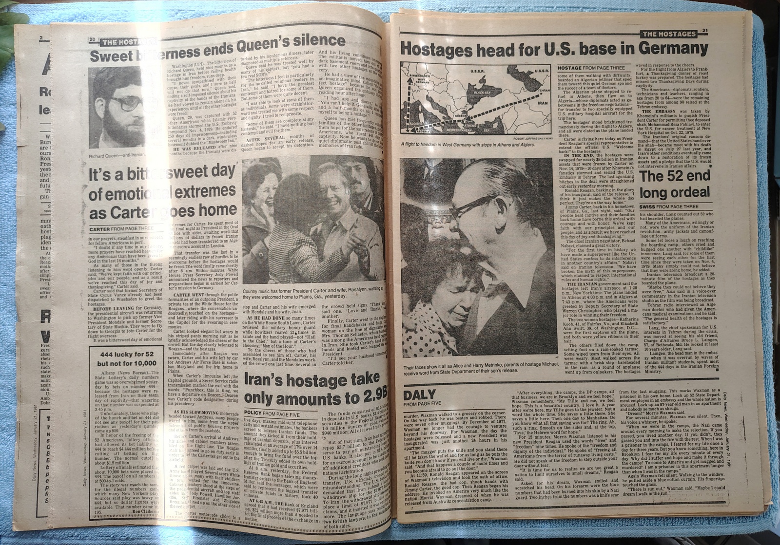 - ‘Hostages savor liberty as 444-day agony ends’ ‘U.S. base sets big welcome’ – The 52 Americans held hostage in Iran flew to a military base in Germany after being freed.