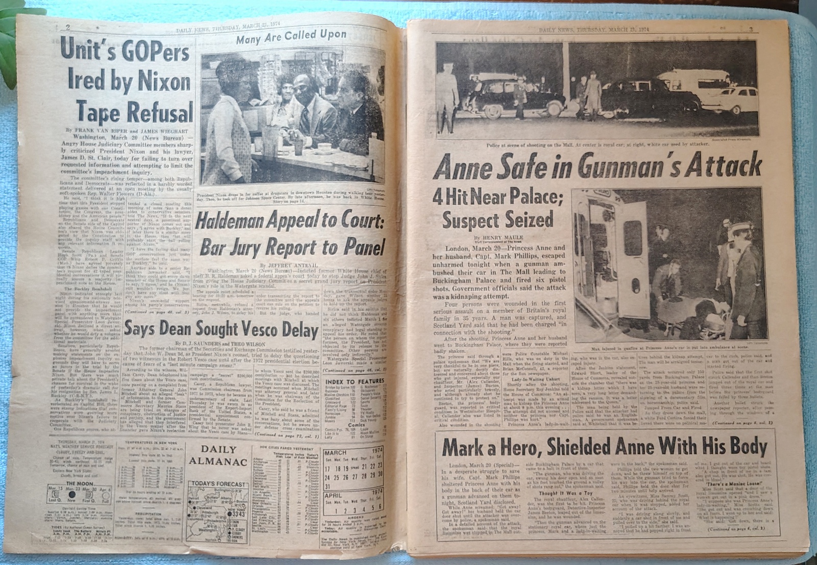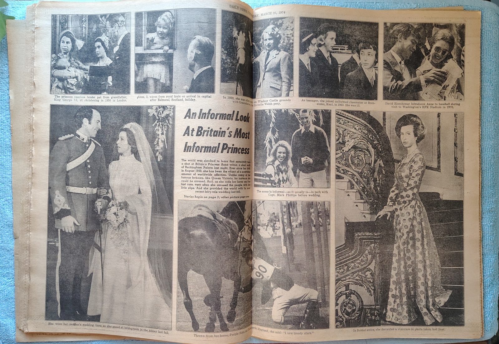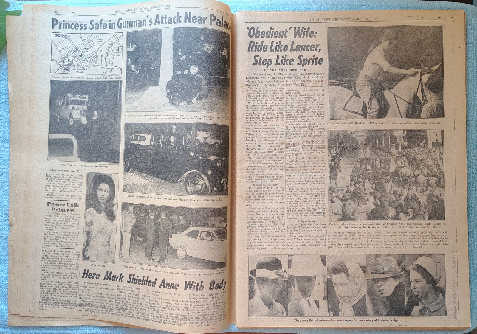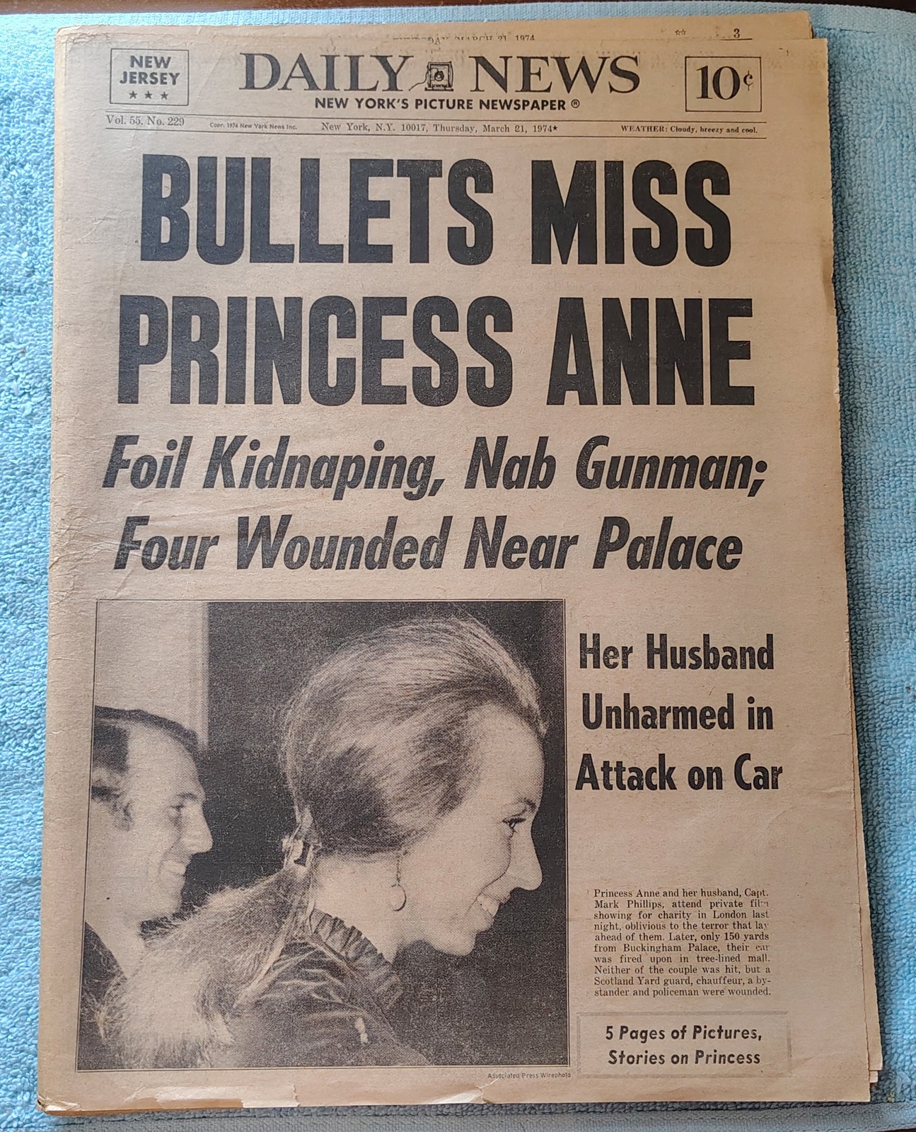 New York Daily News – Thursday, March 21, 1974. The headline is: ‘Bullets Miss Princess Anne’ ‘Foil Kidnapping, Nab Gunman, Four Wounded Near Palace’ The front page features a picture of Princess Anne and her husband, Capt. Mark Phillips smiling at a charity event only hours before a gunman’s attack. What you see in the pictures is what you get.