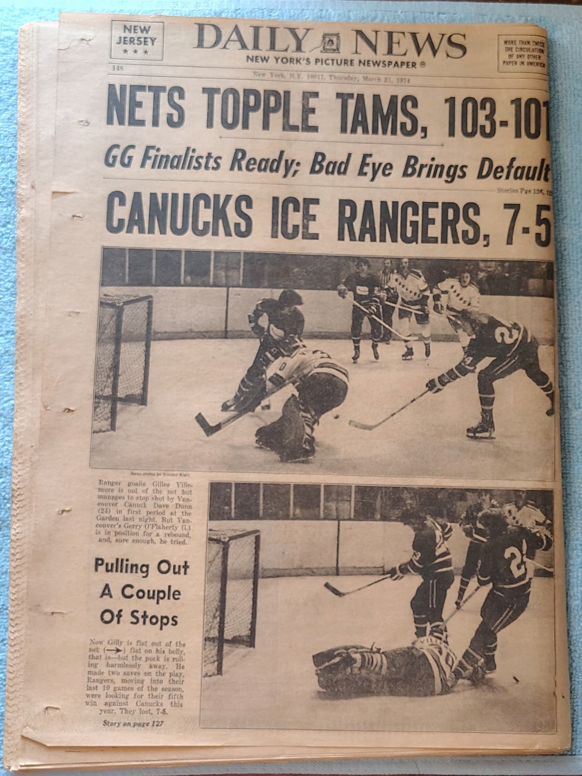- The back page features pictures of professional hockey action as the Canucks defeat the Rangers.