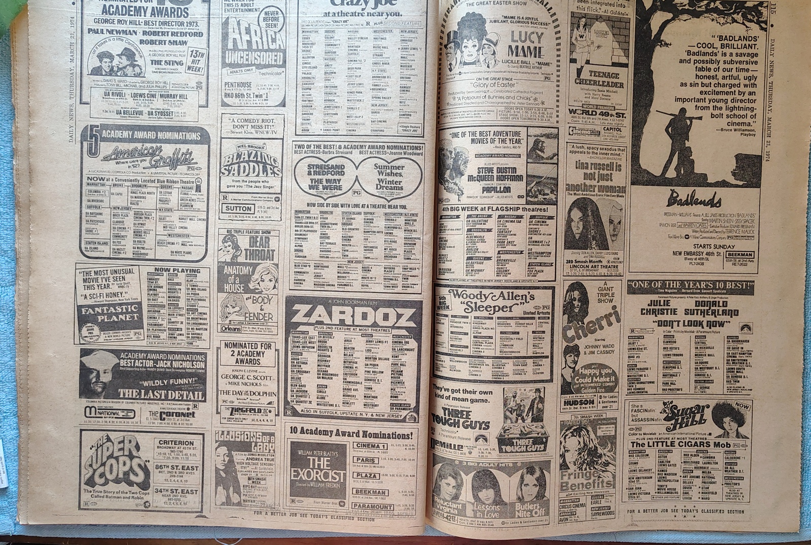 - Movie ads include: Zardoz, The Last Detail, The Sting, Papillon, The Great Gatsby, Blazing Saddles, and more.