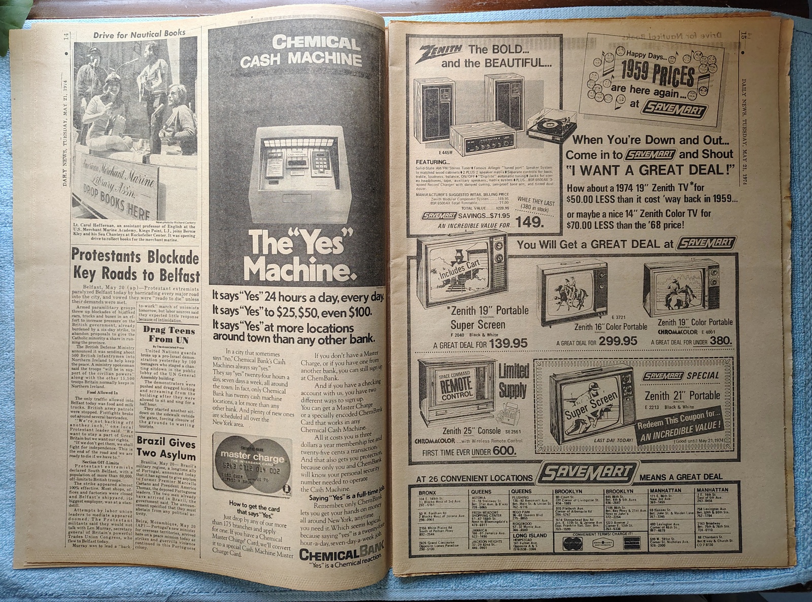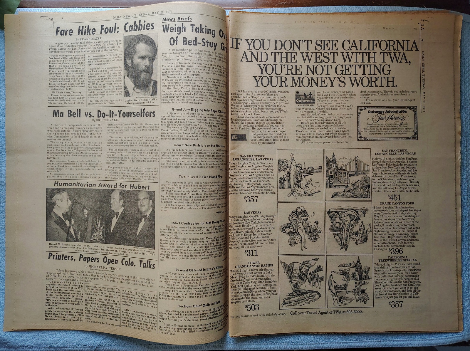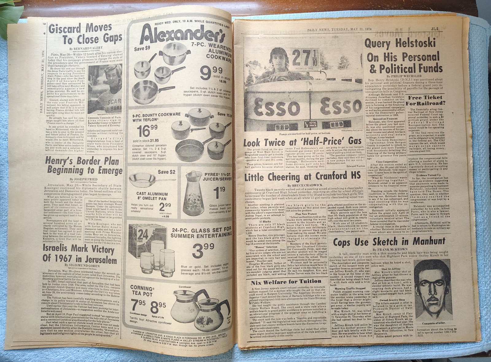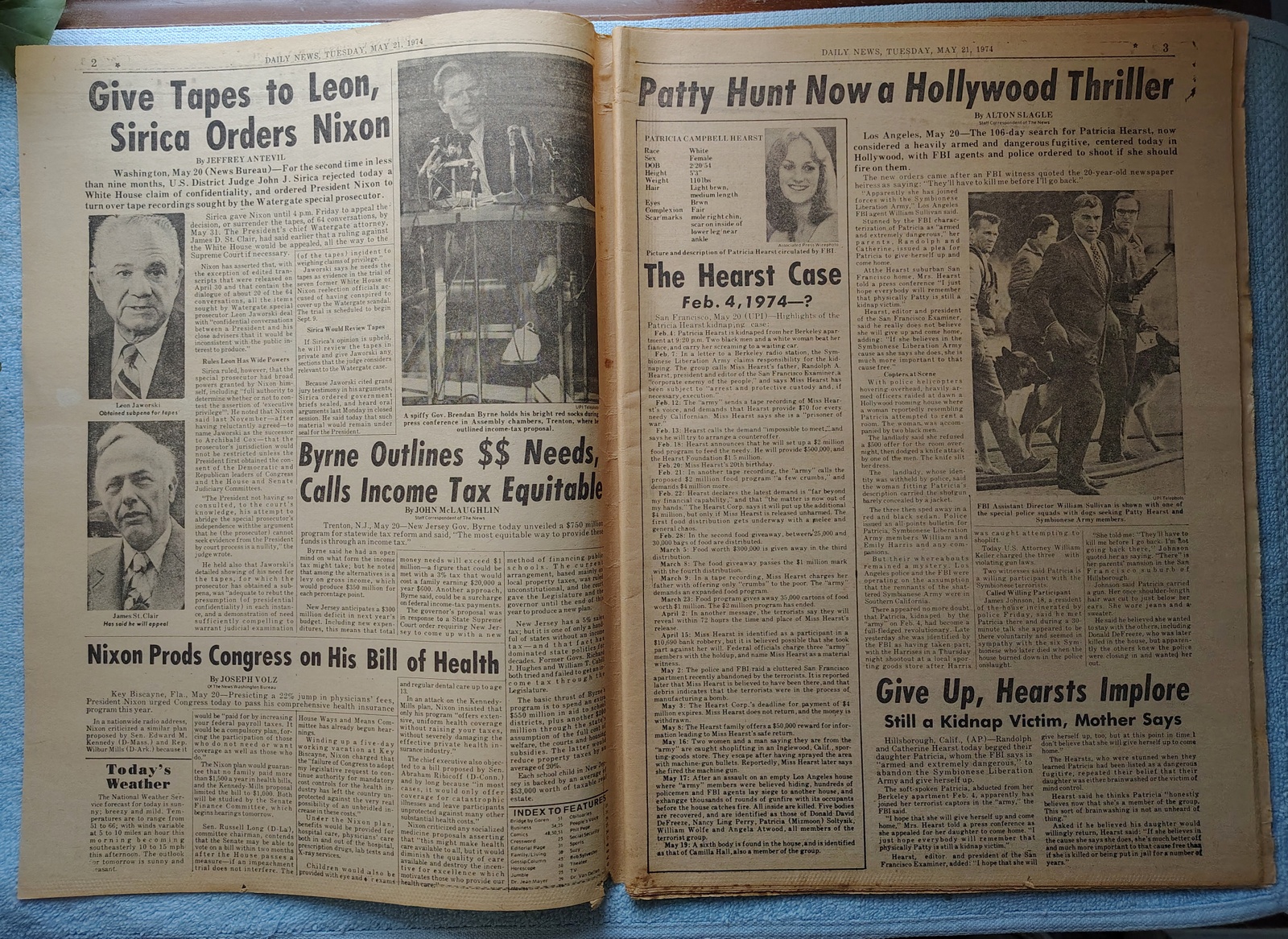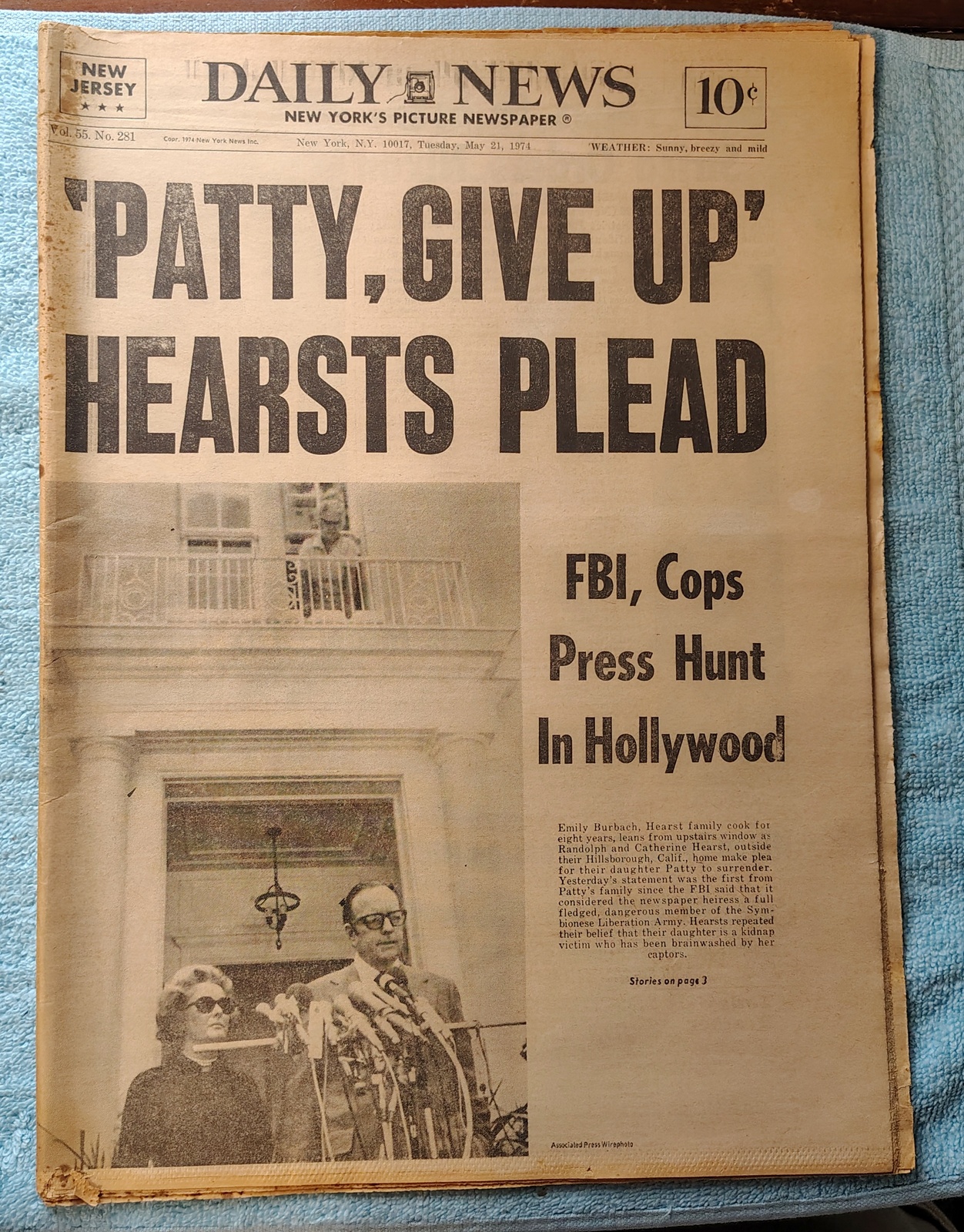 New York Daily News (New Jersey Edition) – Tuesday, May 21, 1974. The headline is: ”Patty, Give Up’ Hearsts Plead’ ‘FBI, Cops Press Hunt In Hollywood’ The front page features a picture of Randolph and Catherine Hearst urging their daughter to surrender to the FBI. What you see in the pictures is what you get.