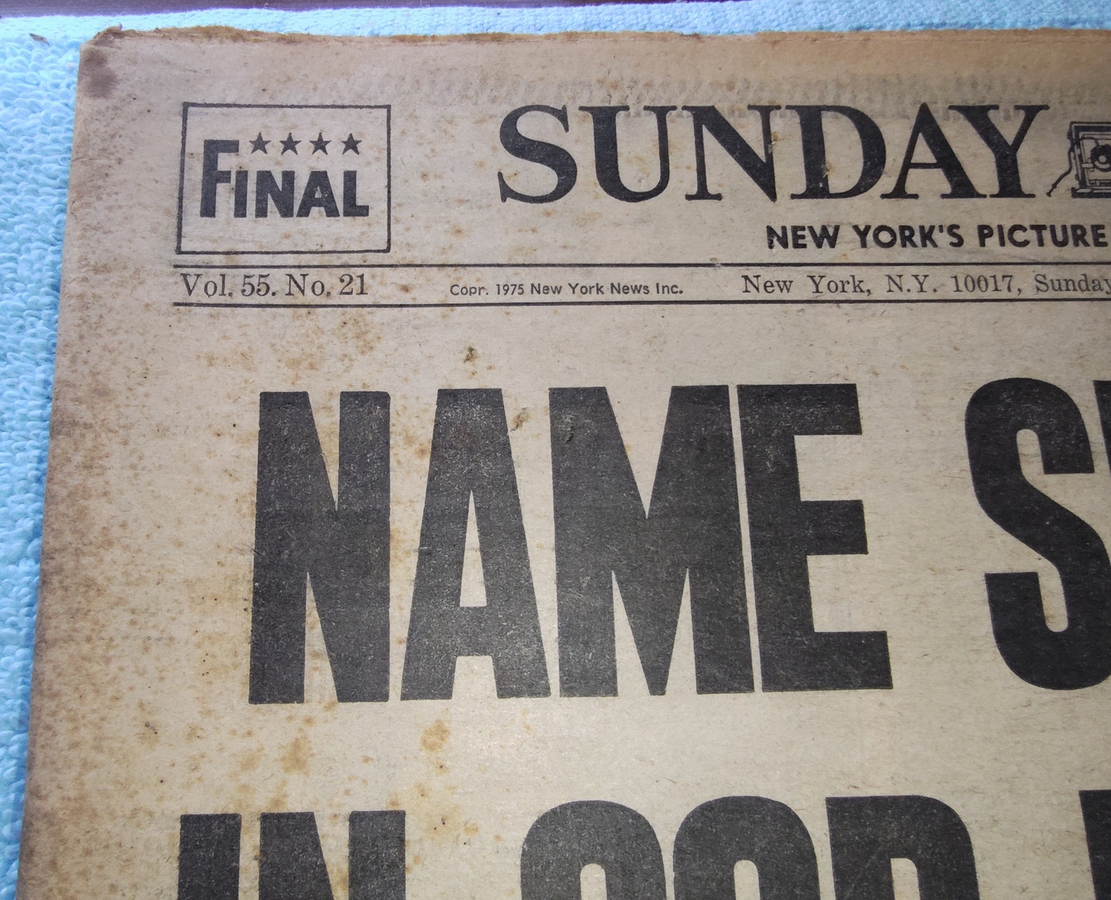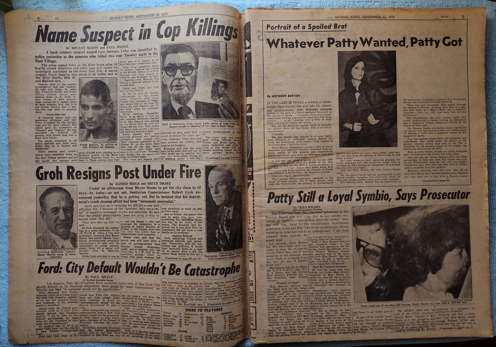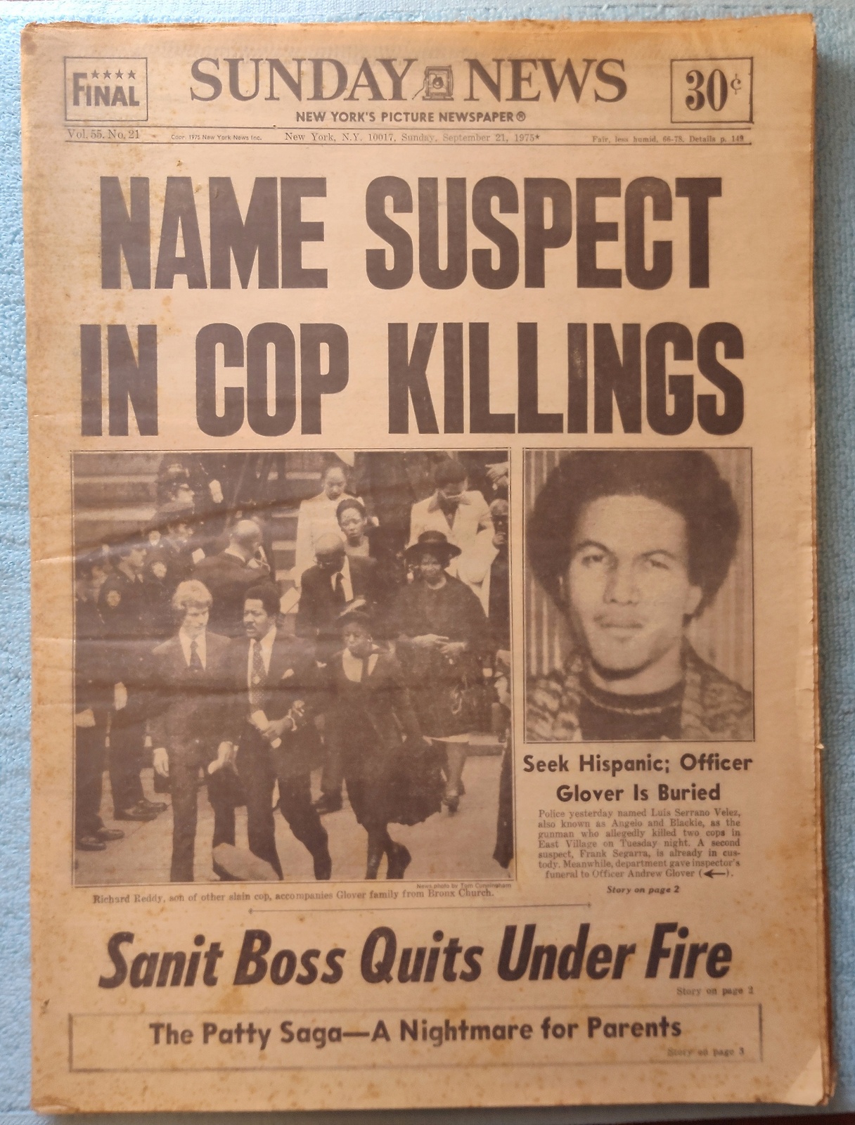 New York Daily News Sunday, September 21, 1975. This old newspaper features on the front page a picture of mourners of recent police killings and a picture of the suspect. The headline is: ‘Name Suspect In Cop Killings’ and ‘Sanit Boss Quits Under Fire’ What you see in the pictures is what you get.