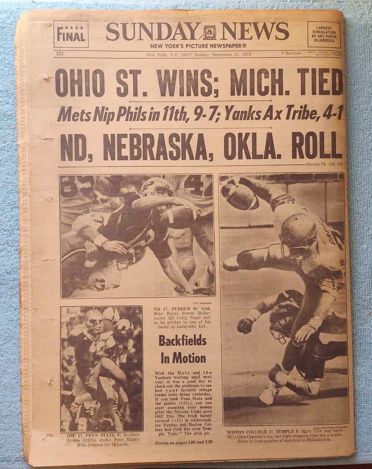 - The back page features pictures of college football action – ‘Ohio St. Wins; Mich. Tied’