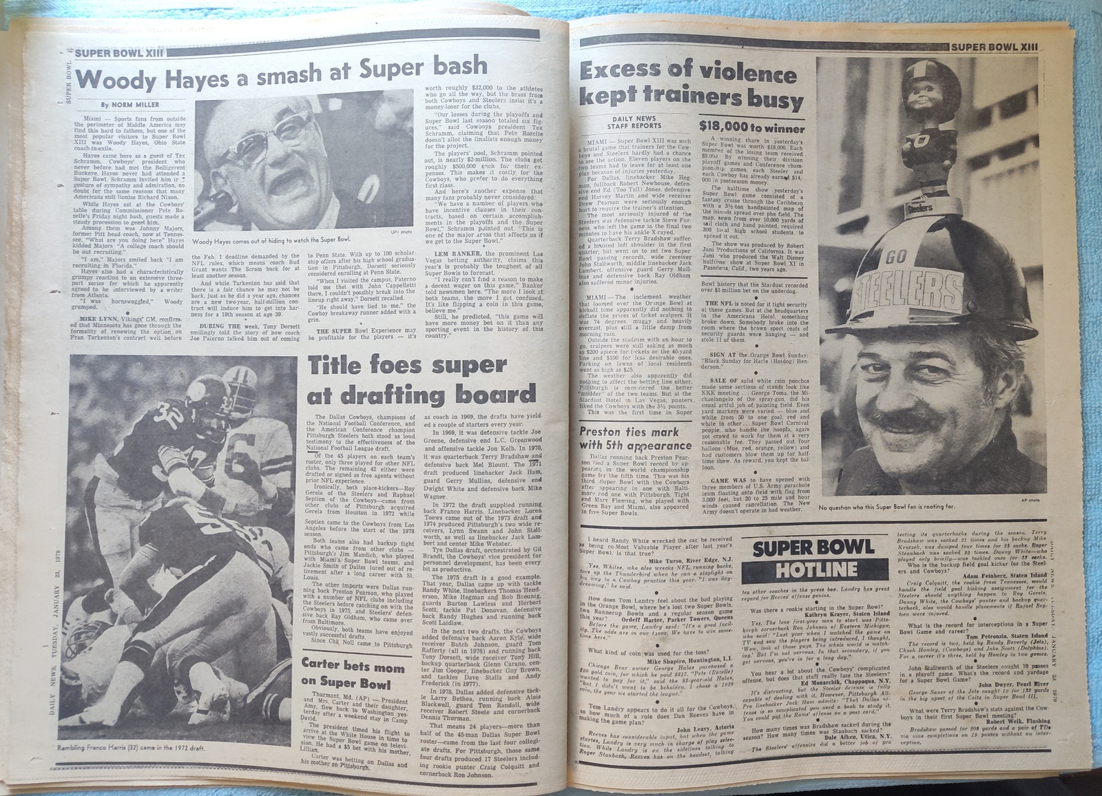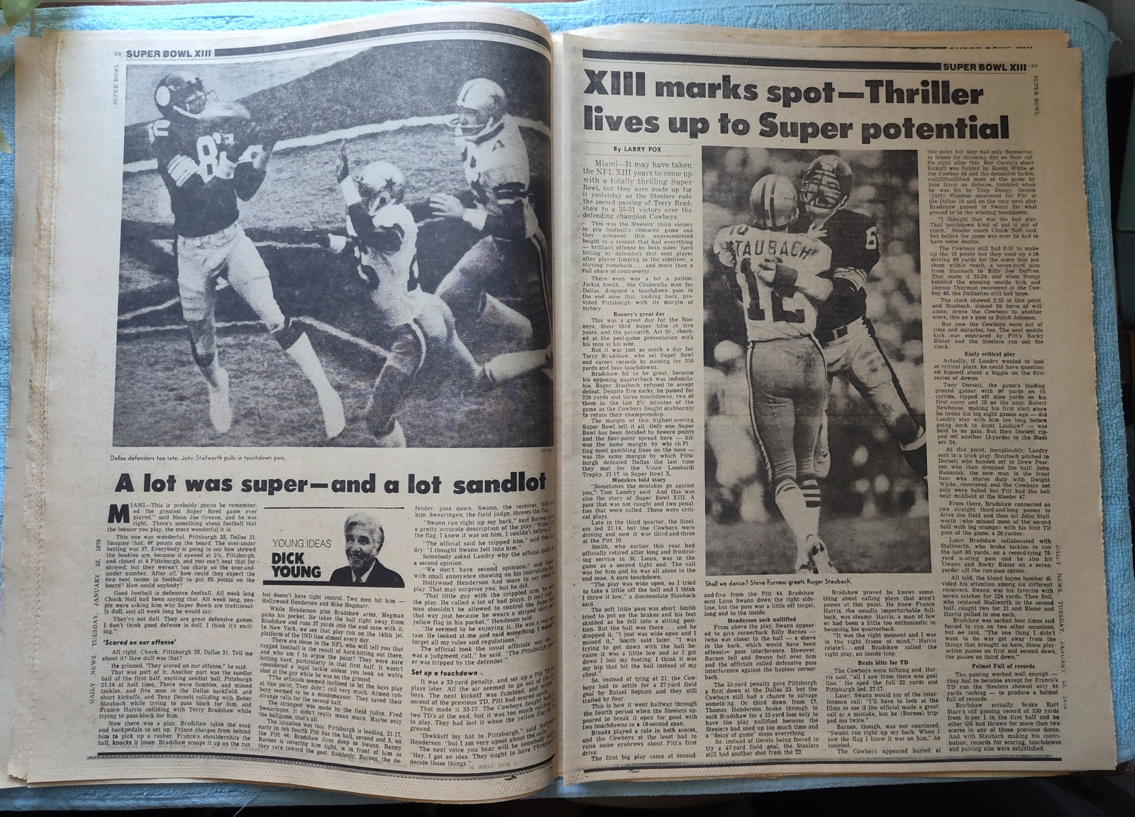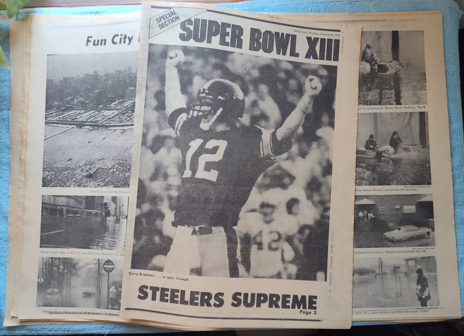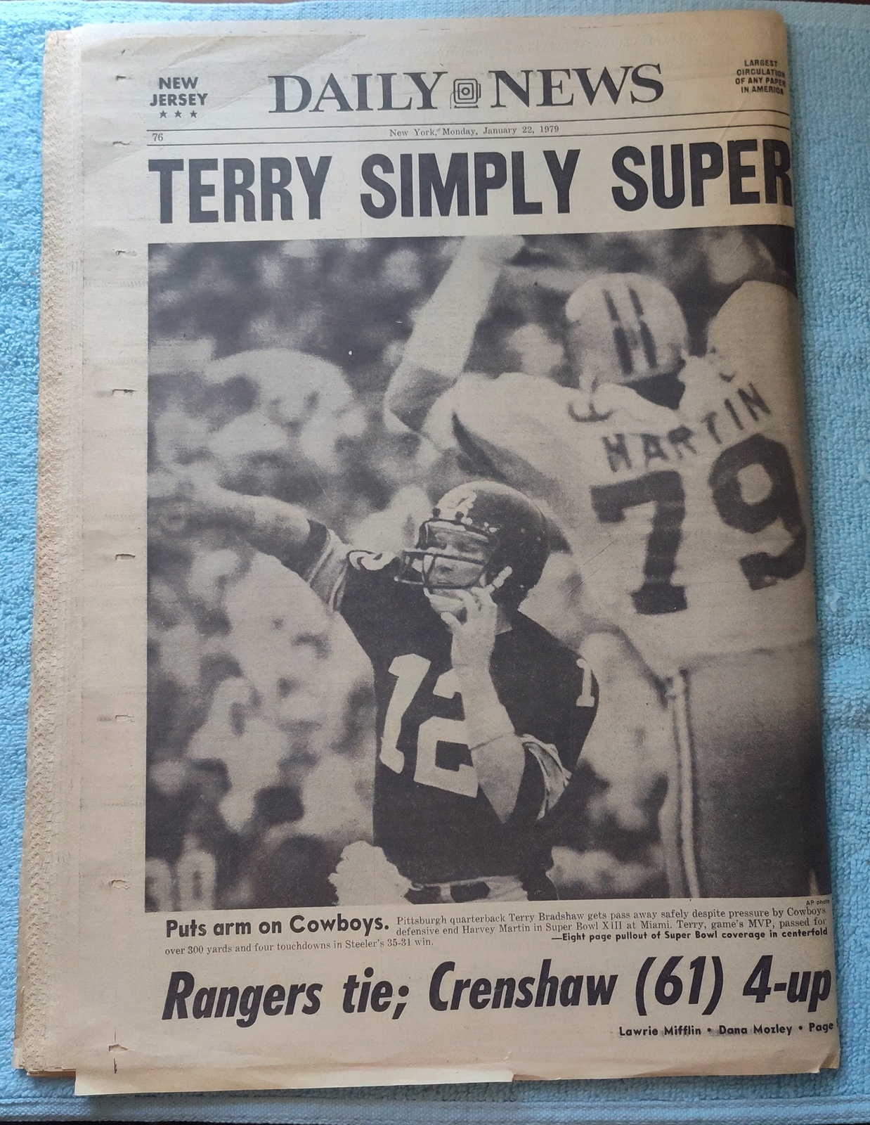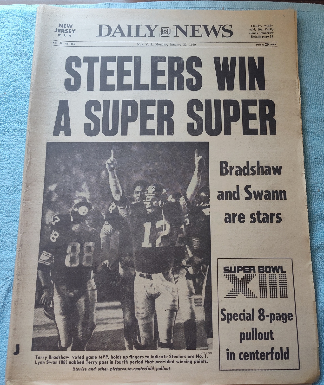 New York Daily News (New Jersey Edition) – Monday, January 22, 1979. This old newspaper features on the front page a picture of Superbowl XIII MVP Terry Bradshaw holding up his Number 1 along with receiver Lynn Swan. The headline is: ‘Steelers Win A Super Super’ ‘Bradshaw and Swann are stars’ What you see in the pictures is what you get.
