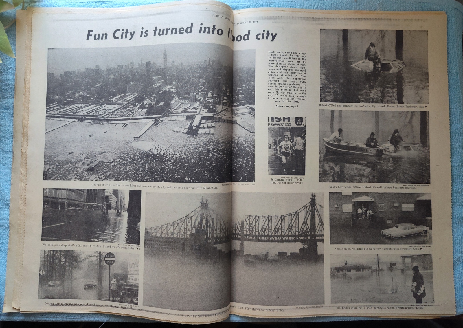 - The centerfold has several pictures of flooding and fog as well as chunks of ice in the Hudson river around midtown.