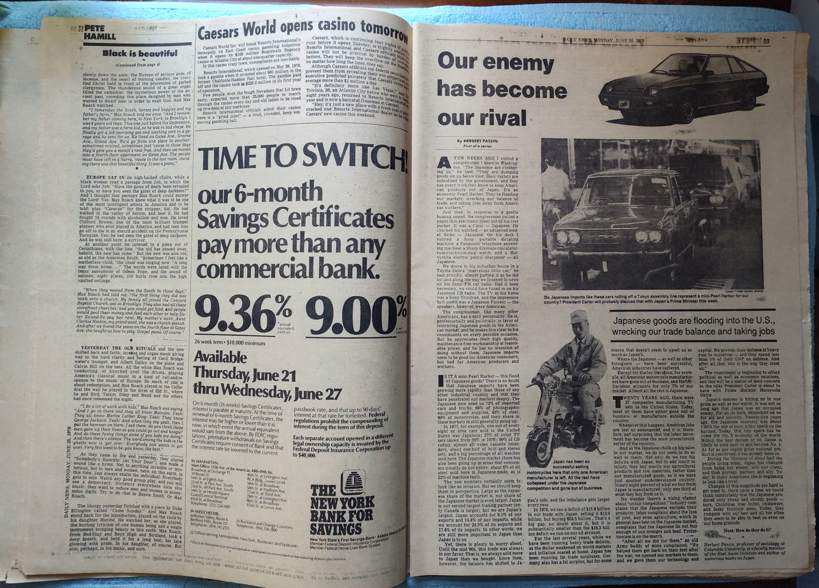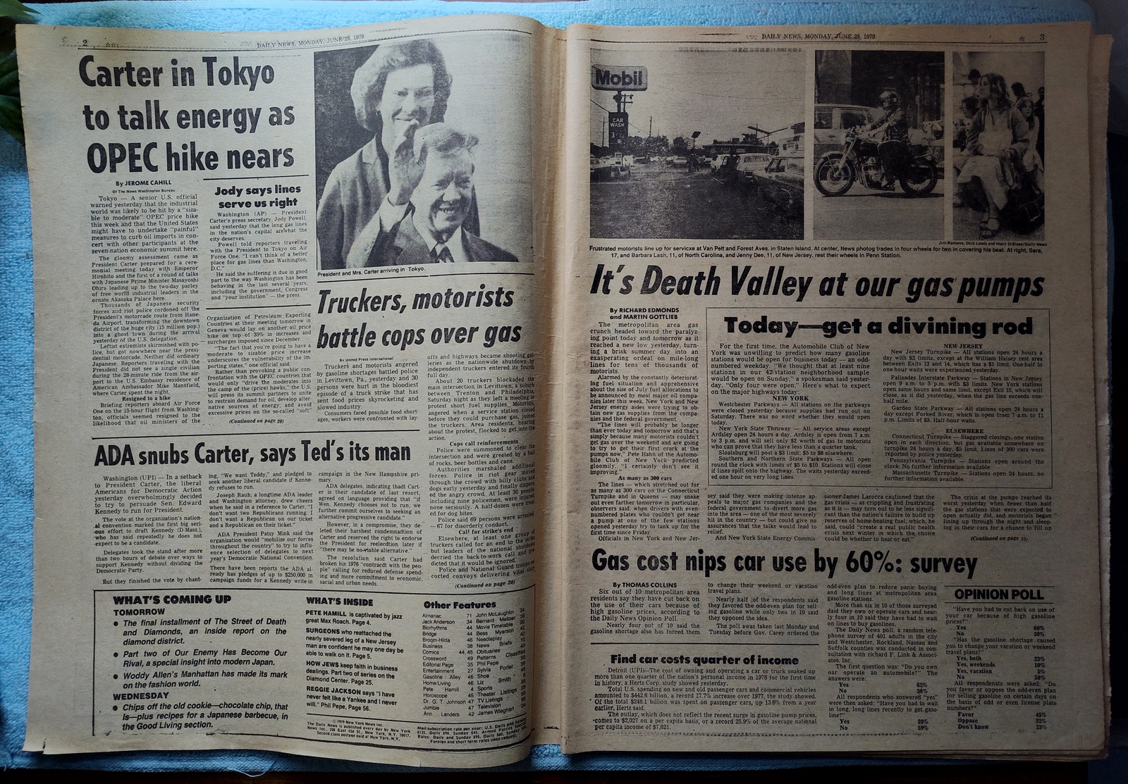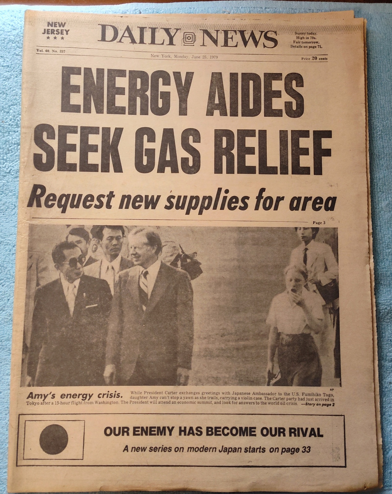 New York Daily News – Monday, June 25, 1979. This old newspaper features on the front page a picture of President Carter walking with Japanese Ambassador Fumihiko Togo with Amy Carter in the background yawning (it was a 15 hour flight to Japan). The headline is: ‘Energy Aides Seek Gas Relief’ and ‘Request new supplies for area’ – What you see in the pictures is what you get.