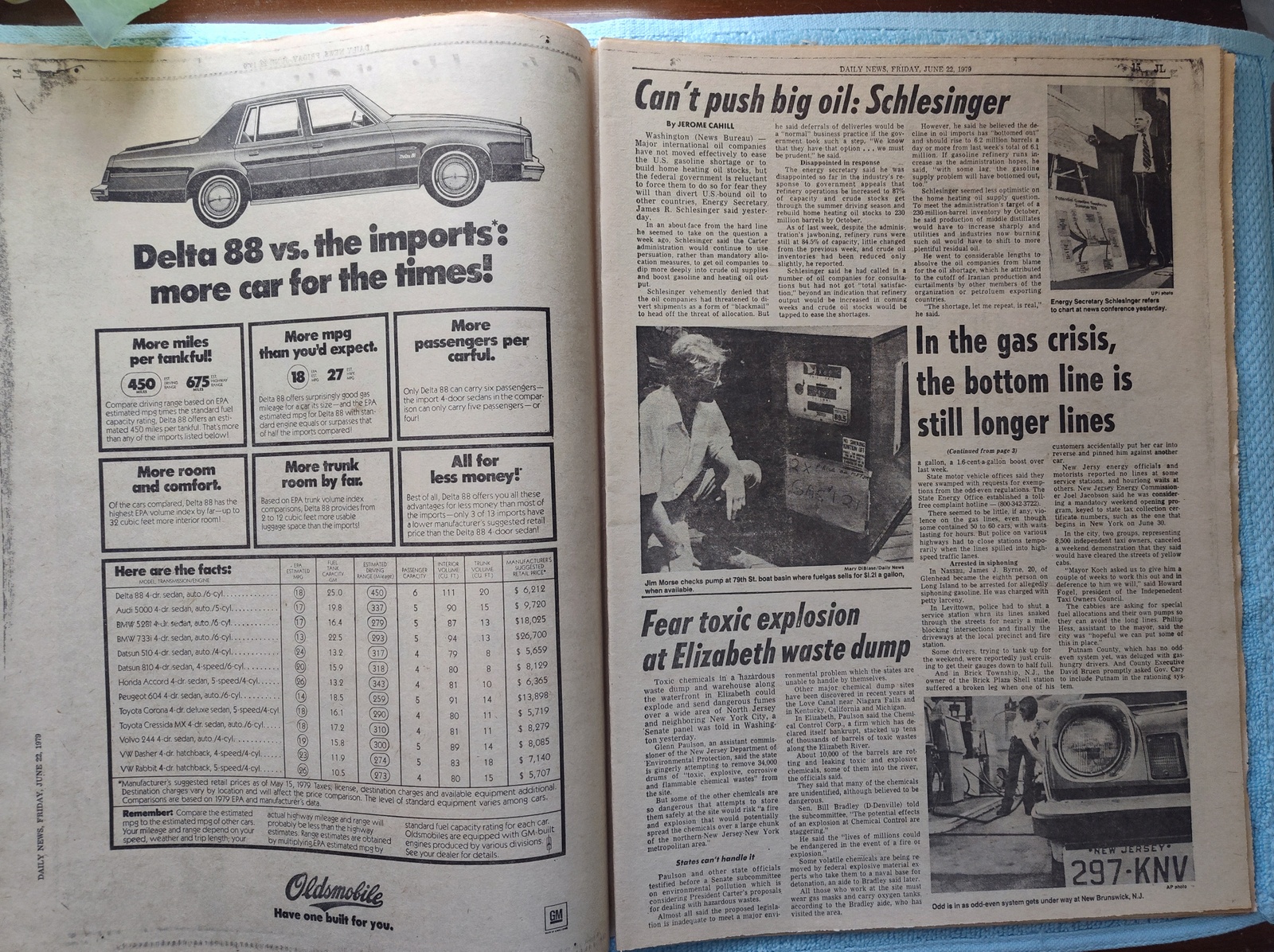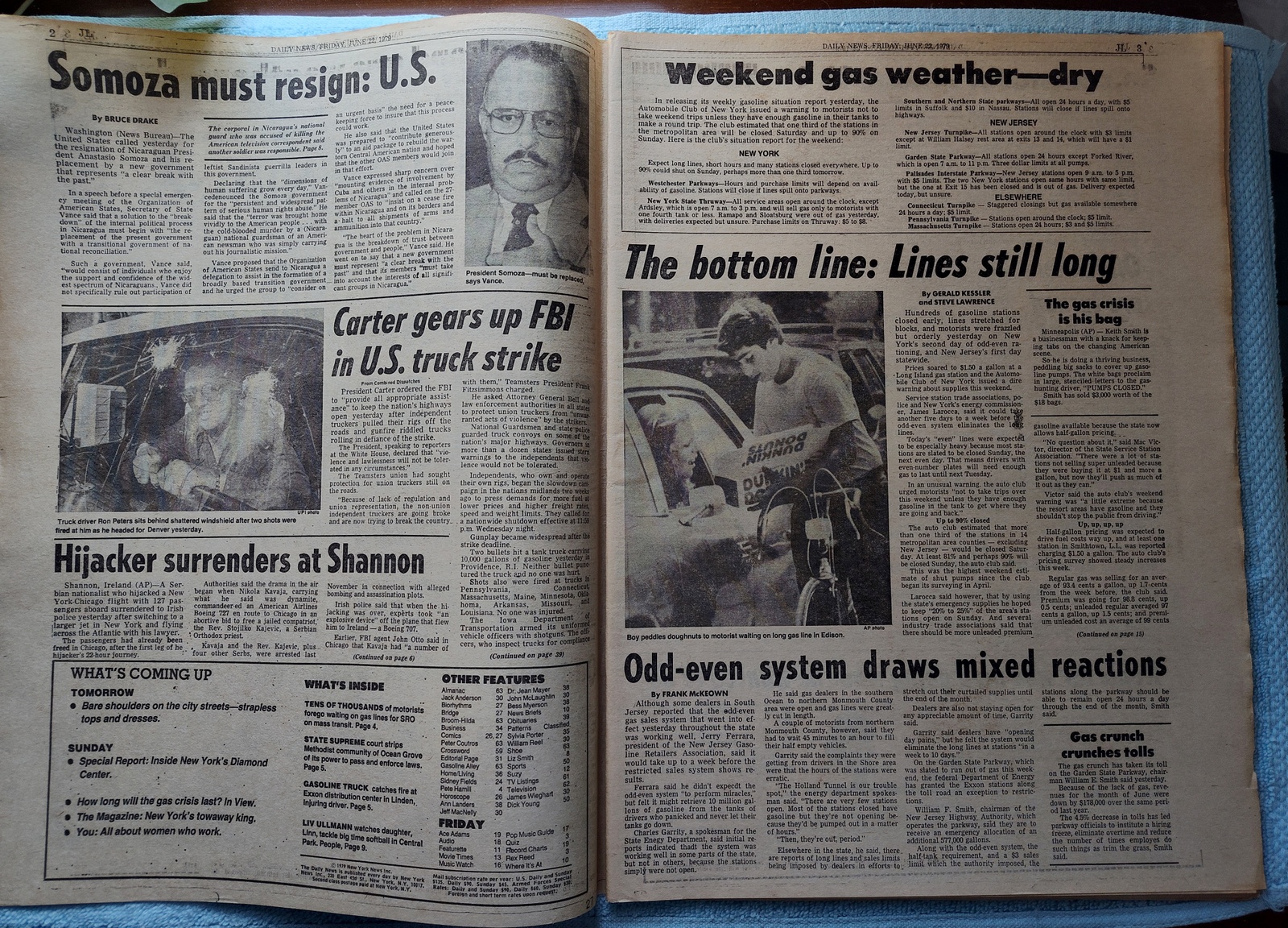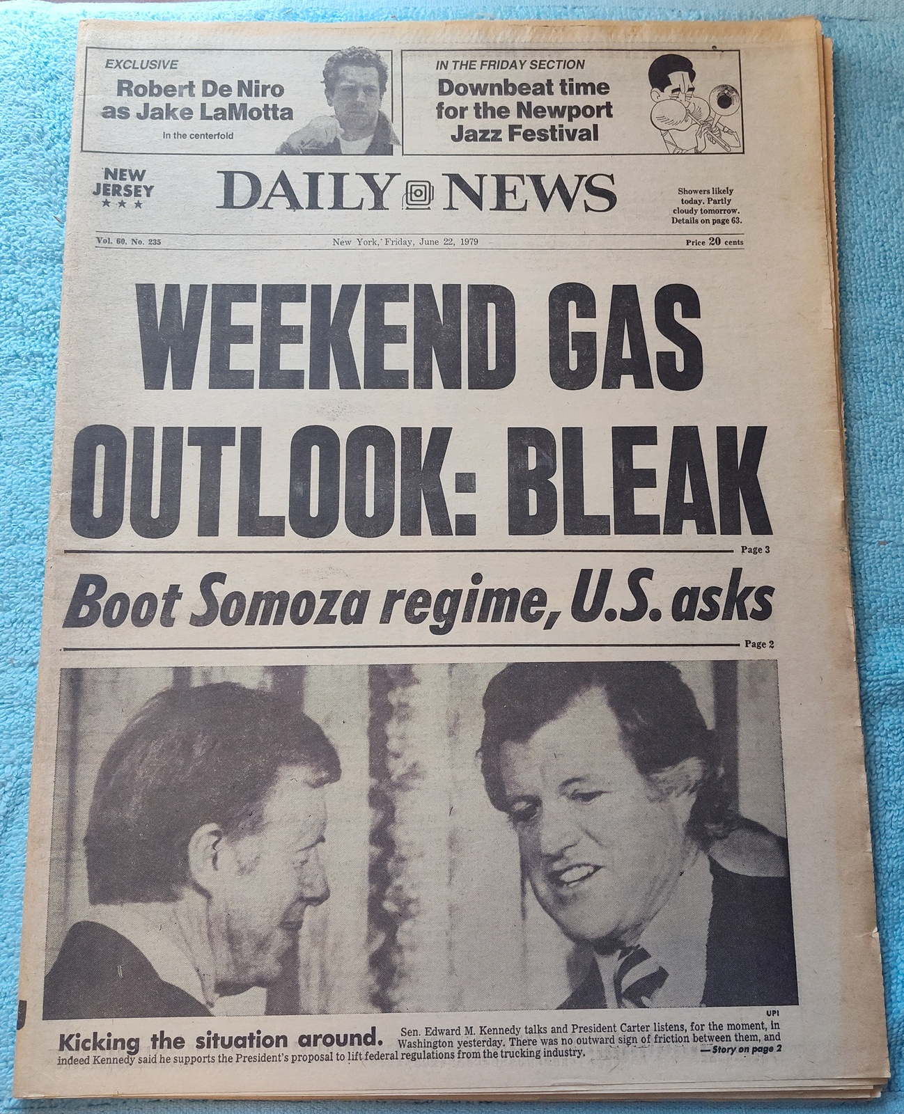 New York Daily News – Friday, June 22, 1979. This old newspaper features on the front page a picture of President Carter talking with Democratic rival Sen. Edward M. Kennedy. The headline is: ‘Weekend Gas Outlook: Bleak’ and ‘Boot Somoza regime, U.S. asks’ – What you see in the pictures is what you get.