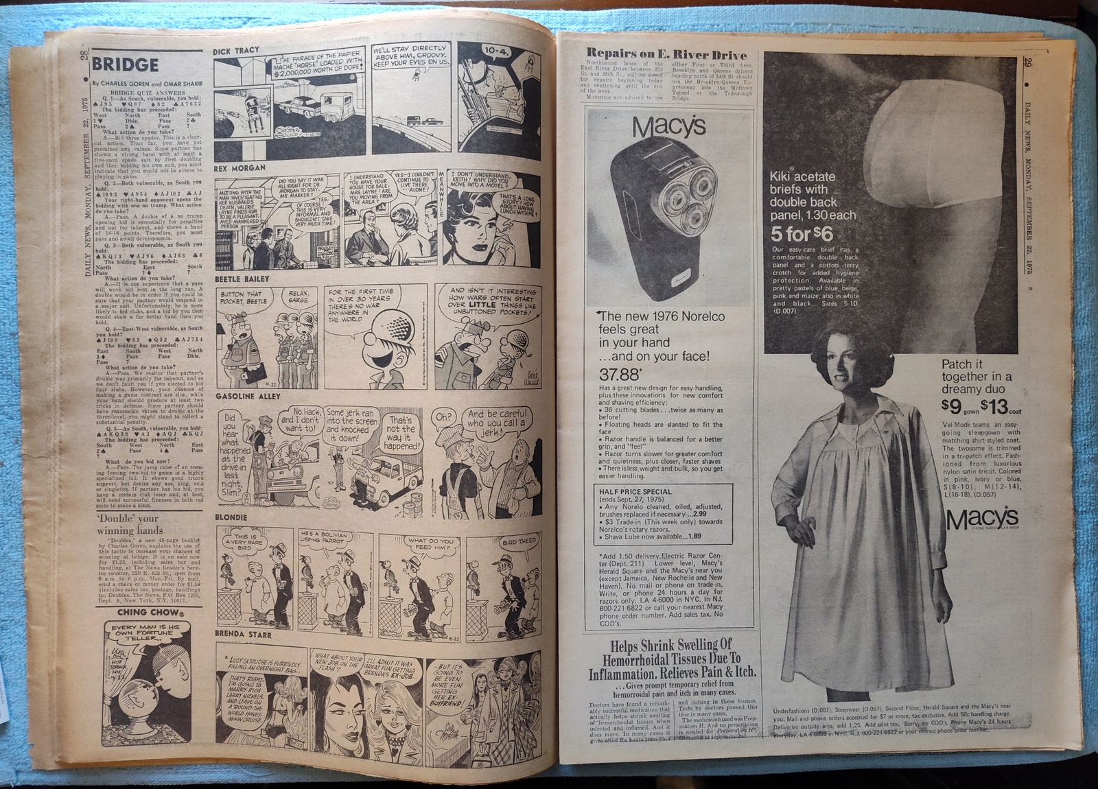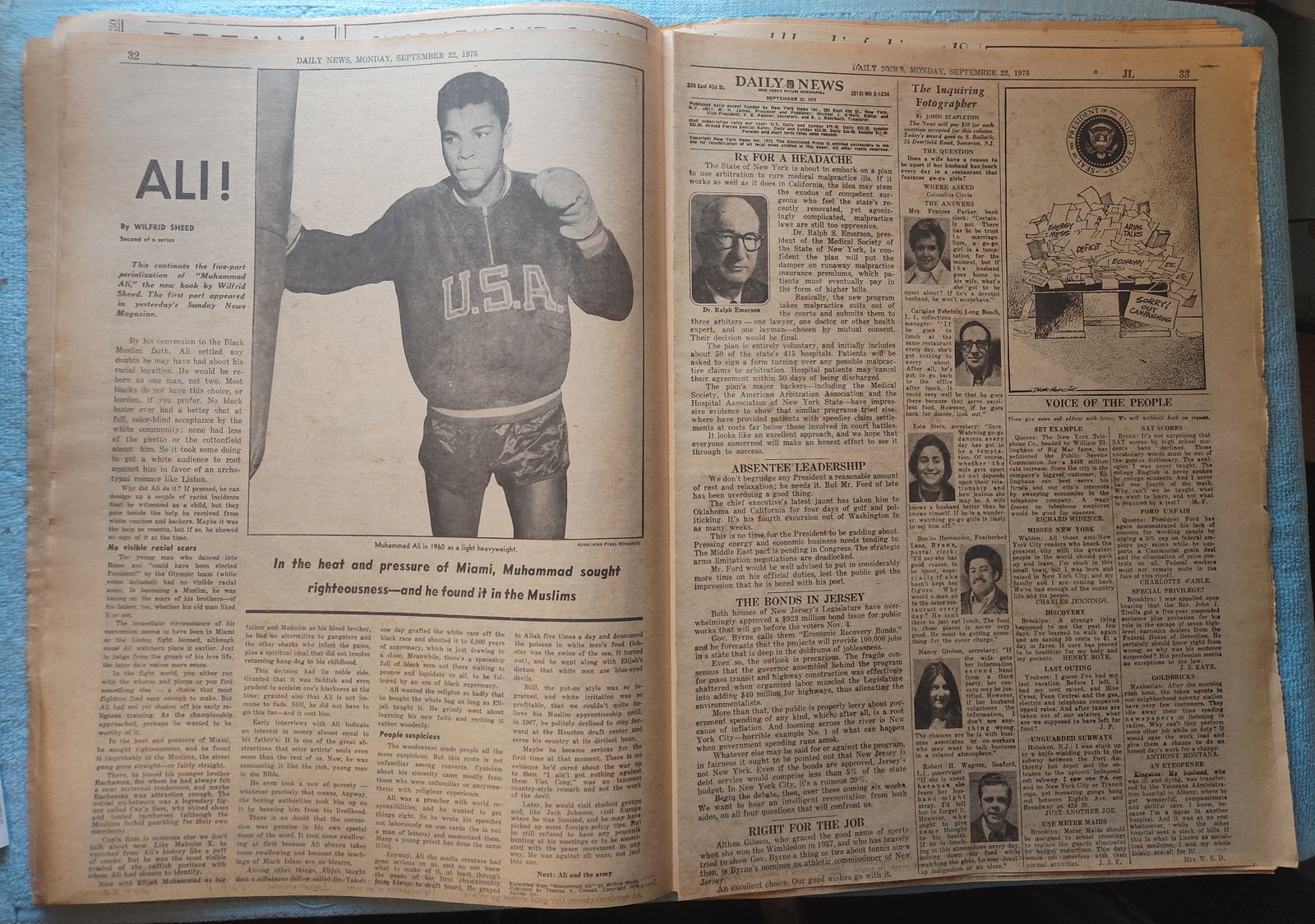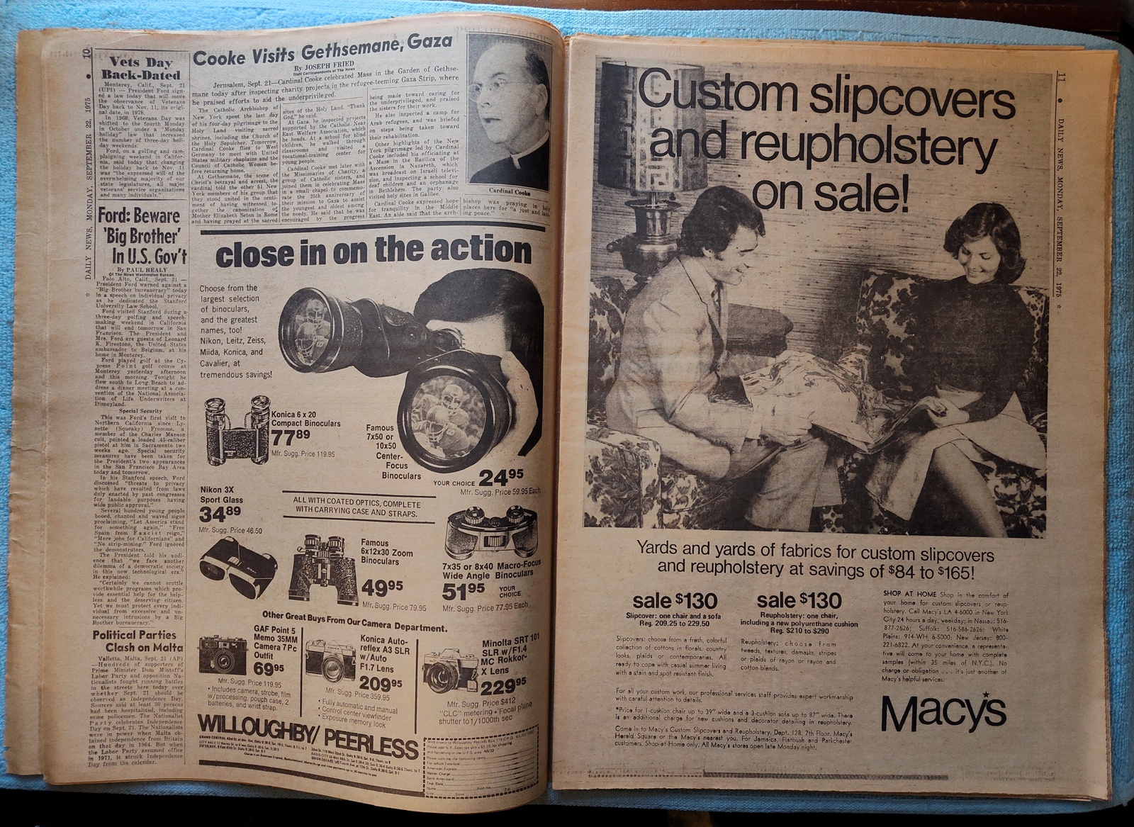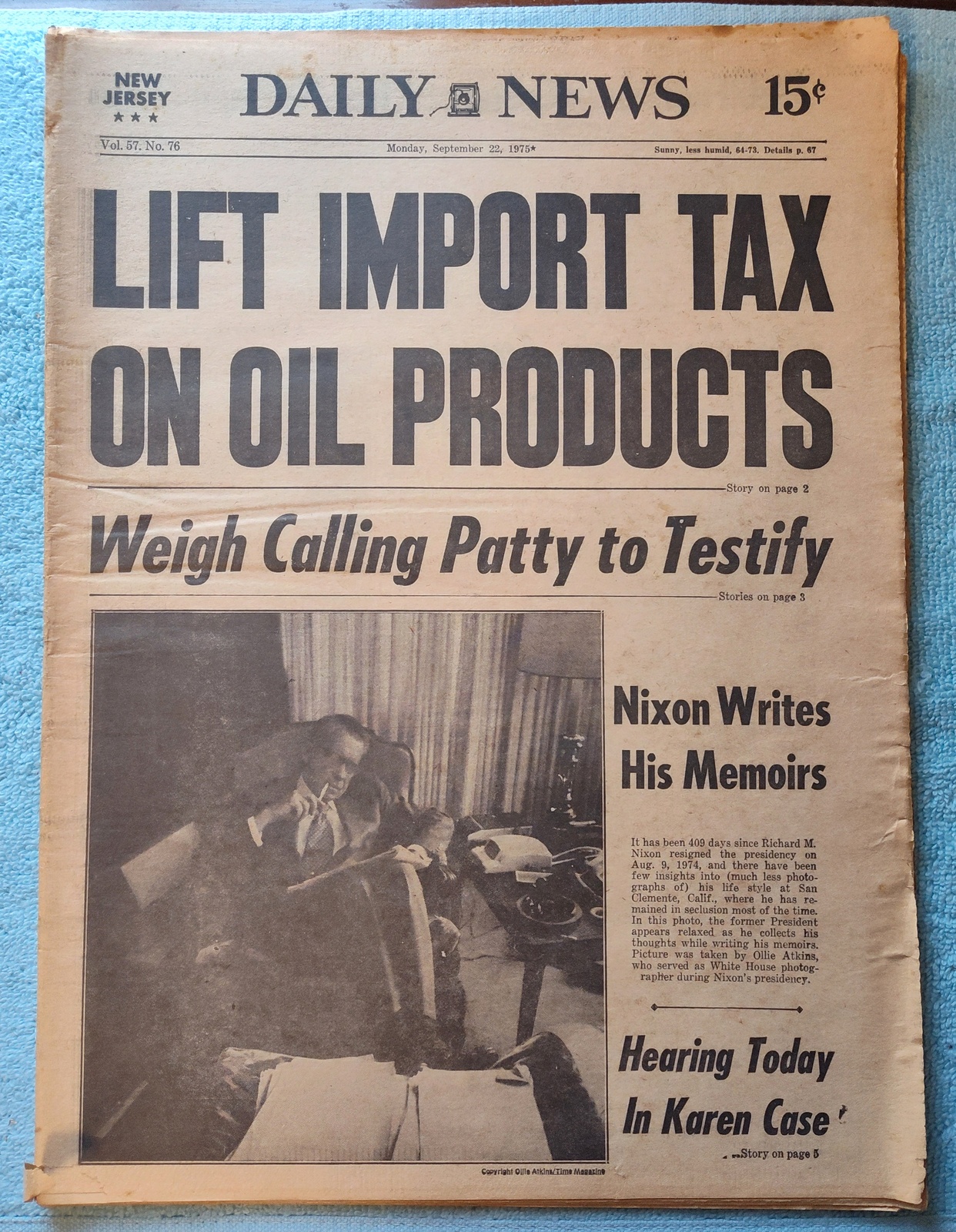 New York Daily News(New Jersey Edition) Monday, September 22, 1975. This old newspaper features on the front page a picture of former president Richard Nixon writing his memoirs. The headline is: ‘Lift Import Tax On Oil Products’ and ‘Weigh Calling Patty to Testify’ What you see in the pictures is what you get.