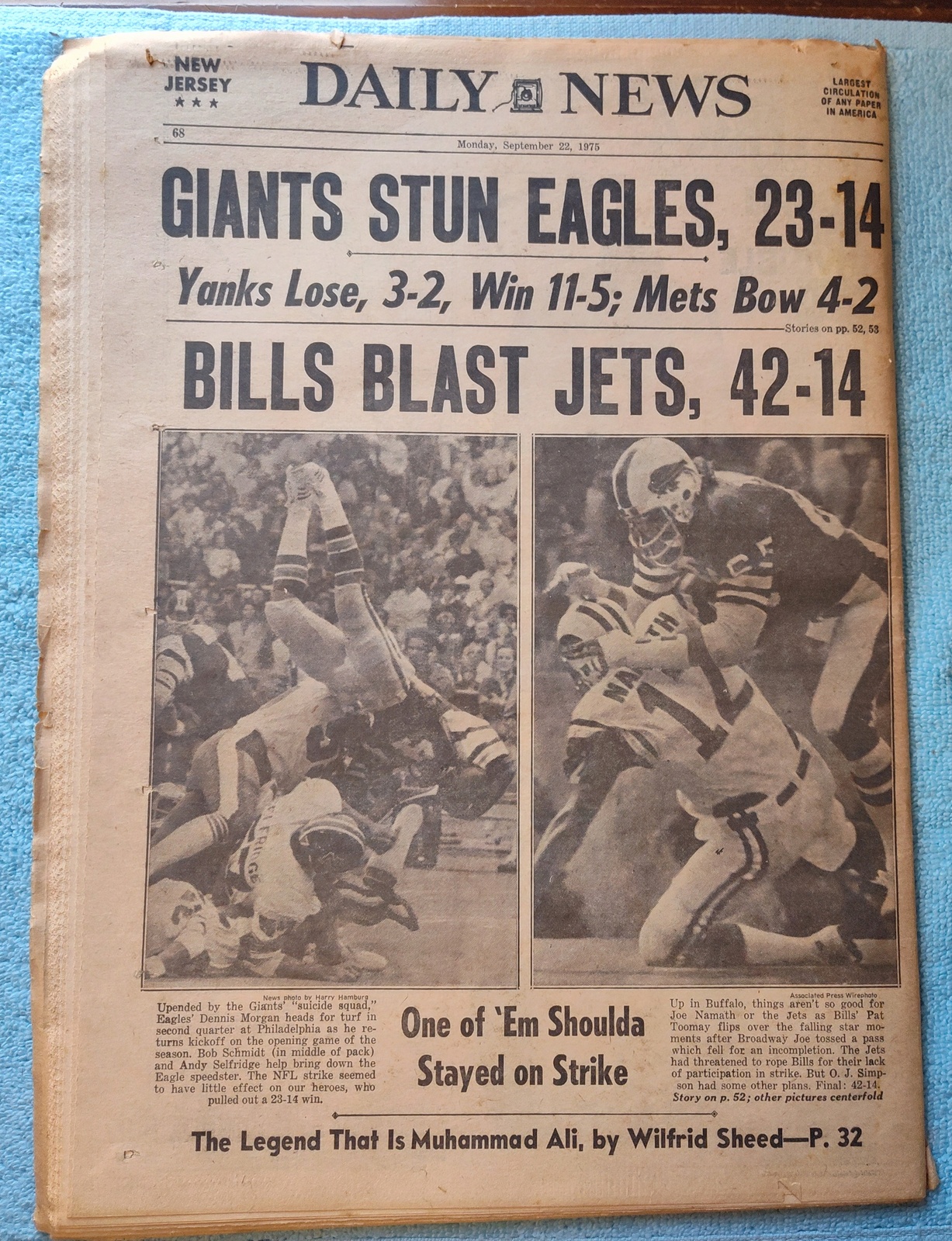 - The back page features pictures of Joe Namath getting his after an incomplete pass and Dennis Morgan with his feet in the air after getting hit while returning the kickoff at the opening game of the season.