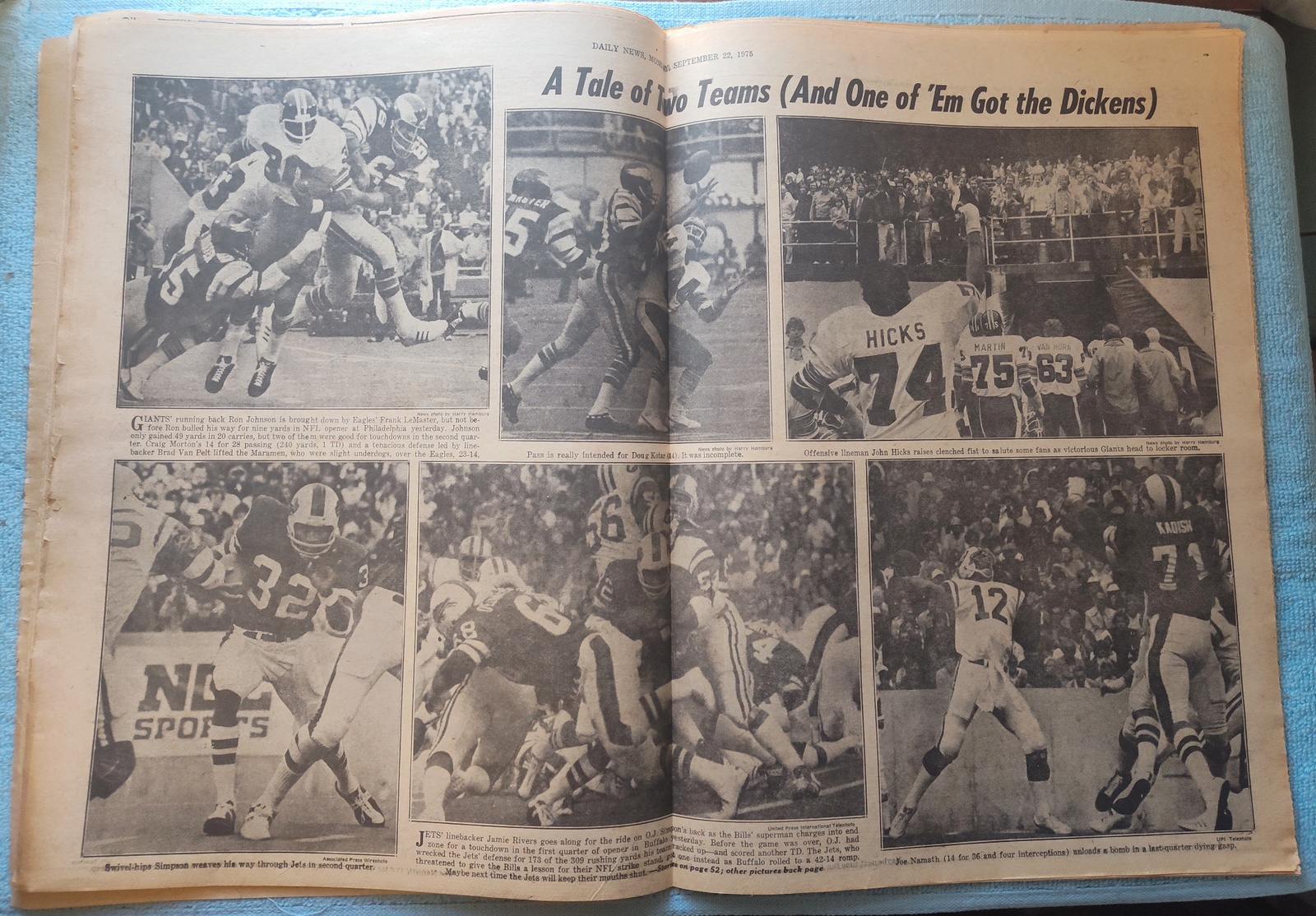 - The centerfold has pictures from the opening games in the professional football season with action shots of OJ Simpson, Ron Johnson, John Hicks, Joe Namath, and more.