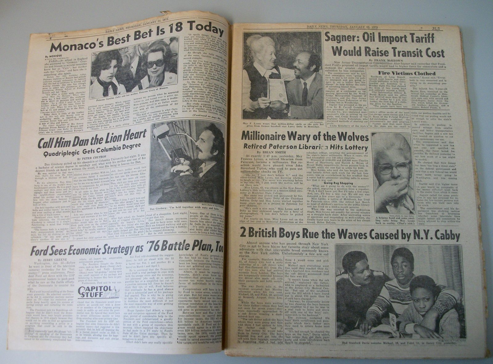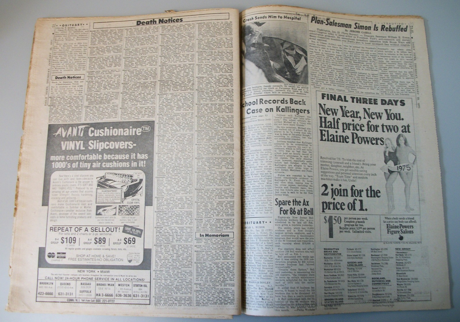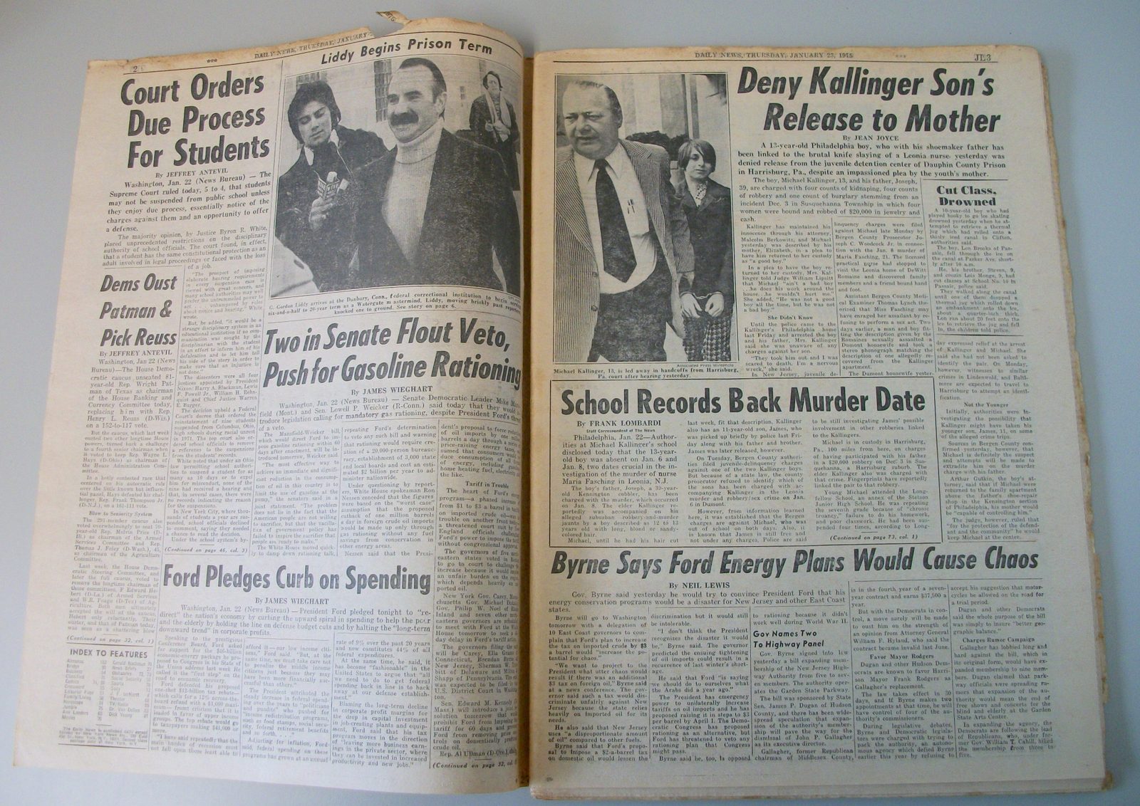New York Daily News – Thursday January 23, 1975 What you see in the pictures is what you get: all 104 pages are included.. There are some minor tears and wear around the edges – LOOK AT THE PICTURES! This is a very interesting old newspaper which features as the front page story: MRS. KALLINGER PLEADS FOR SON – ‘Not a Bad Boy,’ Says Mother – the court denying the release of serial killer Joseph Kallinger’s son, Michael Kallinger (13); Some of the contents include: