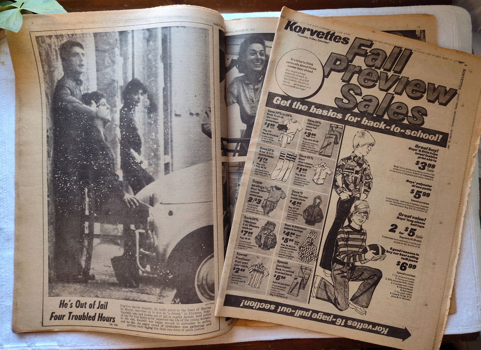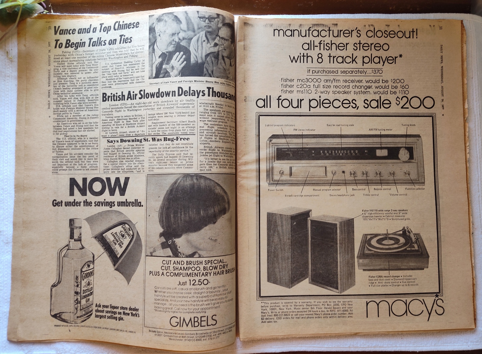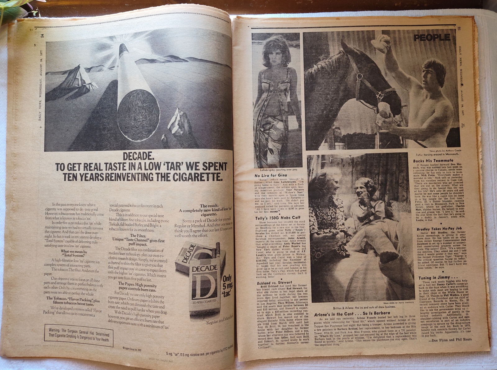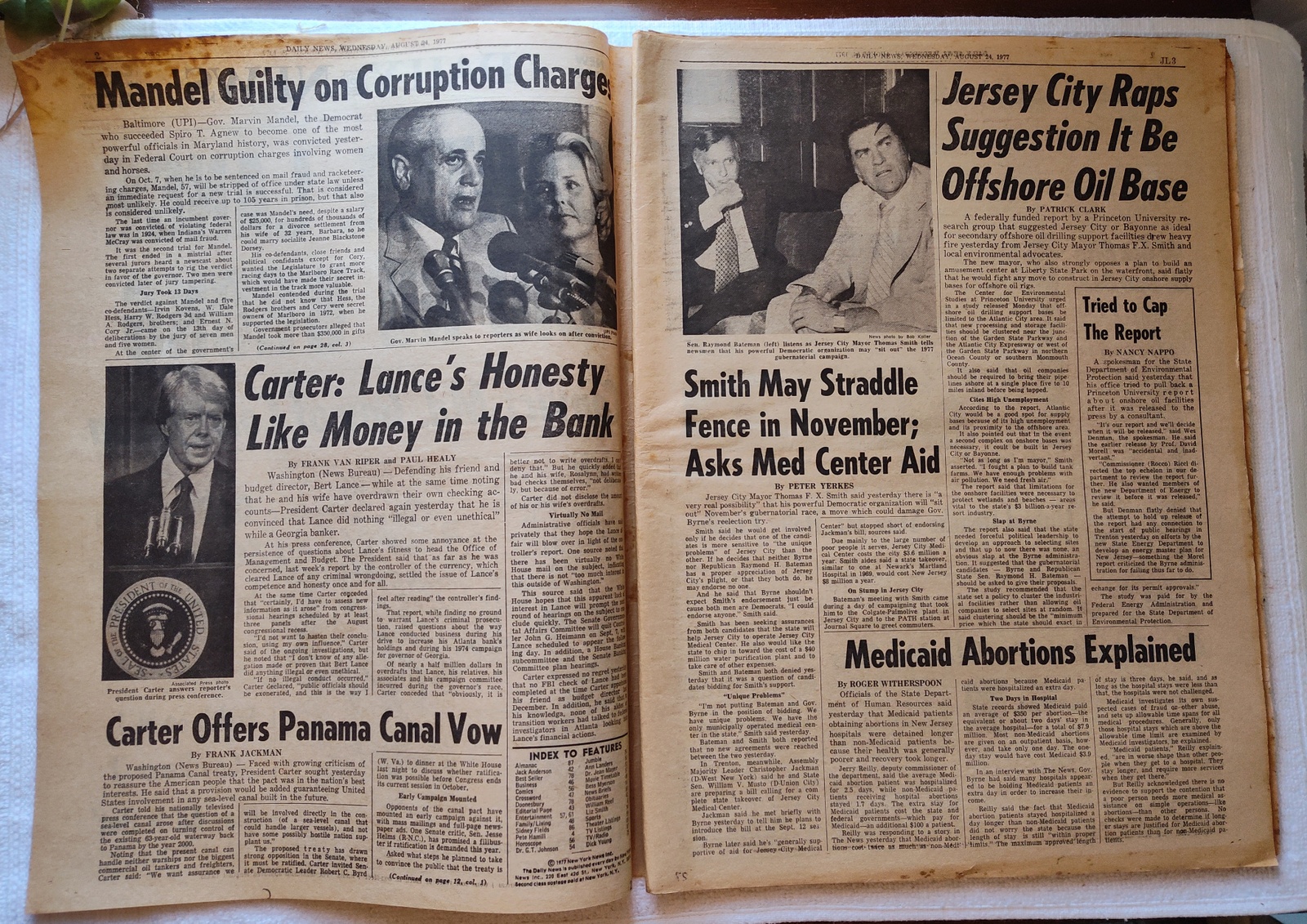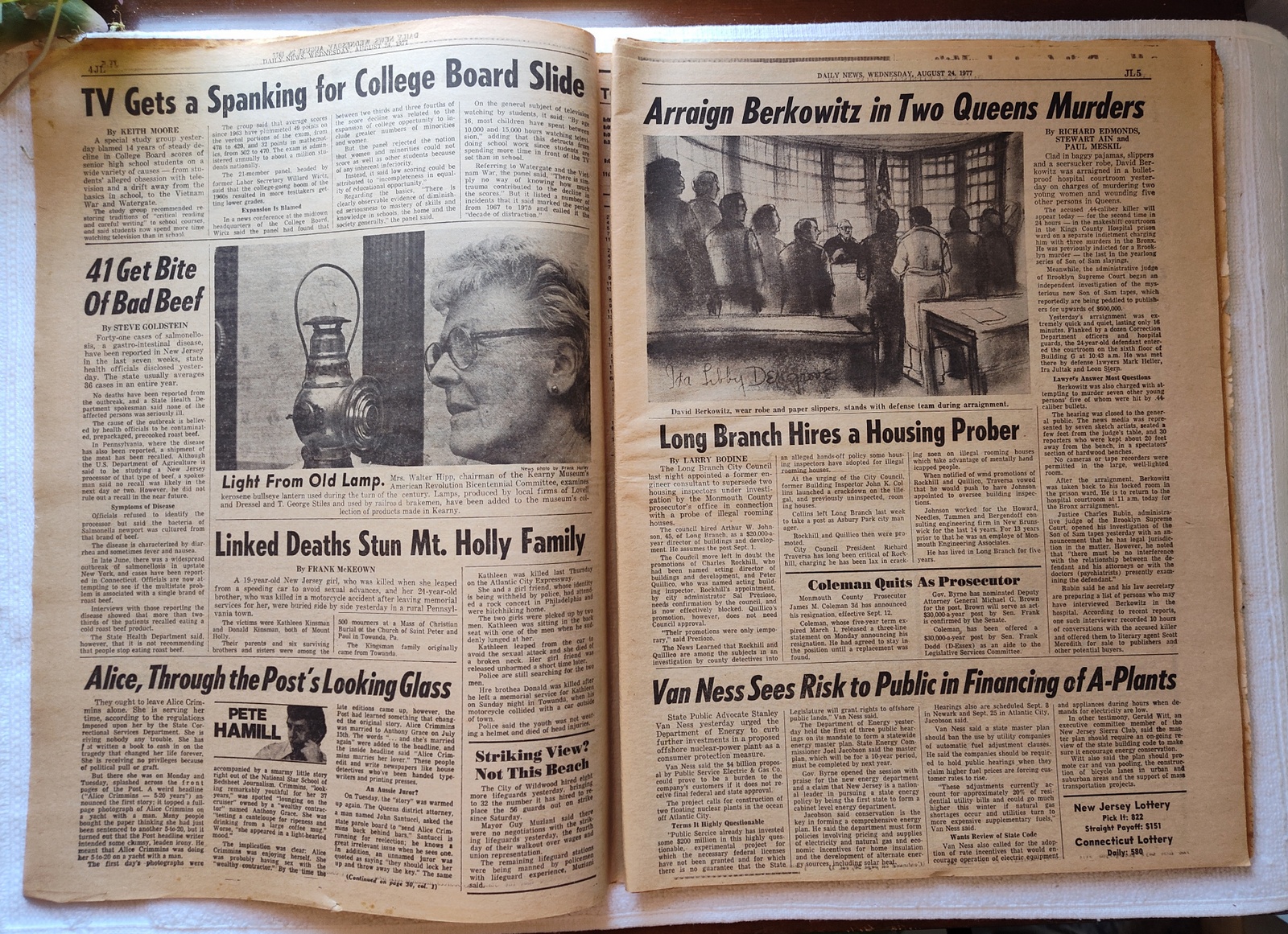 New York Daily News (New Jersey Edition) – Wednesday, August 24, 1977. This old newspaper features on the front page a picture of a drawing of accused .44-caliber killer David Berkowitz in the ‘bulletproof courtroom of Kings County Hospital prison ward’. The headline is: ‘Carter: Lance Did No Wrong’ and ‘Convict Md. Gov of Corruption’ What you see in the pictures is what you get.