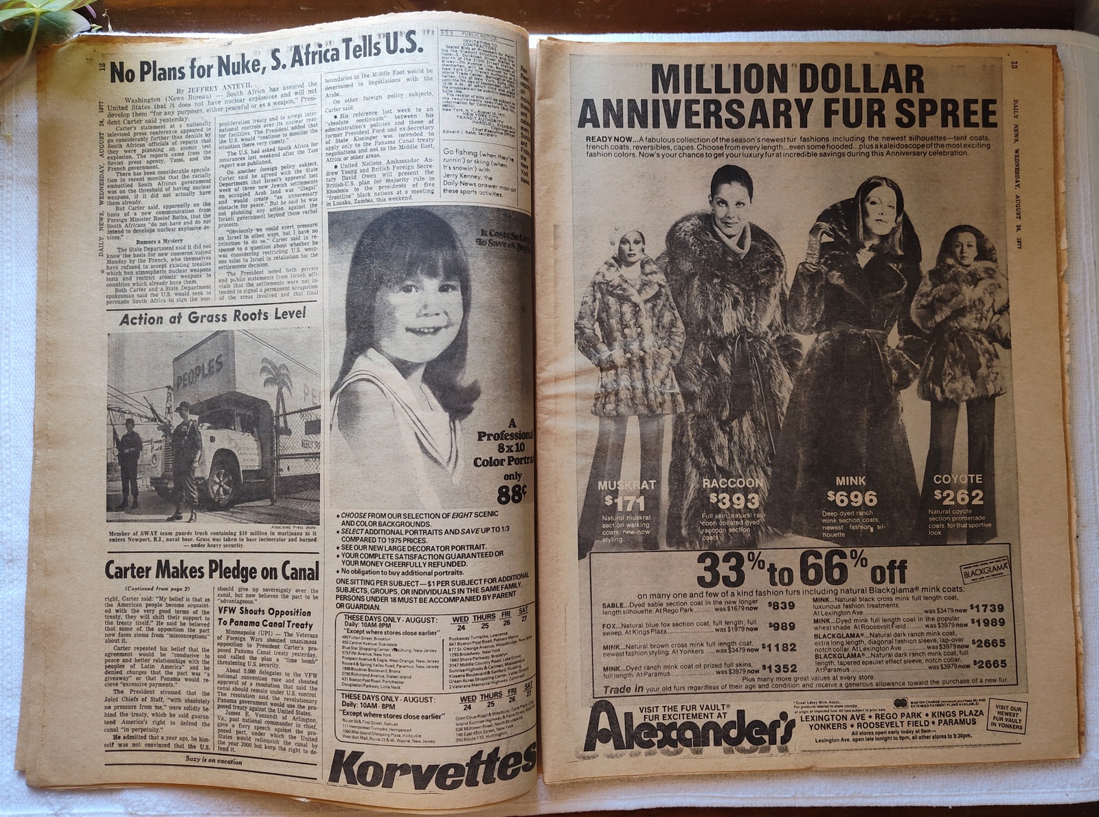 - A full page ad for Fur coats from Alexander’s – Muskrat, Raccoon, Mink, Coyote